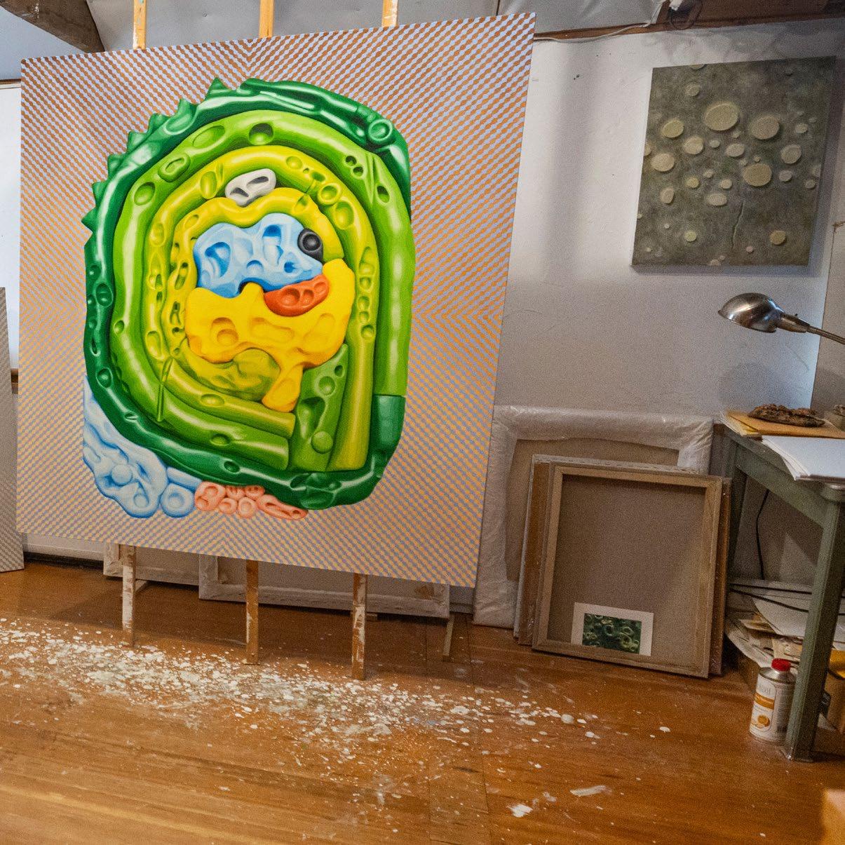 There is also the question of precisely what we are looking at. Is it an unending back-and-forth of scientific connections, odd recollections, or downright formalist musings? The only thing I can resolutely affirm about Ross’s work, and a reason I am so attracted to his paintings, is that even if you try to look at his work in the Frank Stella way of “What you see is what you see,” you will inevitably go down a rabbit hole of new visual discoveries. They are about as manifold as the billions of microbes around us.