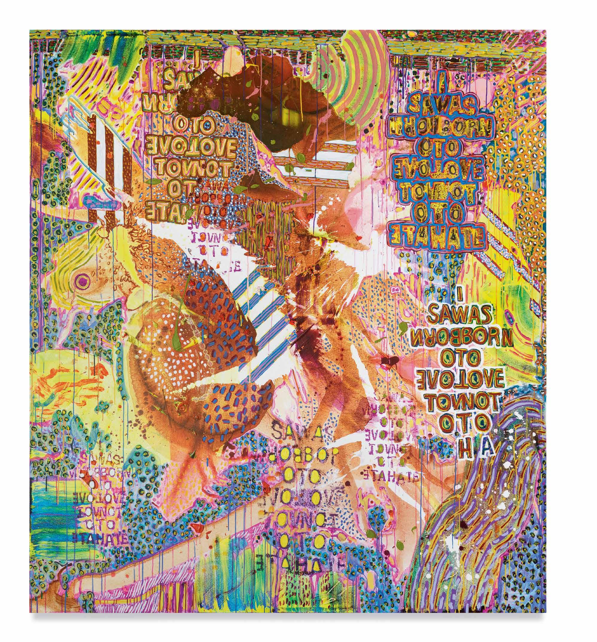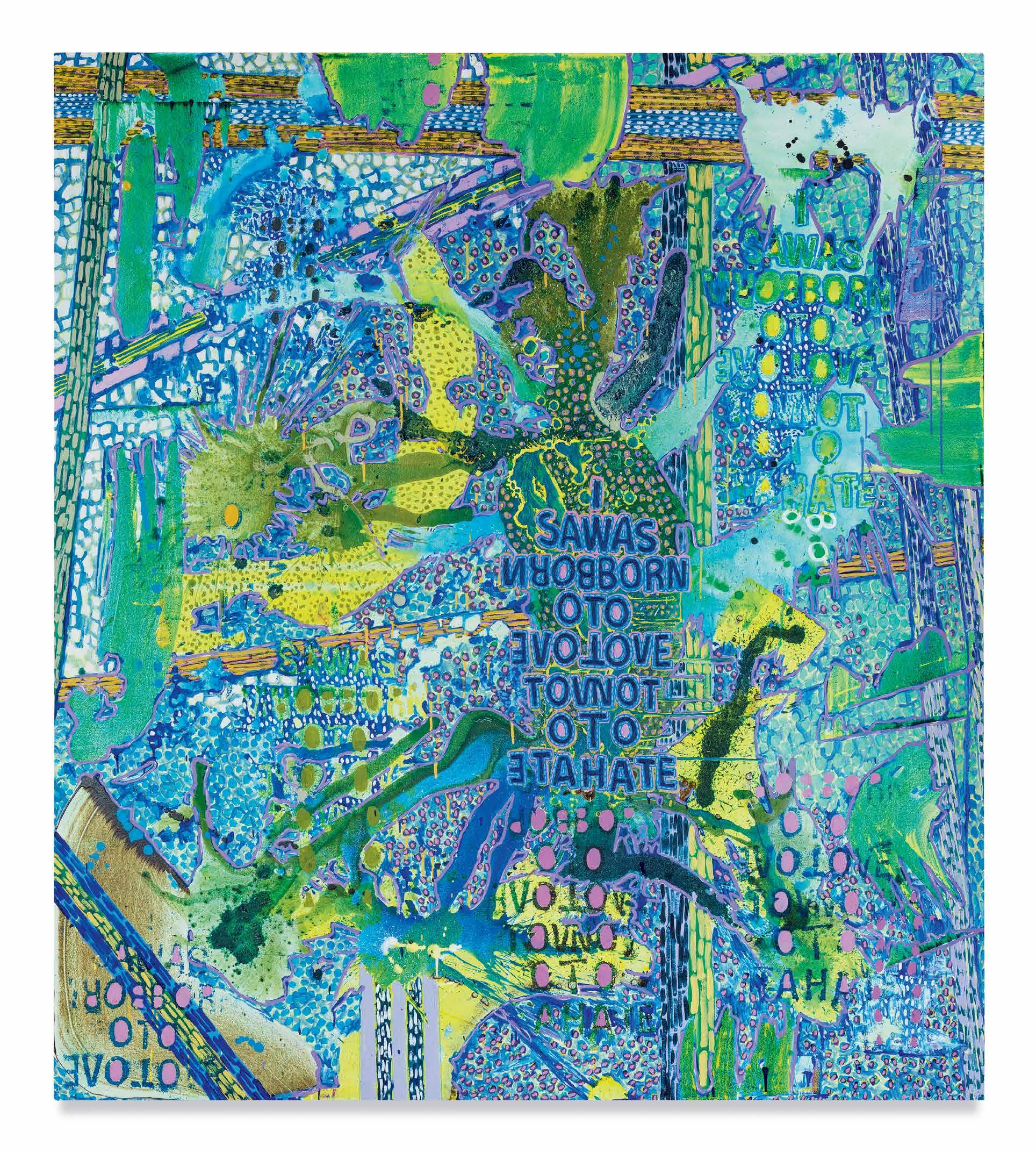 In the studio, Alexandra mentioned that Sophocles’ text is formally “deteriorating” in her most recent compositions. She explained that the mirrored Rorschach-like text “I was born to love, not to hate” was previously applied to her paintings as a wax rubbing on large pieces of paper—a time-consuming process only possible on paper. In order to work on canvas, she now applies it as a silk screen of the original rubbing—conceptually identical, physically more efficient. She also started to use color in addition to black ink for the screen-printed text, a change she adopted during the years she spent in Berlin during the COVID lockdown, experimenting. The text is present in two sizes in the paintings here; we’ll call them small and medium—identical versions in differing scales. The silk-screened text is inherently incidental-looking, not the solid lettering of newspaper print or letterpress, and with variations that come with a by-hand process. Alexandra approaches these prints as monotypes, with no single pull being the same. While she identifies the text as disintegrating, the compositions overall are also seemingly exploding. (The deep application of dots and patterning, the pours and fields of color, the squeegeed ink are indeed dissipating the text in areas, making it less legible and more glyph-like).