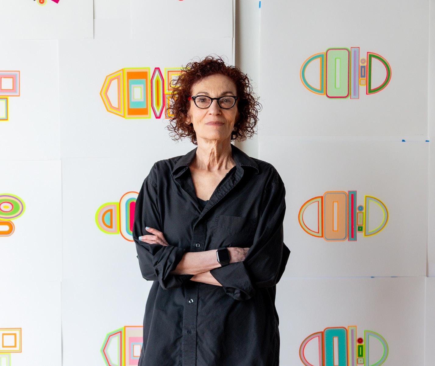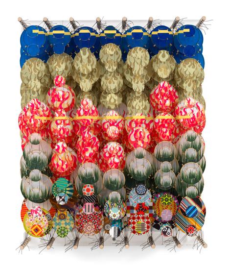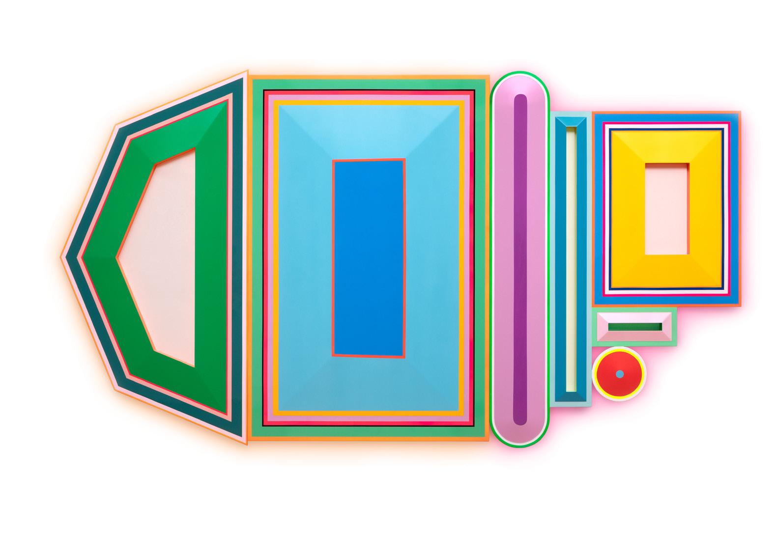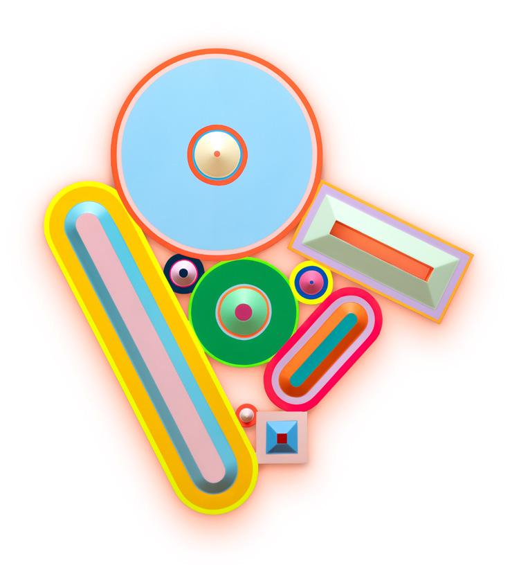 “Beverly Fishman has been thinking about the cure for what ails us for the last 40 years. Her candy-colored constructions exist somewhere between painting, sculpture and bad trip: uppers and downers pulsating in happy, fluorescent hues—a medicine cabinet stocked with remedies for being human... continuing her series of faceted, urethane-shellacked wood forms that protrude from the wall, are a workaround to figuration—about the body but never depicting it, geometric abstraction as a feint to talk about contemporary culture, and what we ingest to cope with it.”