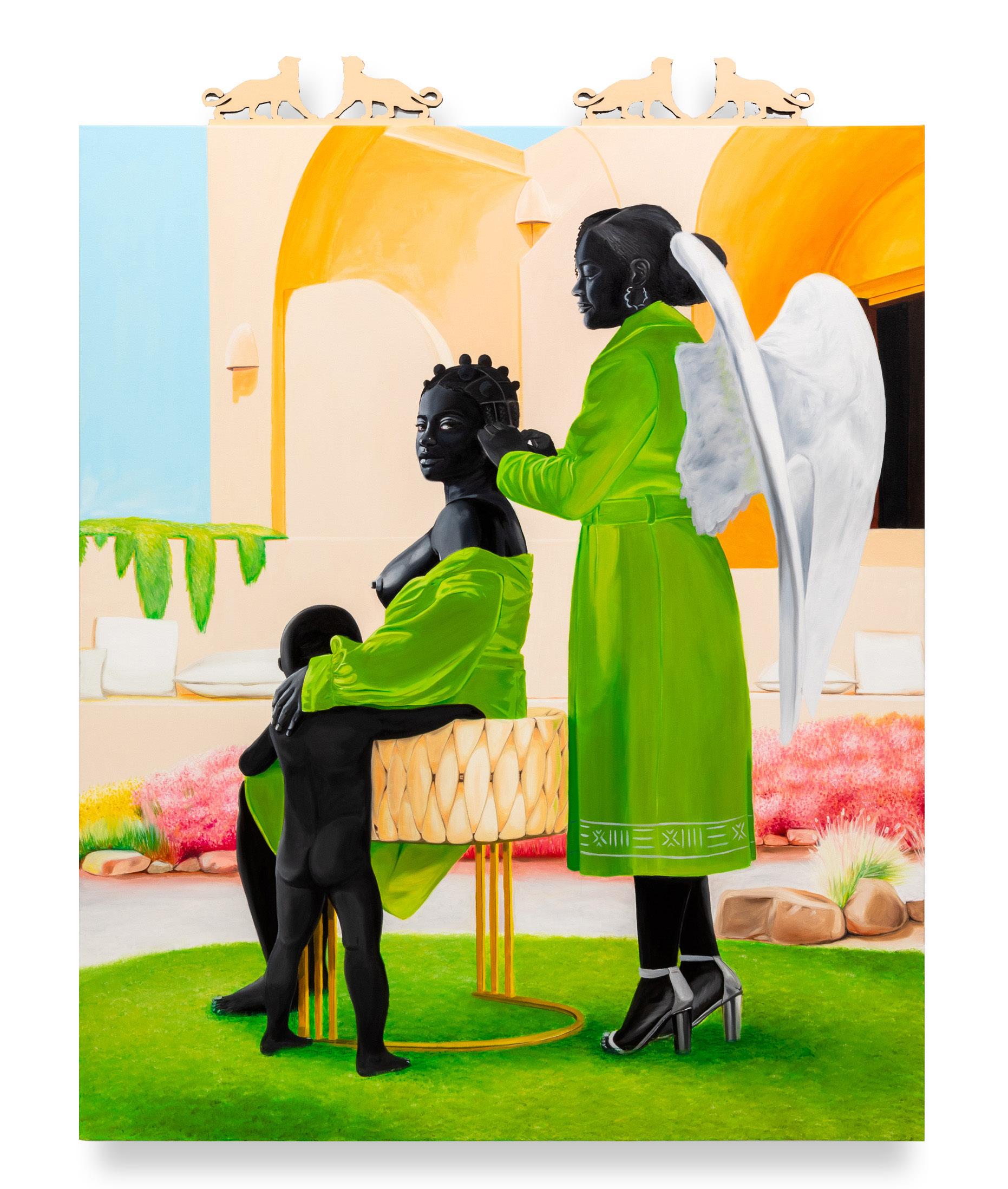 “What distinguishes Egyir’s work is his more minimal backdrops—solid swaths of pastels, whites, and light grays—along with his employment of graphic-design strategies... There’s an official air to these pieces; they borrow the language of approved, canonized types of pictures, those that appear in municipal buildings and houses of worship. Commanding and colorful, regal and playful, Egyir’s paintings are difficult to resist.”