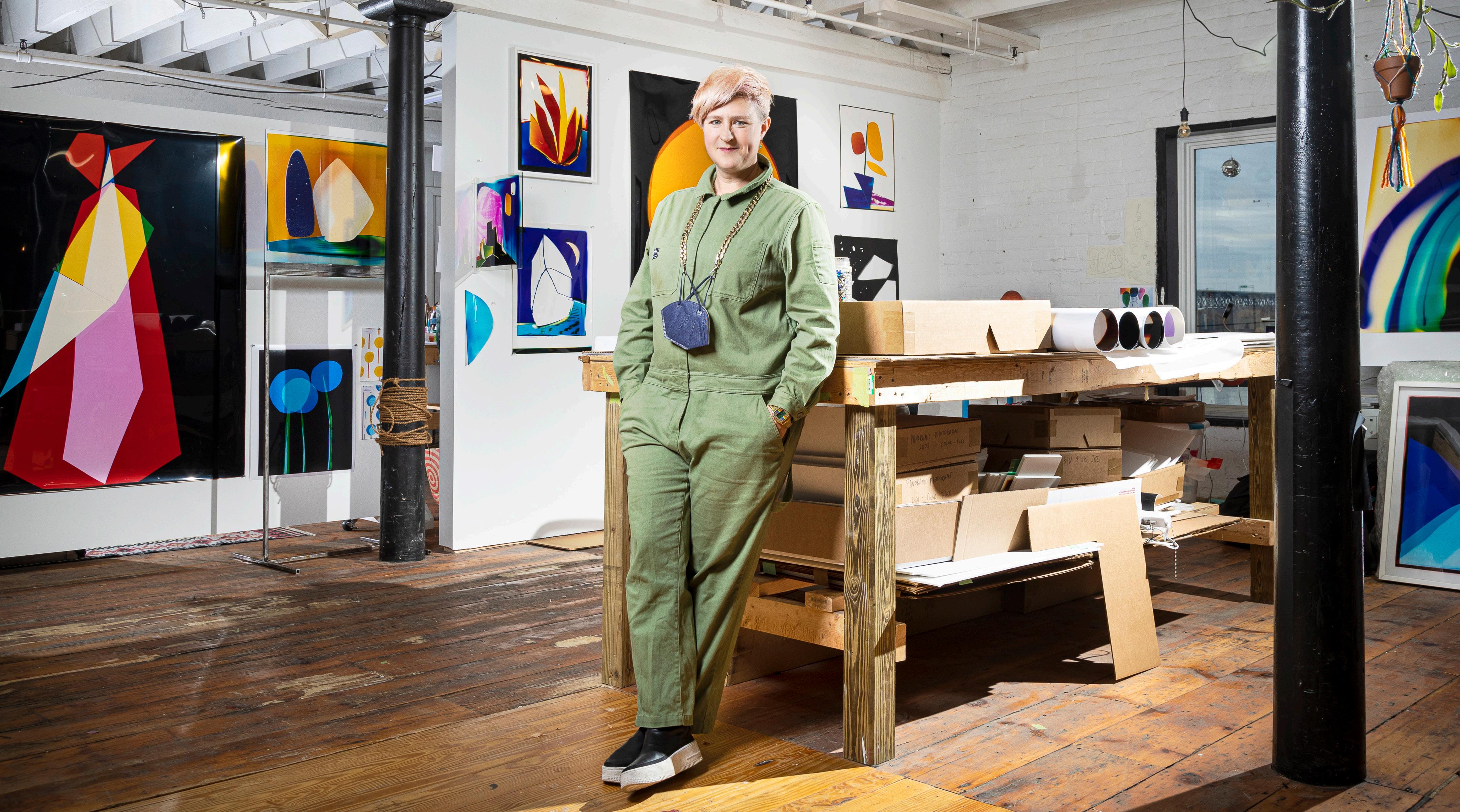 “Fishman’s wizardry is most apparent in the glowing edge of each painting. Super-saturated or fluorescent colors on the sides bounce onto the hanging wall, glowing as if there’s a hidden internal light source. Sometimes, when there is a void in the form, the reflection bathes the wall in a tint, creating the illusion of a painted surface when only reflected color fills the area.”