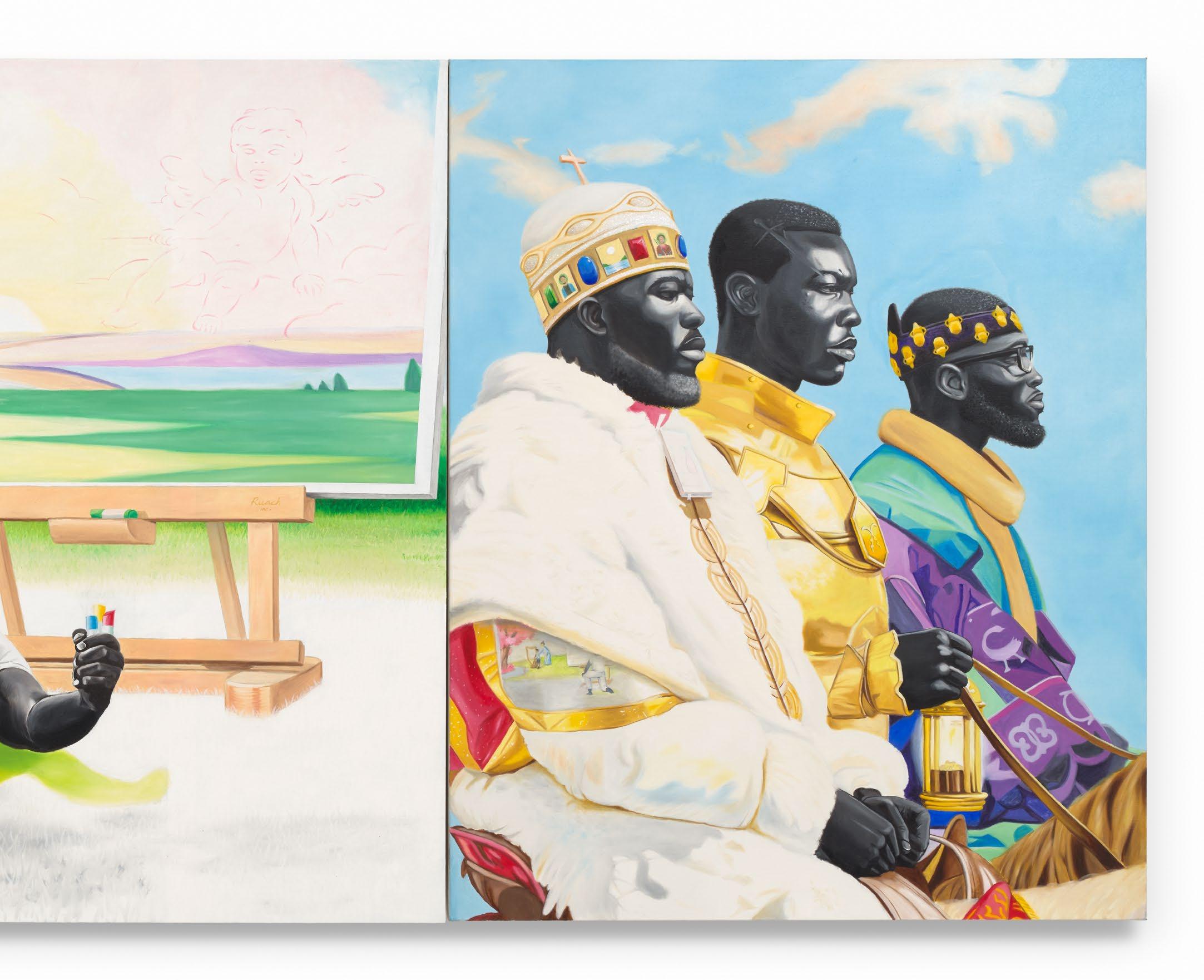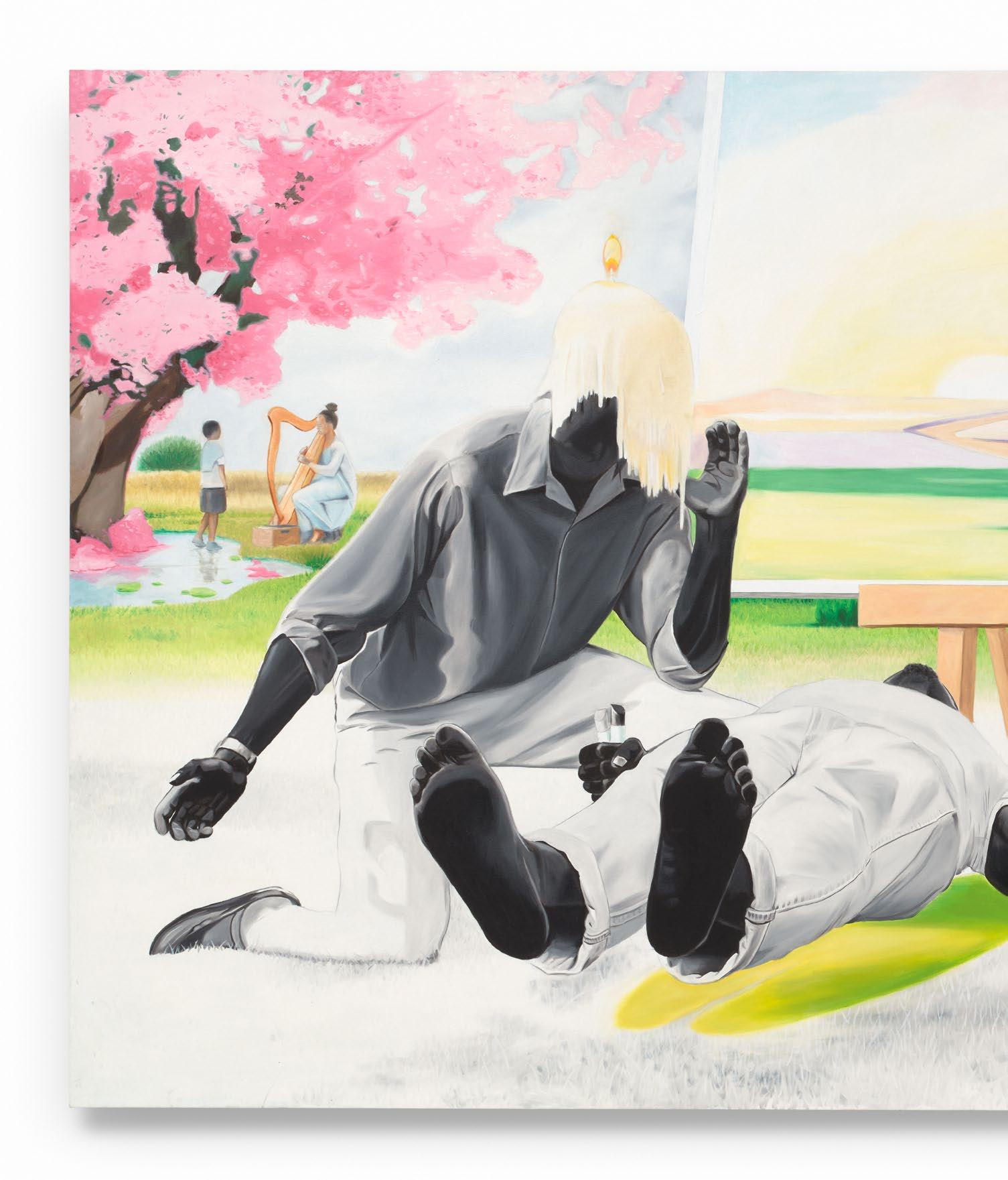 La Gloire de Rois (2024), the largest work in the show, was inspired by one of the artist’s dreams. Its inherent surrealism is all-encompassing, touching on notions of home, place, and sovereignty. (“La Gloire de Rois,” it’s worth noting, is French for “The Glory of Kings.”) In the foreground of the work, a Black male subject levitates on his back, his features indecipherable to the viewer. All we can see is that he is floating outdoors, just inches above a field of some kind, a canvas nestled on an easel right behind him, oil paint sticks in hand, while a second subject kneels before him—his face completely covered by a lit candle that is dripping wax. The second subject serves as a spiritual paradigm—seemingly breathing life, and imagination, back into the initial subject. It’s important to note, though, that these subjects are one and the same, or two versions of a single person; Egyir has a habit of multiplying his subjects within each canvas, with complementary, or at times contrasting, situations shaping their identities. Yet the viewer can’t overlook the use of landscape. A burst of vibrant color decorates the background on the left-hand side: There is a cherry tree in full bloom, pink and abundant, sheltering the green grass below. In this section, a woman, immersed in the scene before her, plays a harp, while a young boy stands beside her, looking on. These scenes unfold in parallel in the work, reinforcing the artist’s pull between two cultures. With migration and empathy—or relating to others—at the forefront of the painting, Egyir multiplies his subjects to craft the composition, weaving together stories of antagonists and protagonists, placing each character within the space, and deconstructing the very notion of colonialism. The artist doesn’t hesitate to play with borders or textures, underscoring the impact of documentation in all forms and embellishing his canvases at will.