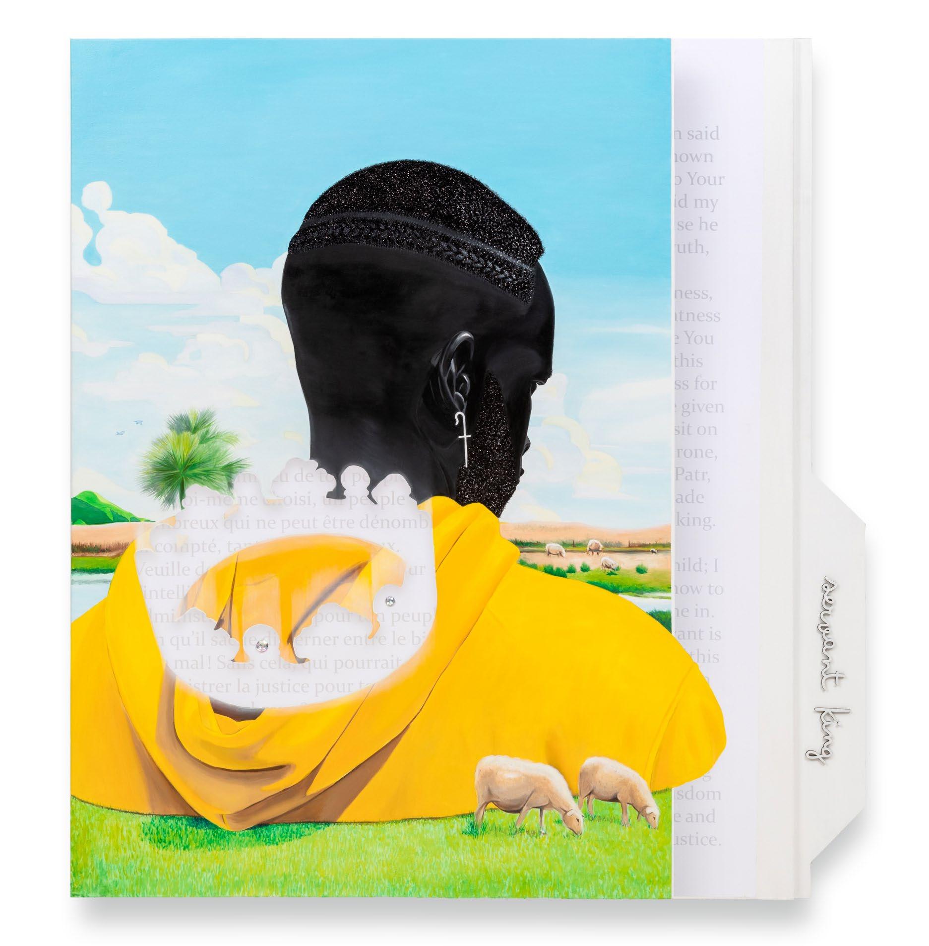 Egyir’s bright color palette is uniquely his, with each work enlivened through colors, through ideas—through the careful application of glitter, even—and ultimately through a desire to craft stories from dreams. Each rich yellow, oceanic blue, or deep green is associated with content the artist has consumed: music, literature, sermons, West African folklore, or, of course, internal dreamscapes. Egyir thinks about the colors that appear in his dreams, allowing his memories of the moment to morph into new concepts entirely; his color selection is the driver behind this, helping each scene to come alive. The resulting canvases are poetic—and not only because the artist has infused poetry, written in English, Twi, French, and Swahili, into four of the works. These four paintings are on wooden panels that open up like a graphic novel or journal. Fusing the impact of visual iconography with that of literature, the artist has adorned these canvases with stories, or special narratives, decorating his paintings with paraphrased quotes that inspire him, and he has sculpted them into something new. In My Knight and Shield (2024), he writes: What promise holds both near and wide / A home where dreams and truth abide? / With hands entwined, they shape their fate / In sovereign lands, they liberate. Here again, Egyir weaves liberation, legacy, and nobility into his paintings; in the work, a knight in shining armor holds a small child on one side, while on the other, a second subject wears a blood-red robe, standing on moss-covered rocks as he looks out at the sea before him, with the initial duo’s silhouette subtly integrated into the canvas. The impact is profound.