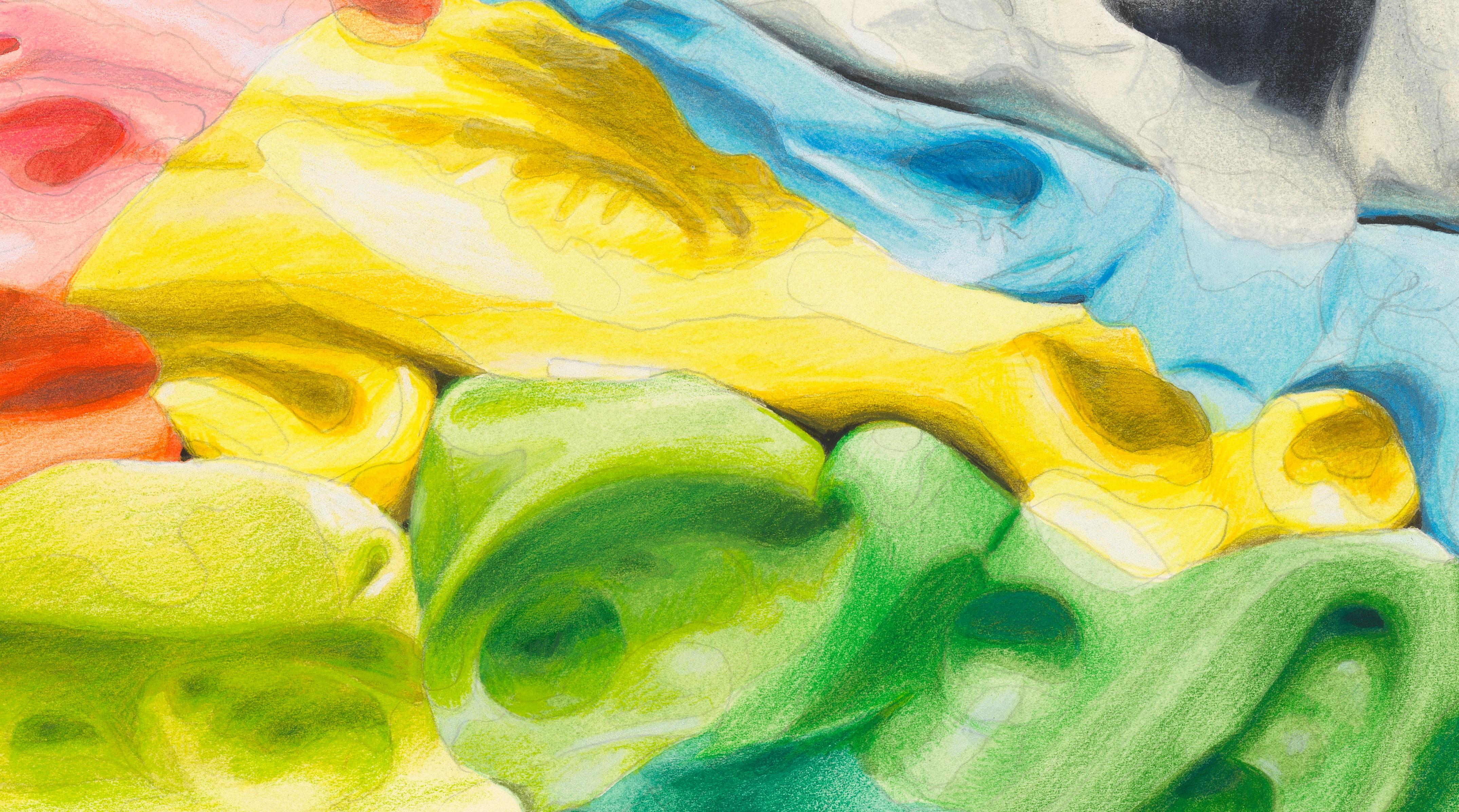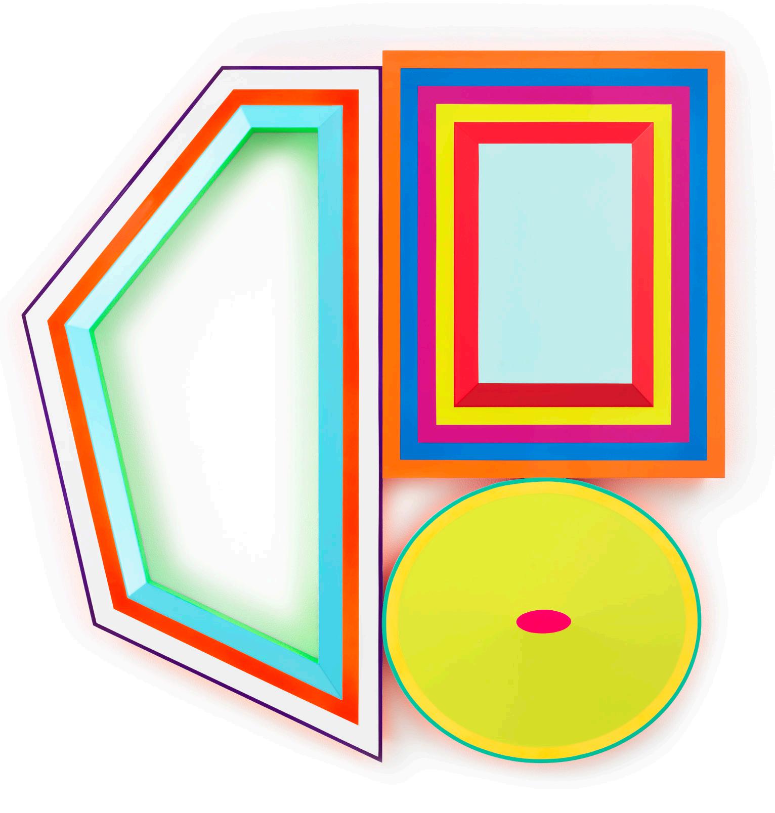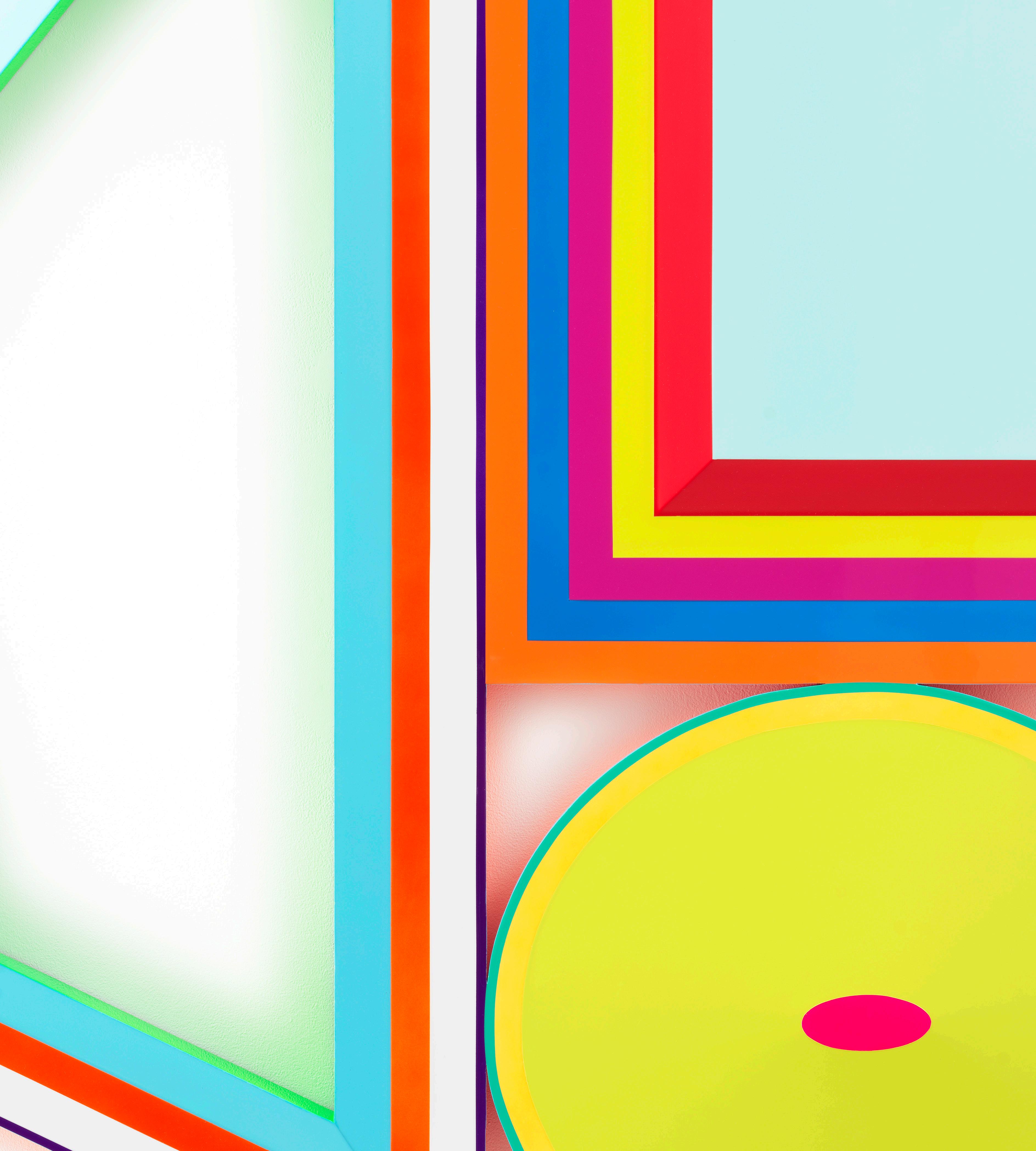 “As Fishman’s paintings deconstruct pill shapes, her works’ fluorescent colors—used in safety applications to ensure visibility—cling to the eye. Glaring hues remain ghostlike on the retina despite the equanimity of cool geometric shapes and the glassy edging of neutral gray-white or black fields. ‘By harmonizing with the immaculate surfaces of the commodities around it, we repress thoughts of our own decline. Color draws and excites us—it evokes spirituality and transcendence—but it also suggests death and despair.’”