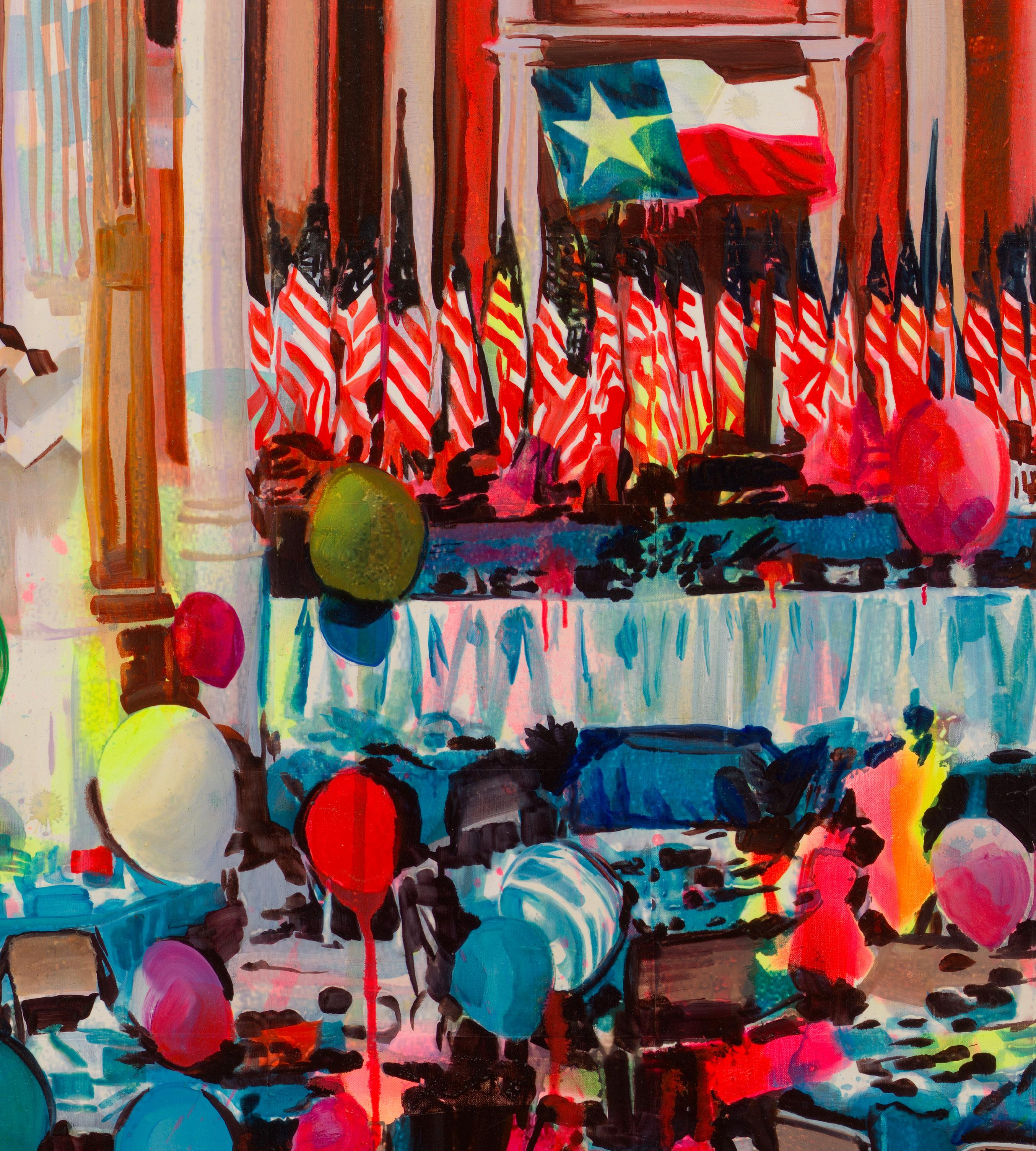Acrylic, spray paint, photo transfer, and oil on canvas