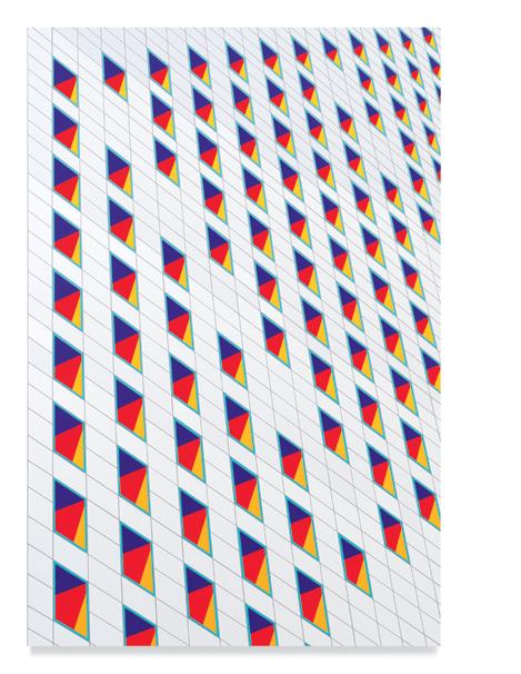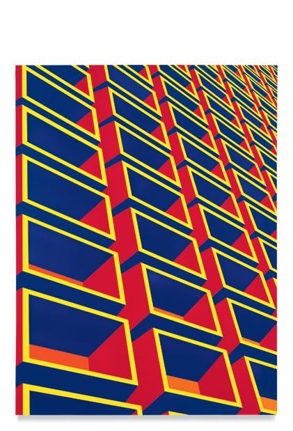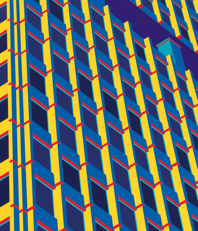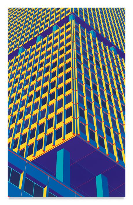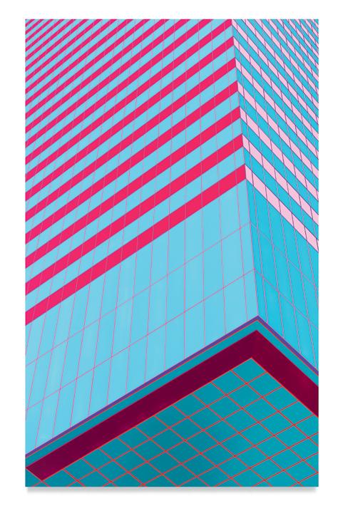 It is within this context of the streets being claimed and reclaimed that Daniel Rich began, in autumn 2021, the Flat Earth series. This new body of work consists of twelve paintings in highly saturated colors that meticulously show, from the viewpoint of the street, oblique angles of modernist buildings in midtown Manhattan. Titled after a specific address, each painting seems convincingly real, as a sense of perspective draws the eye into space, as though we are seeing a representation of the semi-abstract exterior structure of, for example, 531 Madison Avenue or 29 East 46th Street as it appears in life. The paintings are heavily cropped—we never see a