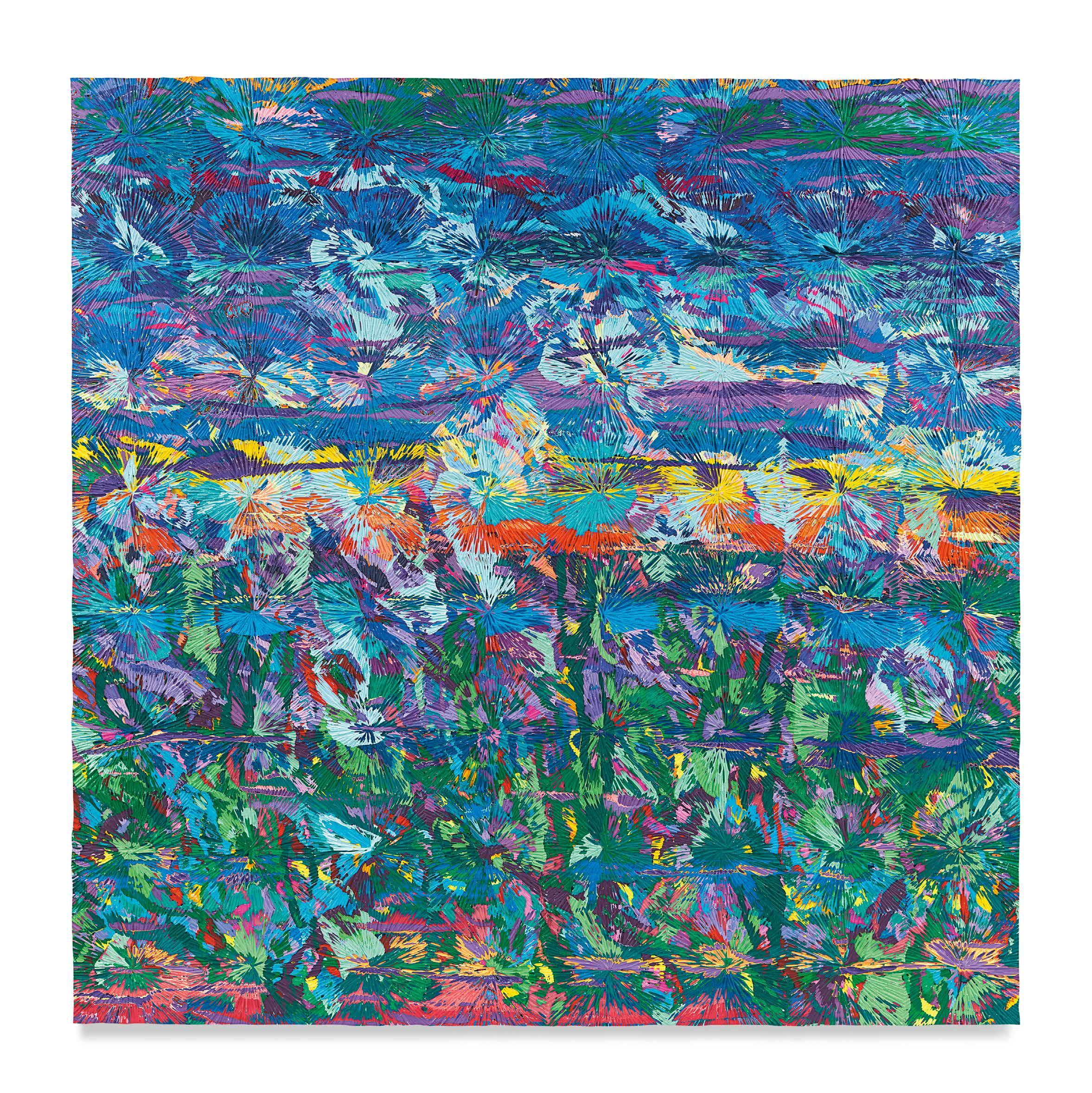 The acrylic paint dries through evaporation. Though itās watersoluble to begin, once it dries it will be waterproof and permanent. Sometimes a layer of paint covers the entire surface, but sometimes color is plo ed out across the surface in a way that begins to conjure an image. Before they move down the line, the most recent paintings are some kind of landscapes, more representational than recent works, and the uncertainty brings some discomfort for the artist. Itās this personal process that ma ers the most.