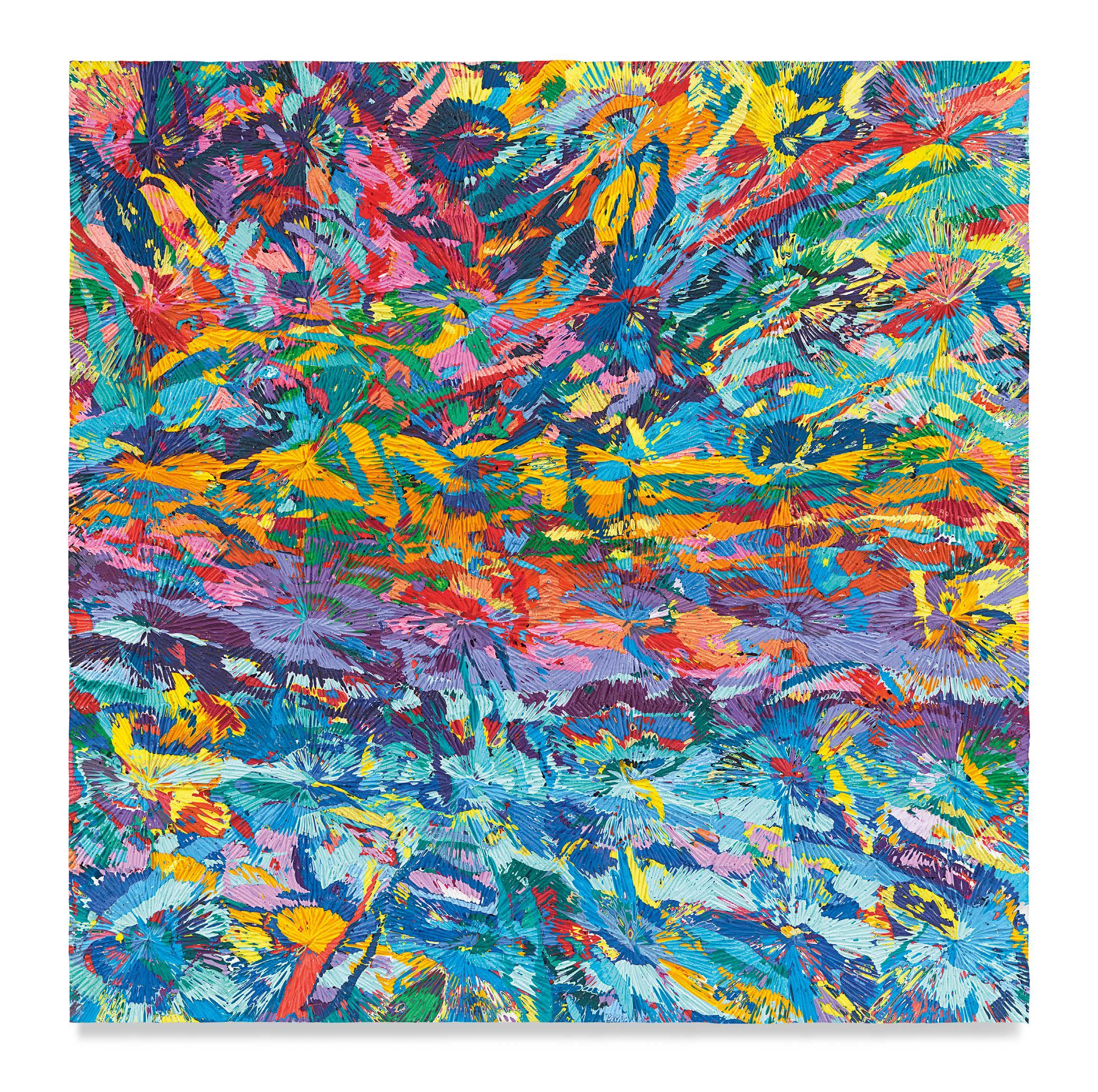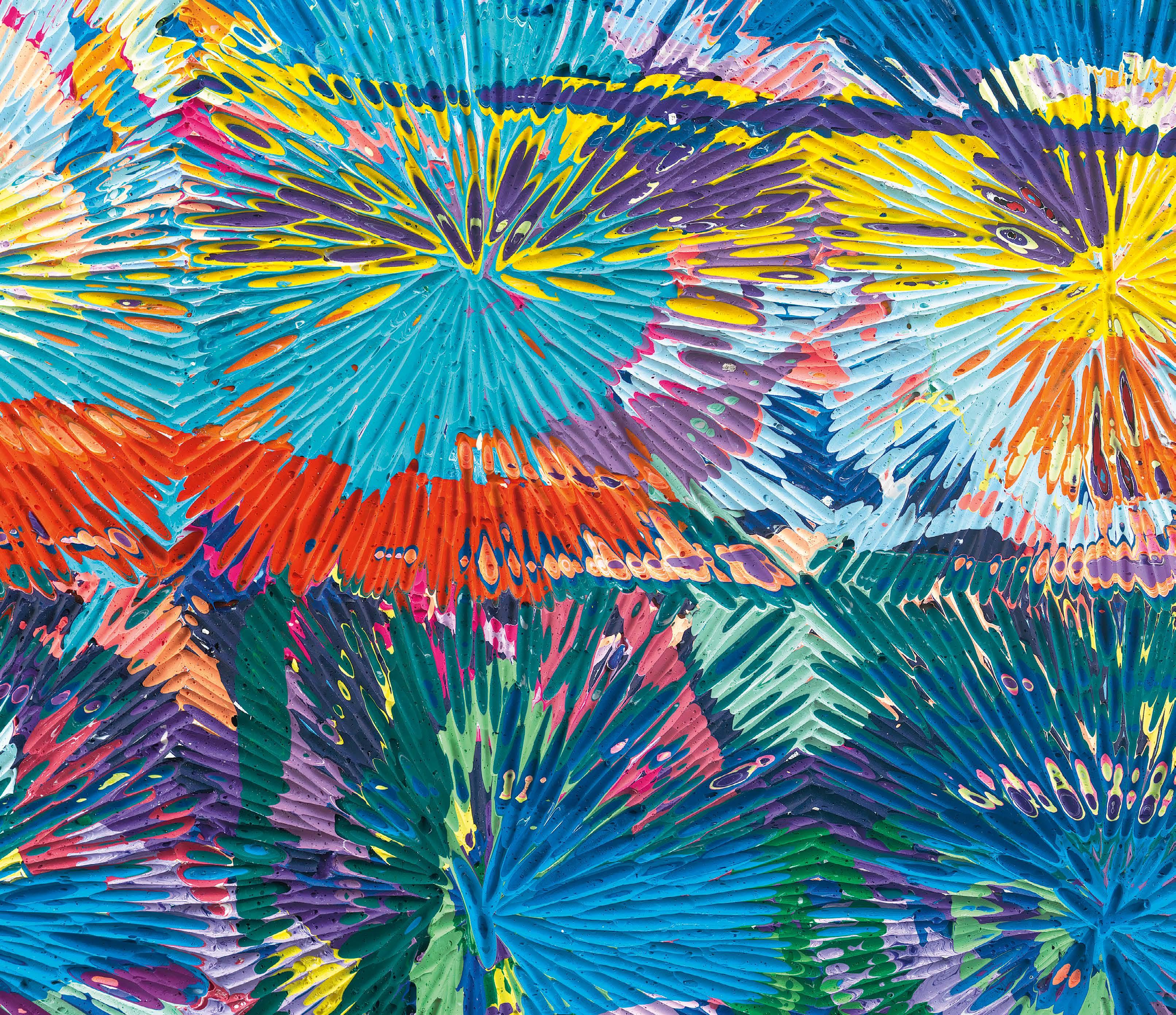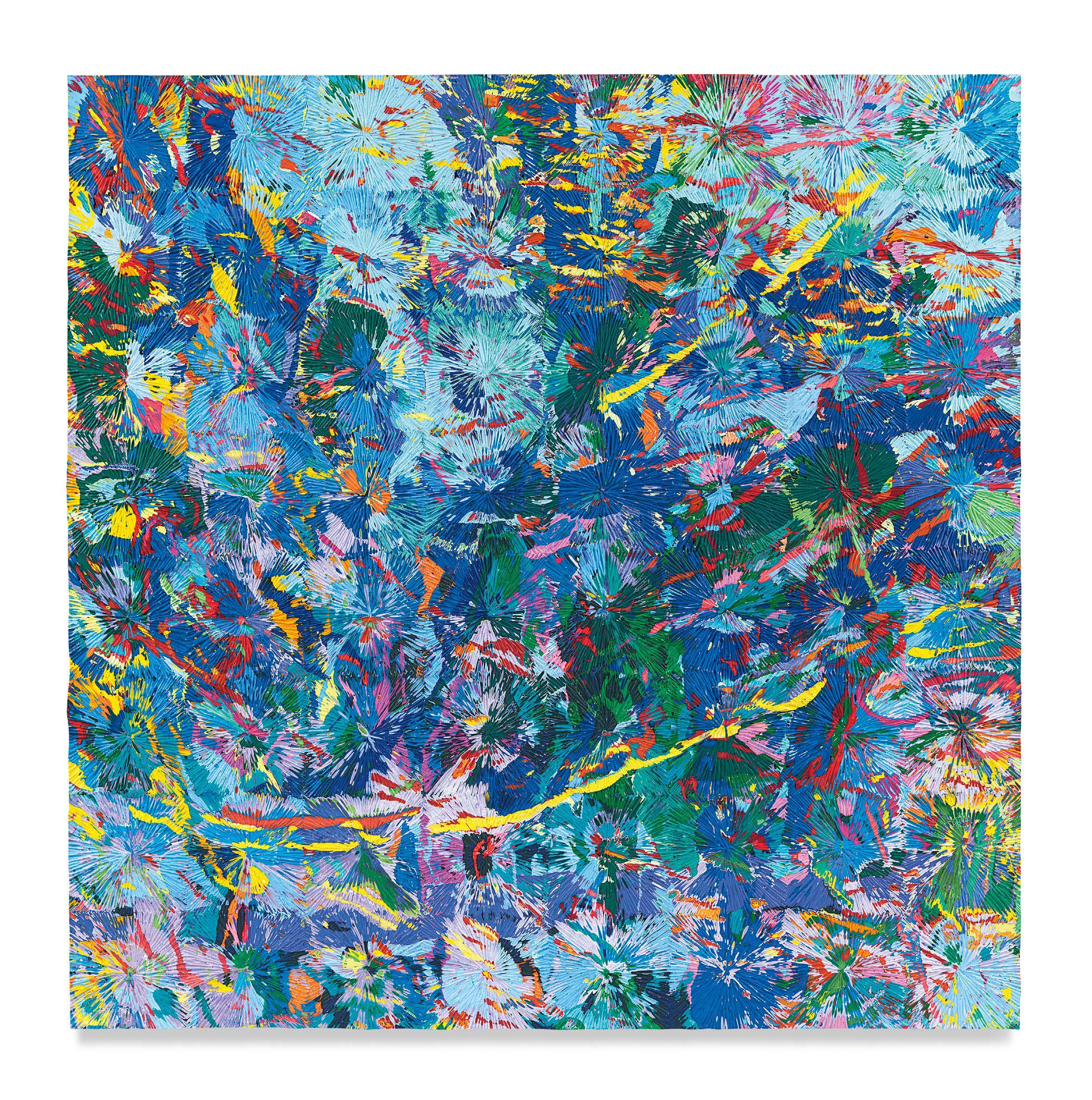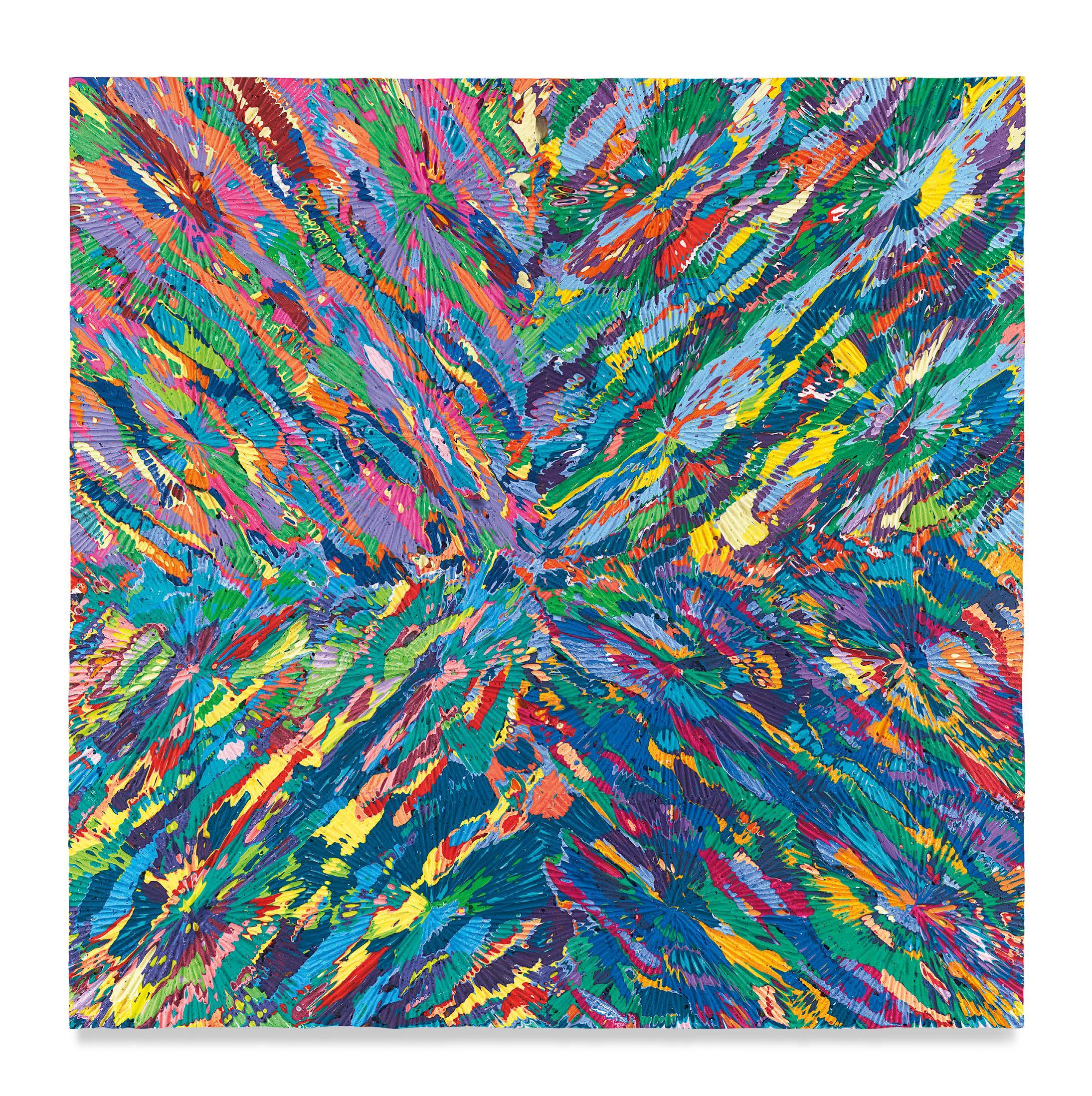 In a version of Martin Creedās performance Words and Music, he asks if we have too many words or not enough. Surely itās more about how we use them, he suggests, and considers something like a chord in music, but for spoken words. If instruments or choirs can sing three or more notes at once, creating a new kind of layered, complex note, could we do that in our speech with words, he wonders. What changes would be required in my brain and voicebox in order to say the right three words at the same time? To stack them up simultaneously instead of having to choose one at a time, ordering and reordering them to try to give them meaning? David Allan Peters cuts into layers of paint, creating the illusion that the colors are nesting, that they hold each other like rings of a tree. Dozens of colors try to sing out at once.