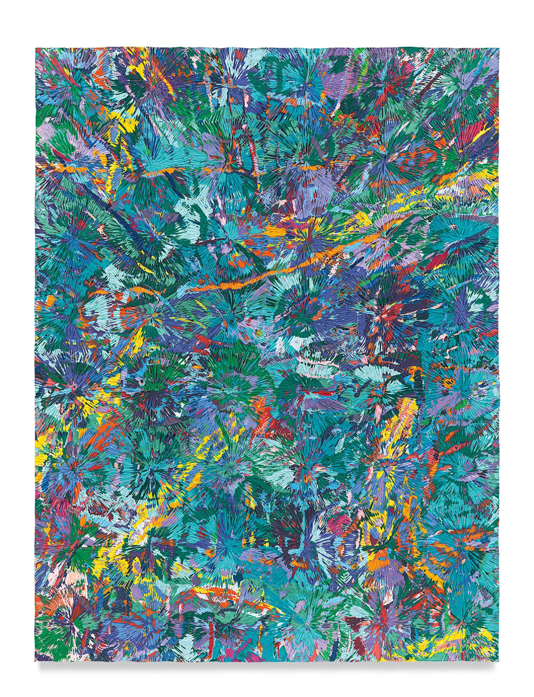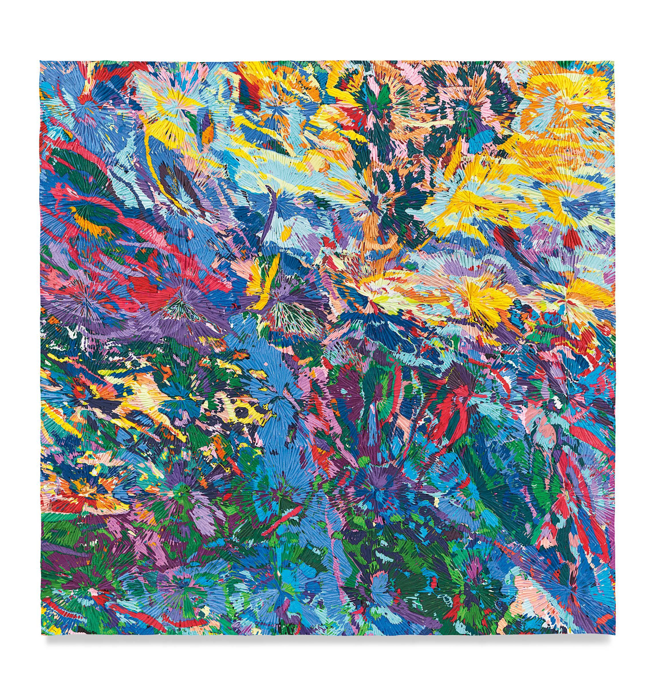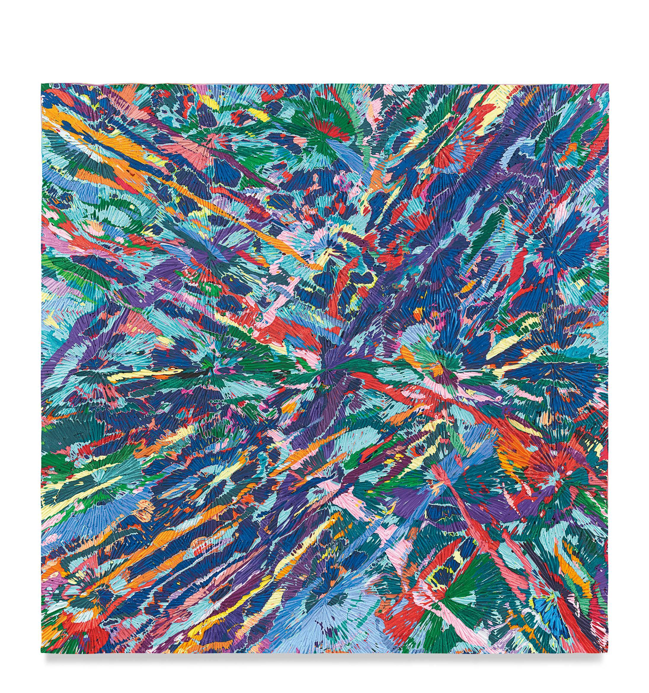 In a version of Martin Creedās performance Words and Music, he asks if we have too many words or not enough. Surely itās more about how we use them, he suggests, and considers something like a chord in music, but for spoken words. If instruments or choirs can sing three or more notes at once, creating a new kind of layered, complex note, could we do that in our speech with words, he wonders. What changes would be required in my brain and voicebox in order to say the right three words at the same time? To stack them up simultaneously instead of having to choose one at a time, ordering and reordering them to try to give them meaning? David Allan Peters cuts into layers of paint, creating the illusion that the colors are nesting, that they hold each other like rings of a tree. Dozens of colors try to sing out at once.