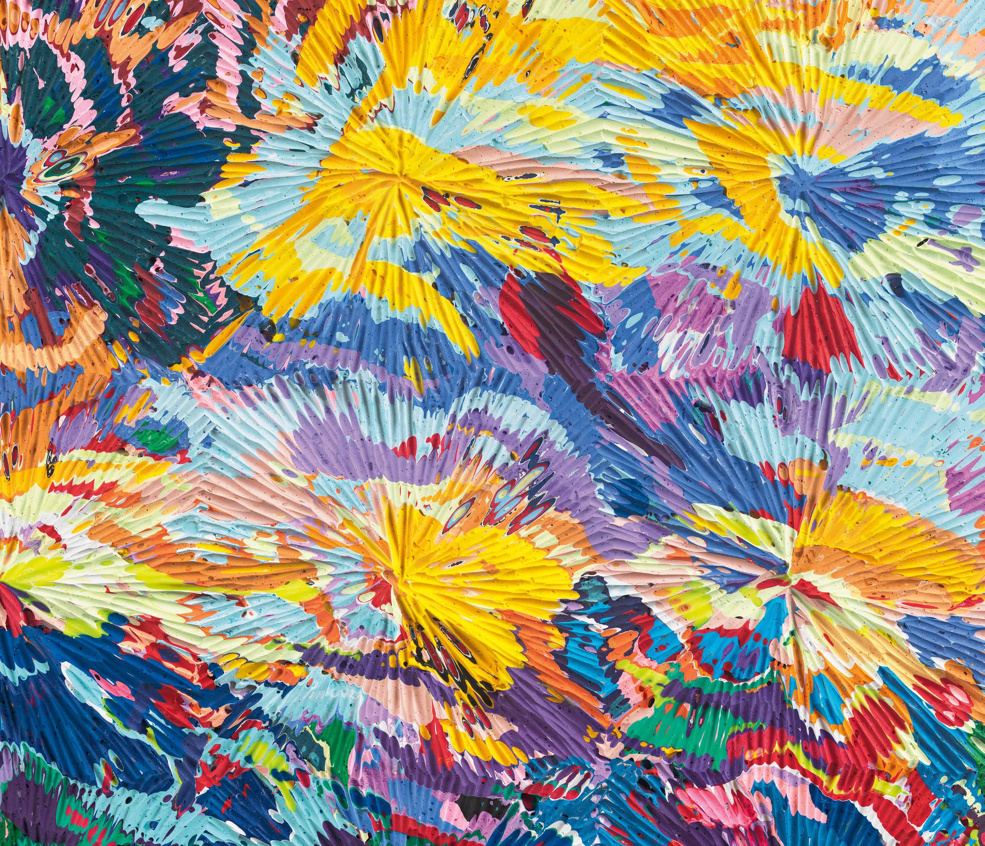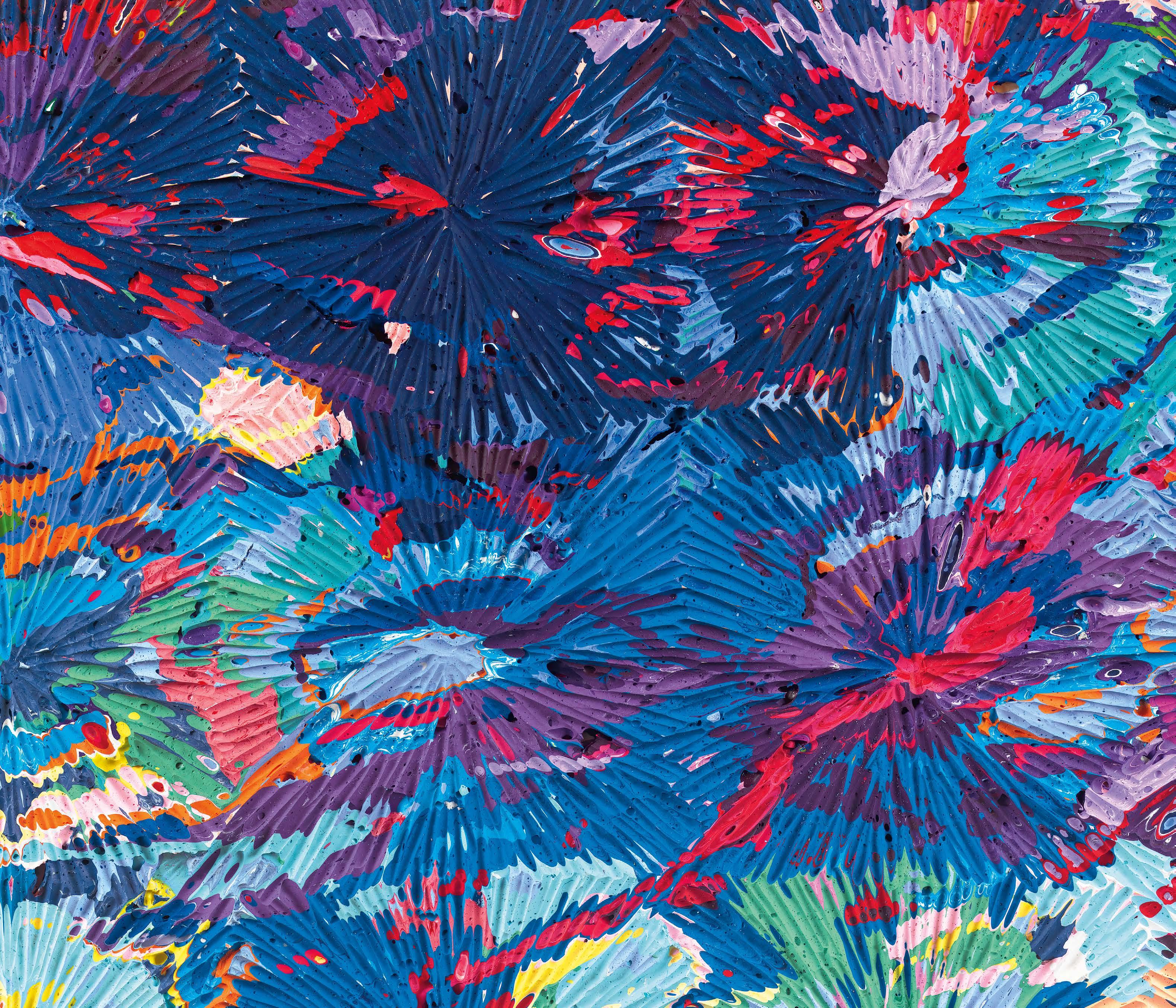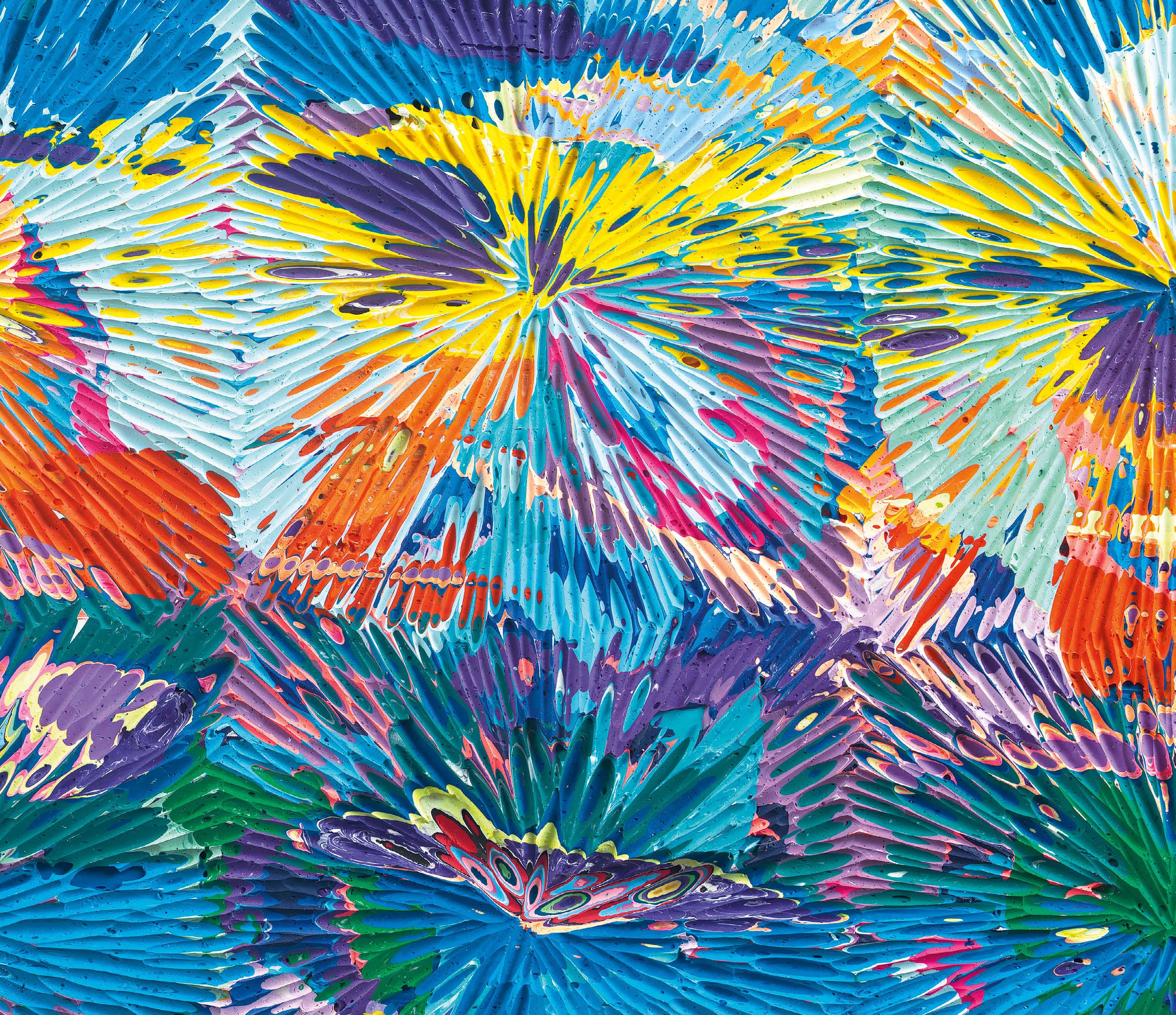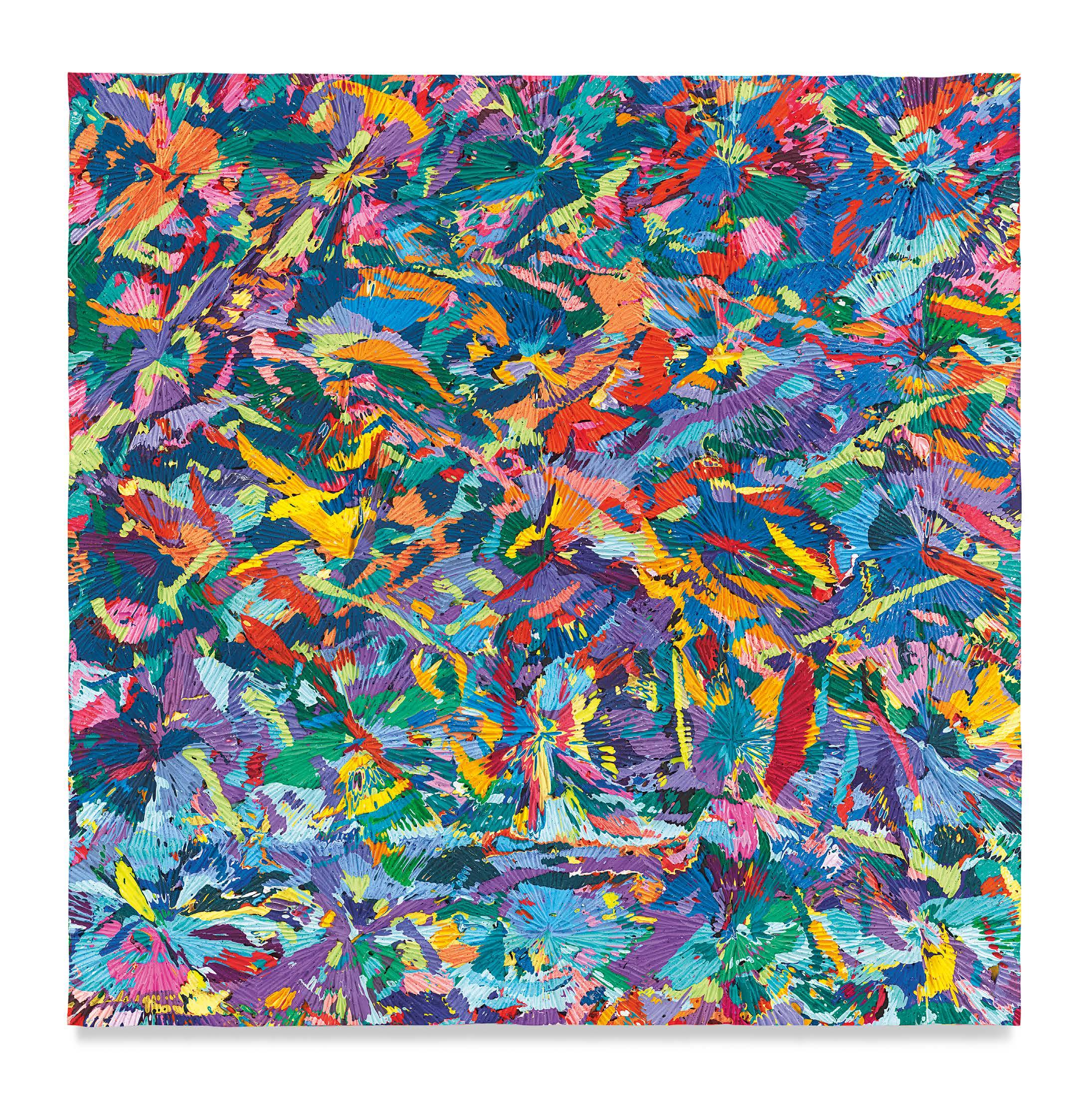 In a version of Martin Creedās performance Words and Music, he asks if we have too many words or not enough. Surely itās more about how we use them, he suggests, and considers something like a chord in music, but for spoken words. If instruments or choirs can sing three or more notes at once, creating a new kind of layered, complex note, could we do that in our speech with words, he wonders. What changes would be required in my brain and voicebox in order to say the right three words at the same time? To stack them up simultaneously instead of having to choose one at a time, ordering and reordering them to try to give them meaning? David Allan Peters cuts into layers of paint, creating the illusion that the colors are nesting, that they hold each other like rings of a tree. Dozens of colors try to sing out at once.