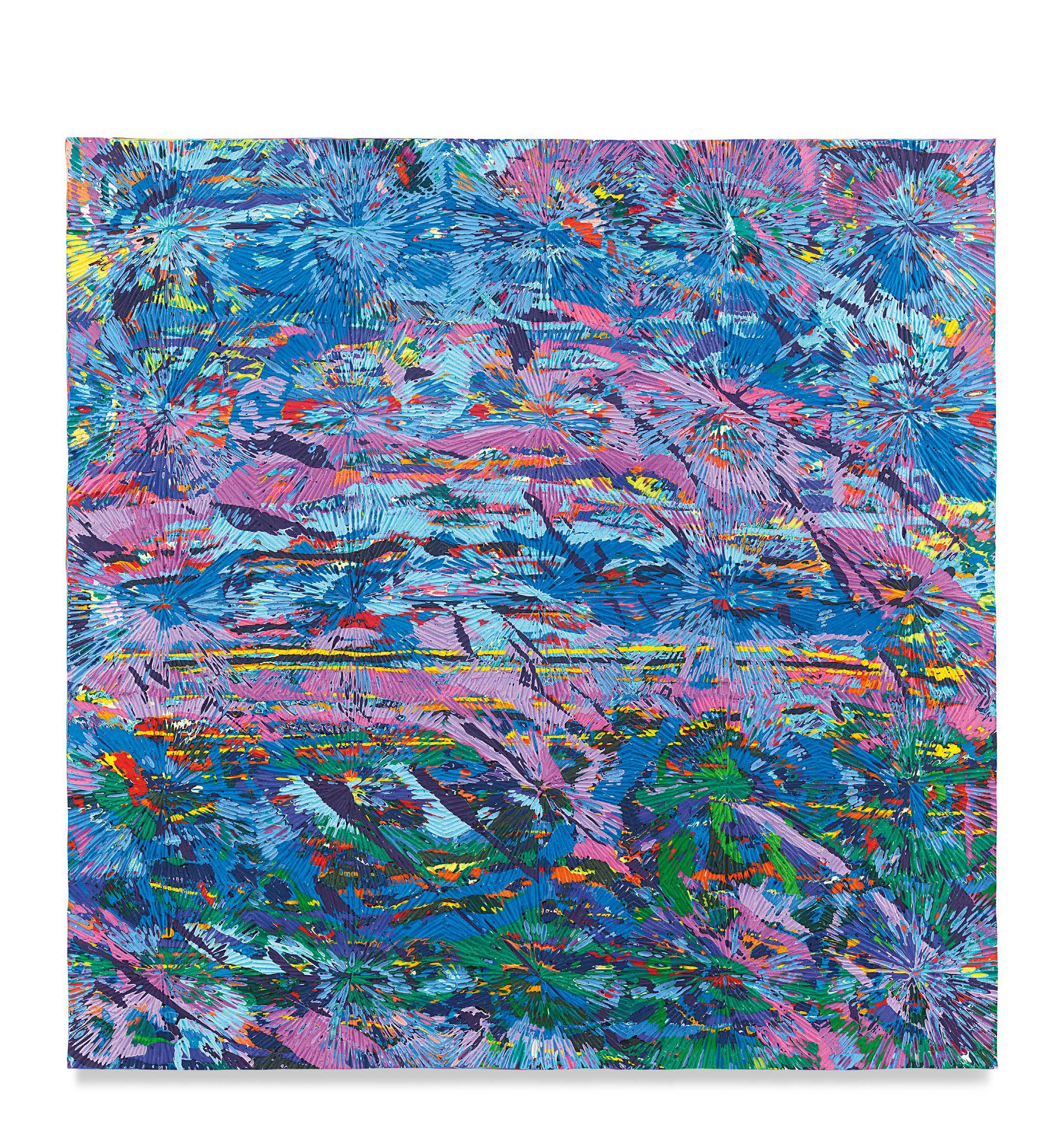 so this stage requires some balance between determination and trance, focus and ļ¬ow. The artist draws out a grid to help keep his marks aligned, and then inserts the blade. While the artist cuts, his blade makes the seemingly solid planes of color almost jiggle.
