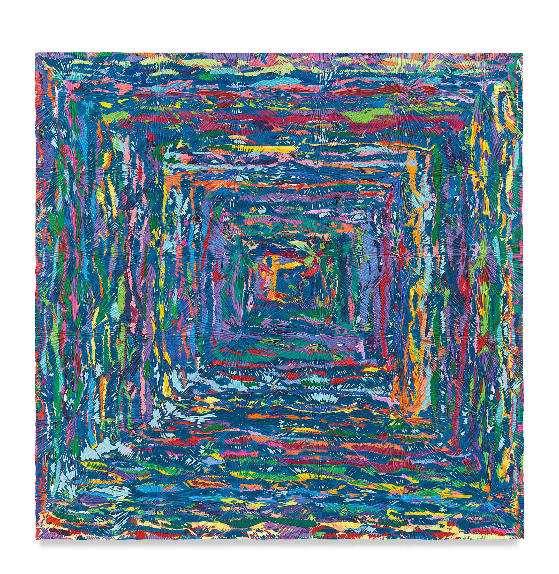As the sun goes down, David Allan Peters closes up his rooms one by one, shu ing himself inside the fourth room to carve into the night. David Allan Peters uses a small handheld linoleum cu ing tool usually used for printmaking, to rhythmically and repetitively cut out thin sections of the painting. The cu er has a plastic handle designed to ļ¬t comfortably in the artistās hand and a steel, U-shaped blade which will reveal concentric strata of color. How long and deep these cuts are will determine how many layers of color we see,