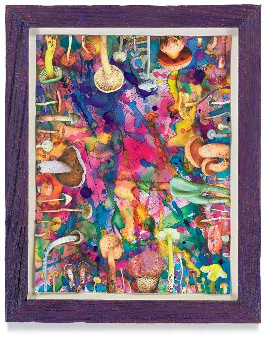 Emerson’s worm is Melini’s mushroom. The subterranean mycelium networks stretch for miles, serving as information superhighways for plants and trees, enabling them to communicate with each other, share nutrients, and fight off invasive species. Above the earth, mushrooms are the beginning and end of all life forms, helping to break down dead matter and feed it back into the ground to stimulate new growth. They also have the capacity to help heal trauma and reshape the physiological elements of the brain and therefore sentience itself. Culled from field guides used by mycology hobbyists to determine which fungi are safe to eat and which are fatal, the highly stylized mushrooms in Melini’s collages become almost individual subjects, anthropomorphized characters in a drama. From a distance, Melini’s watercolor works on paper appear as richly hued, dense abstractions. But upon a closer encounter with the works, the hundreds of different mushroom shapes, colors and sizes emerge, dancing around the perimeter of the paper and serving in some sense as a frame for the color studies within. Melini uses no brushes in his application of the watercolor paints that constitute the interior of the collages, allowing the pigments to coalescence into a deep space, creating a simple differentiation between foreground and background. Though smaller in scale and subtler in presence, Melini’s mushroom collages are the foundation upon which his paintings are conceived and made.