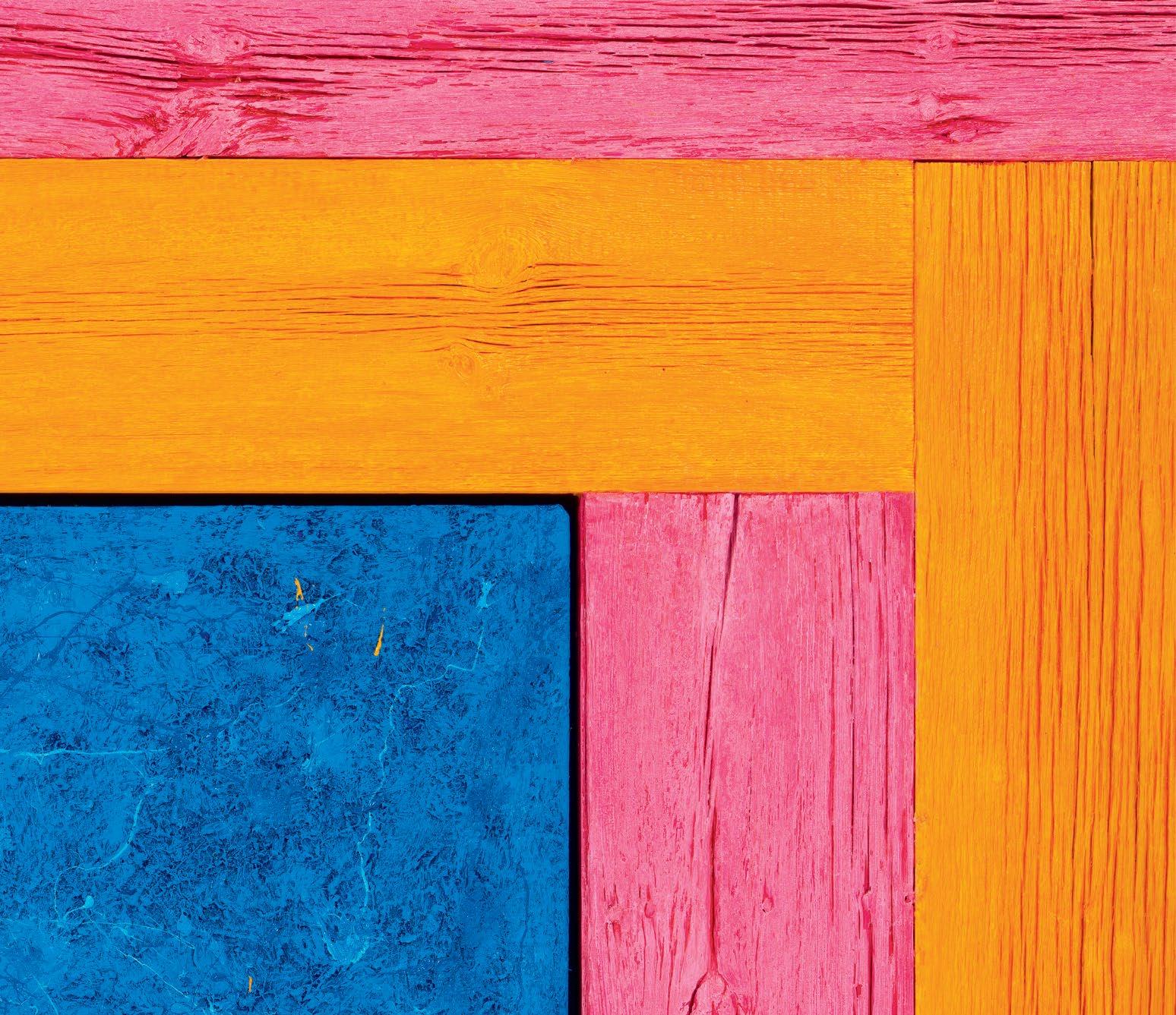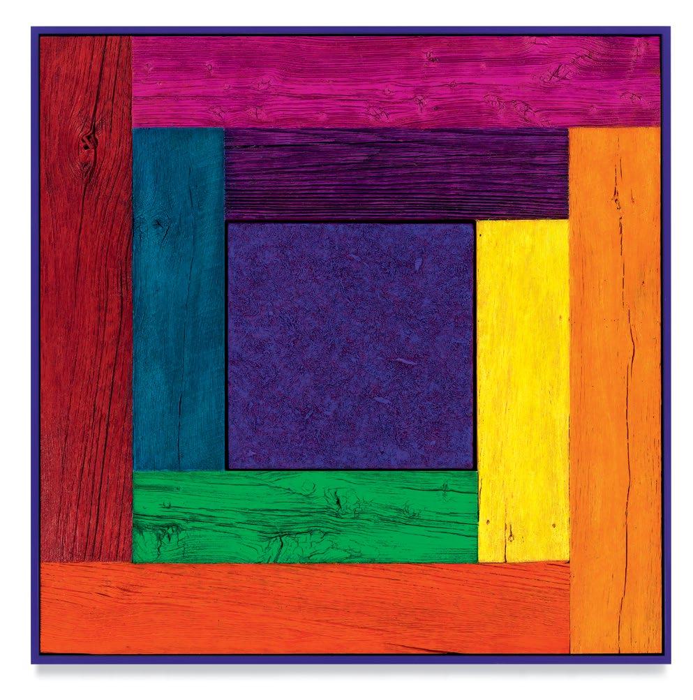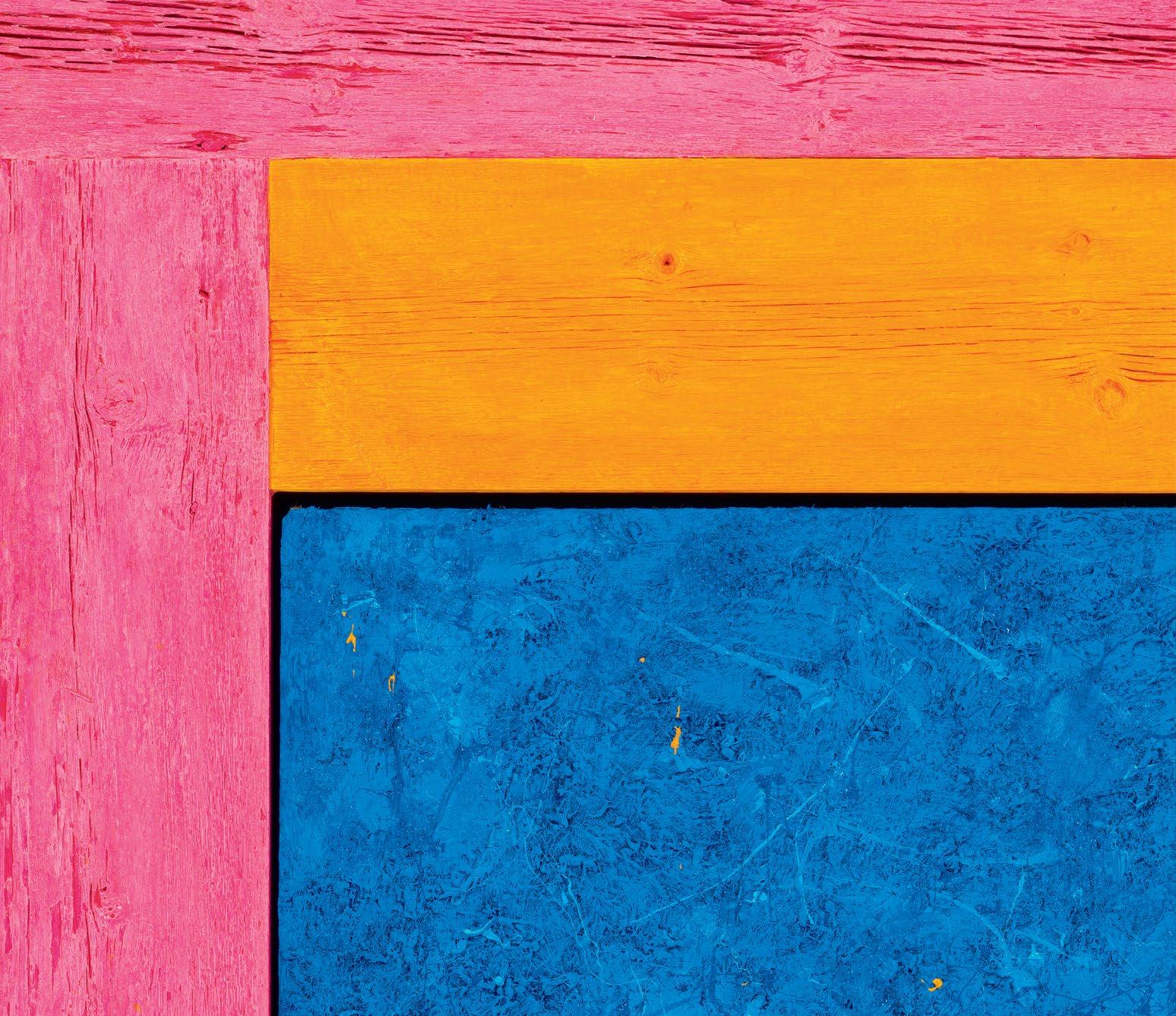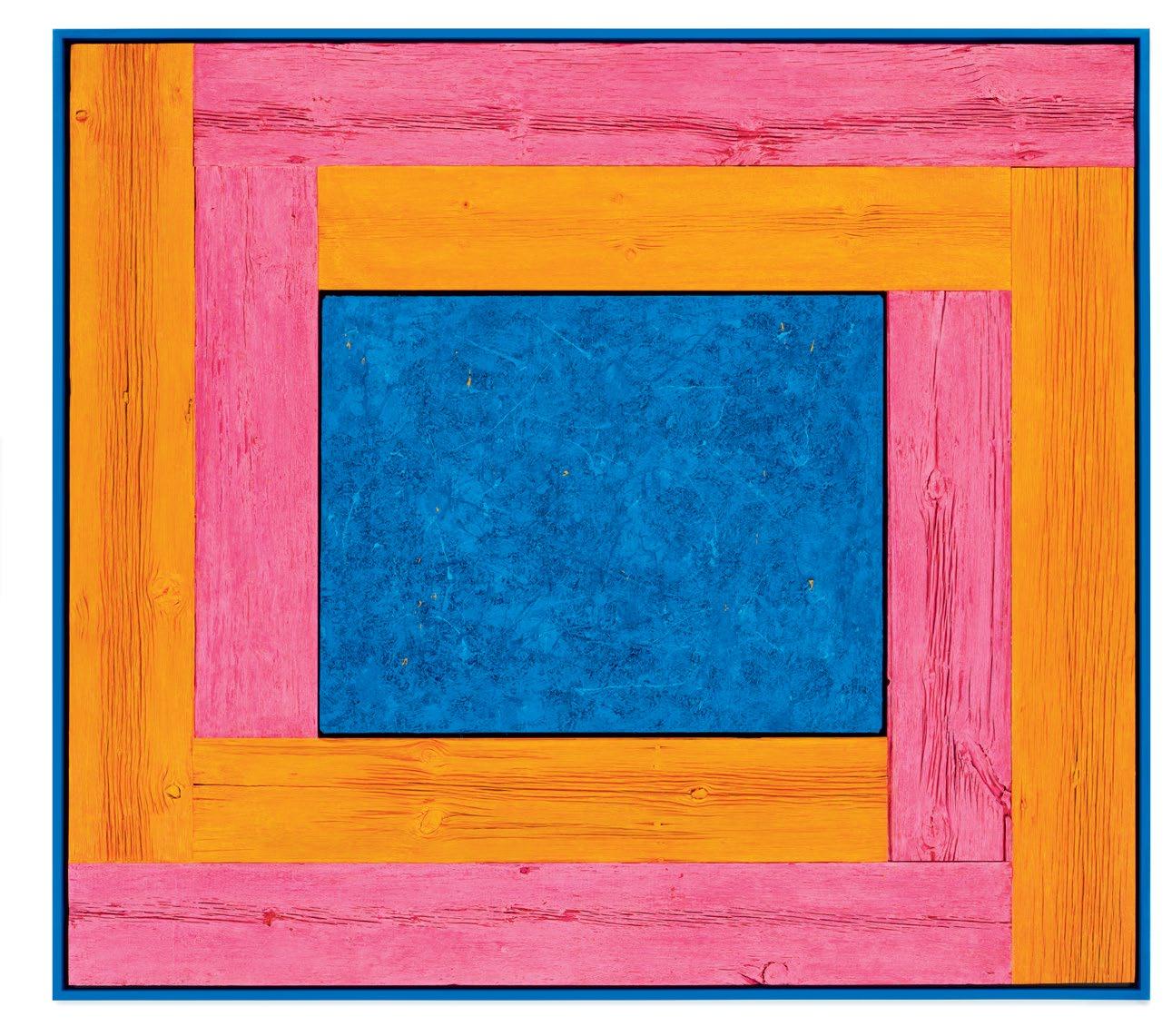 his paintings. Saturating them with color through a rigorous staining process, the planks are placed to form L-shapes, with each work containing two sets of Ls in two contrasting colors. The palettes are aggressive, like the “sweet and sour” description once applied to Peter Halley’s canvases.1 The two Ls are placed exterior to a heavily built-up canvas, and interior to the finish frame. Melini’s doubling up of “frames” dislodges the notion of a fixed interior and exterior. The eye is drawn into the planks of wood, tracing the natural deep furrows and ridges of the material. The central canvases, meanwhile, are built up and out with meaty paint, to the point that the center shape of each work becomes an almost sculptural protrusion outward into space. The effect is a subtle, but persistent, optical vibration. Melini’s finish frames match the colors of the interior canvas. This at first seems to neatly package the oneness of the painting as a discrete object, but in fact it emphasizes a false belief that some elements of the work are moving inward and others are moving outward.