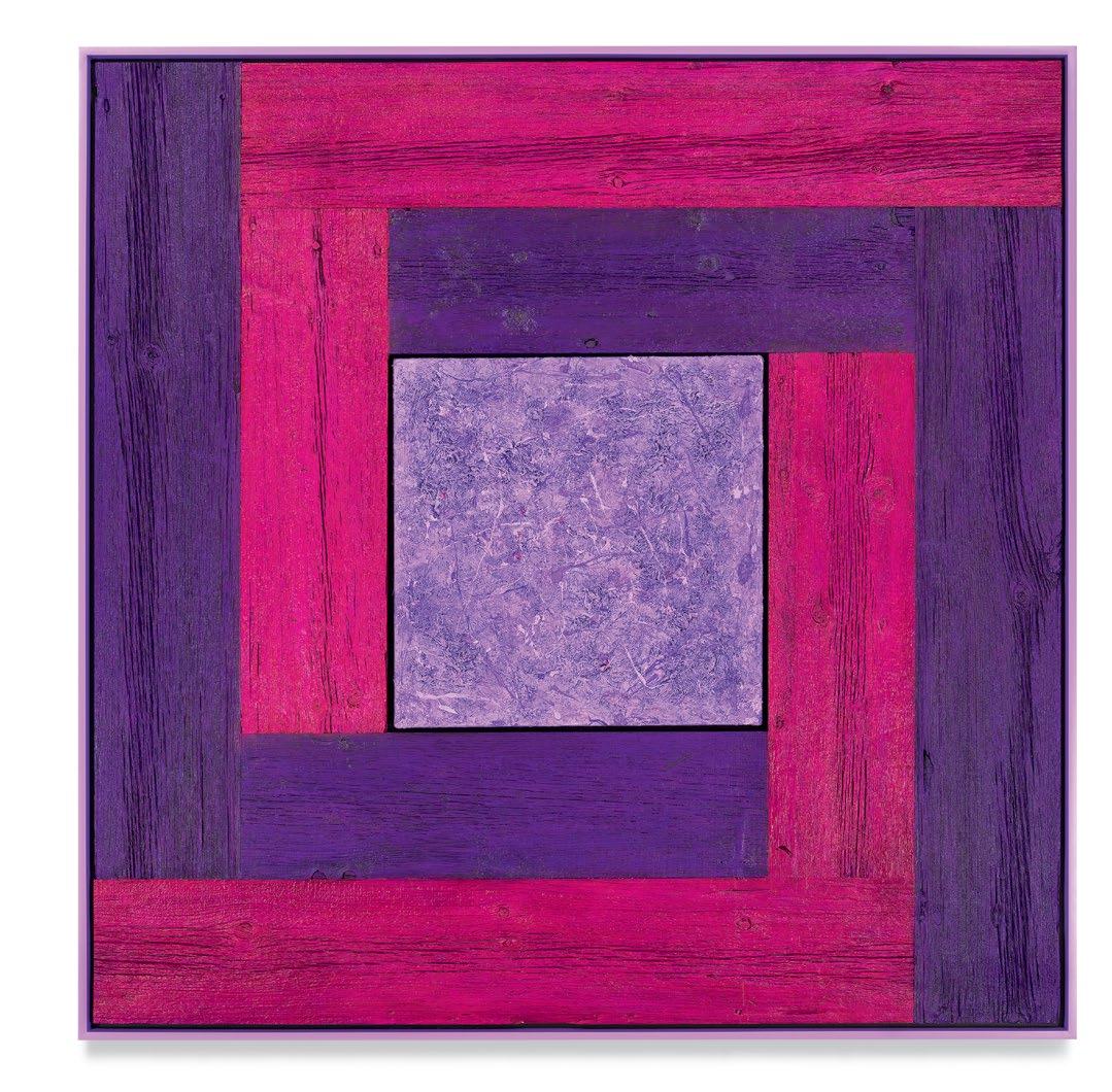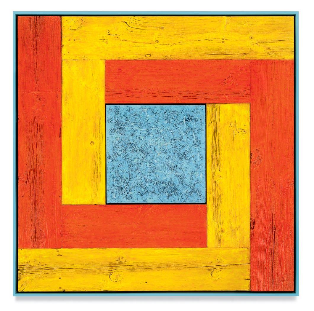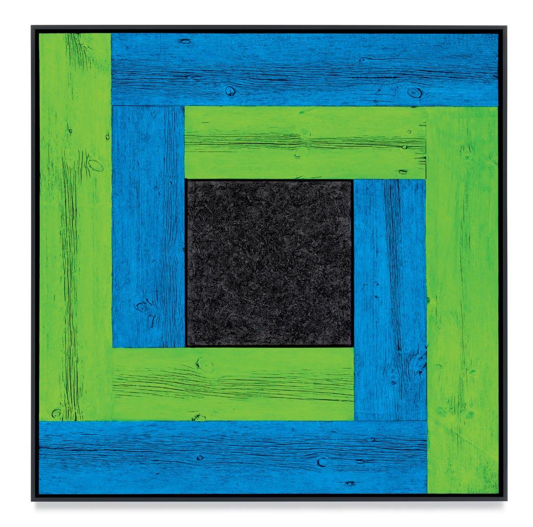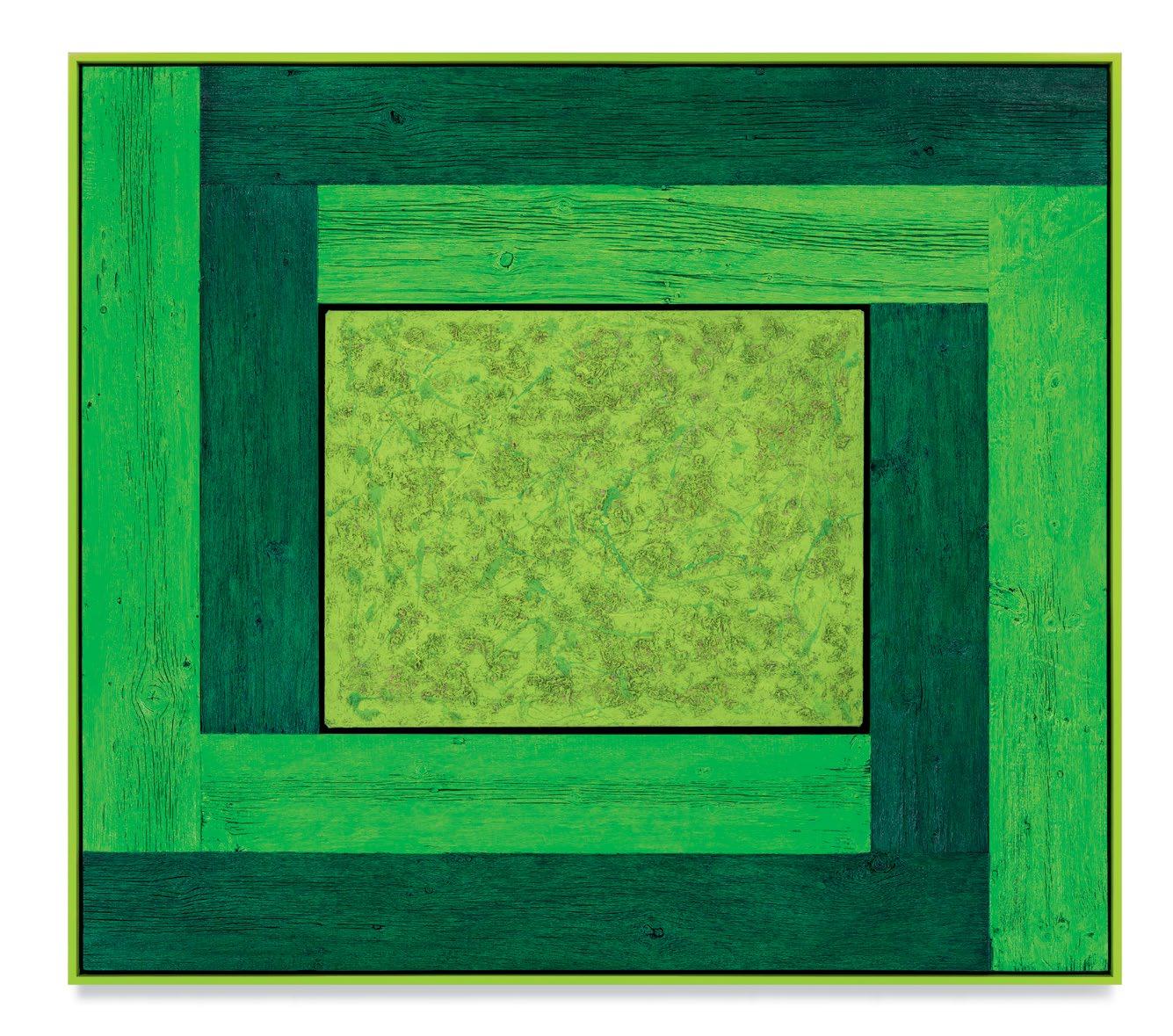 his paintings. Saturating them with color through a rigorous staining process, the planks are placed to form L-shapes, with each work containing two sets of Ls in two contrasting colors. The palettes are aggressive, like the “sweet and sour” description once applied to Peter Halley’s canvases.1 The two Ls are placed exterior to a heavily built-up canvas, and interior to the finish frame. Melini’s doubling up of “frames” dislodges the notion of a fixed interior and exterior. The eye is drawn into the planks of wood, tracing the natural deep furrows and ridges of the material. The central canvases, meanwhile, are built up and out with meaty paint, to the point that the center shape of each work becomes an almost sculptural protrusion outward into space. The effect is a subtle, but persistent, optical vibration. Melini’s finish frames match the colors of the interior canvas. This at first seems to neatly package the oneness of the painting as a discrete object, but in fact it emphasizes a false belief that some elements of the work are moving inward and others are moving outward.