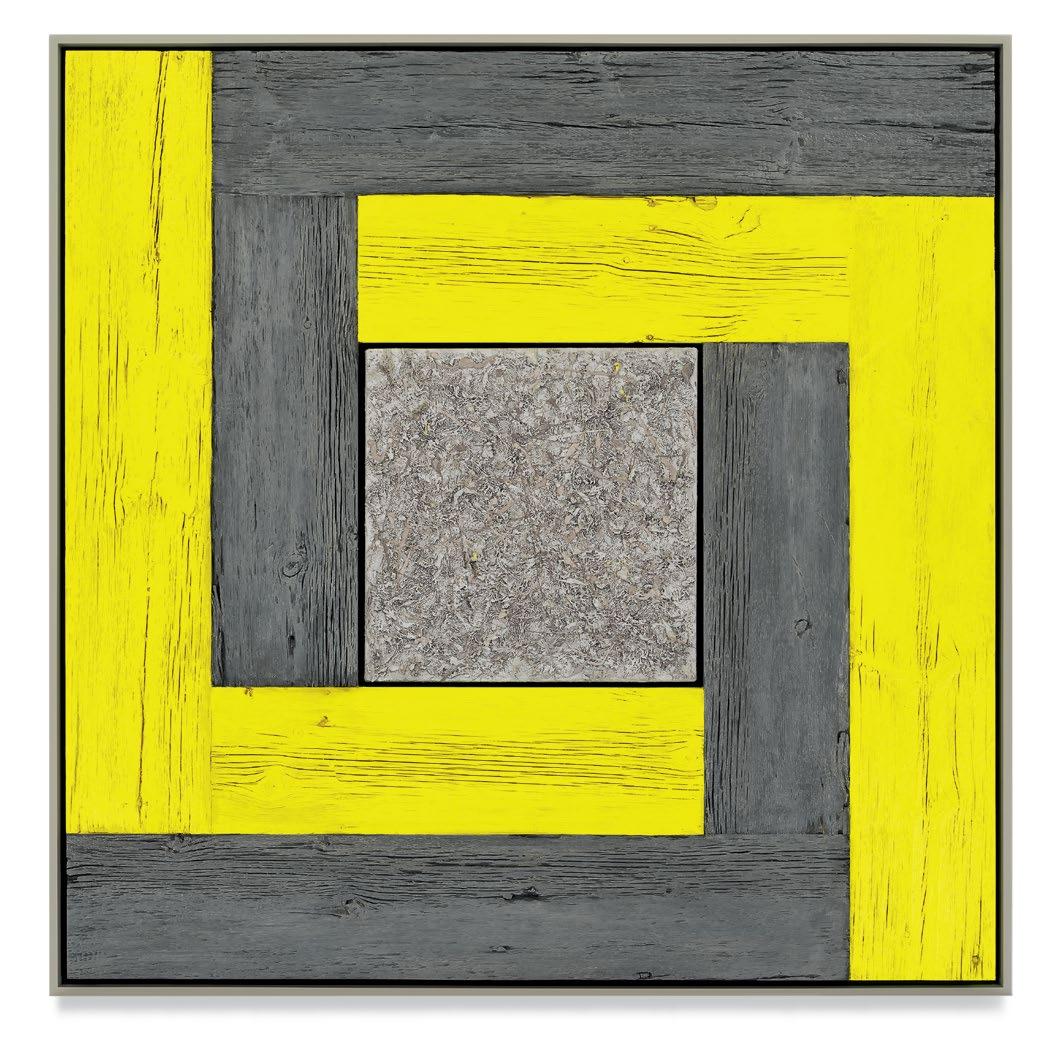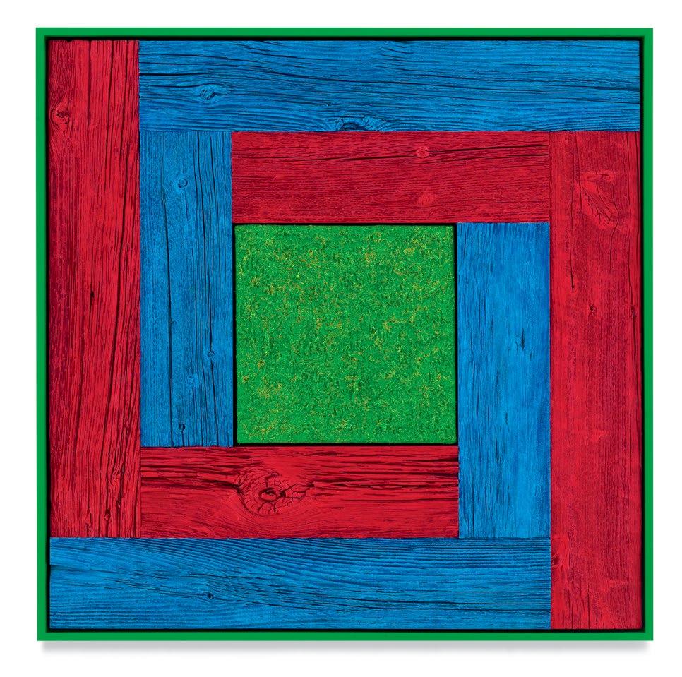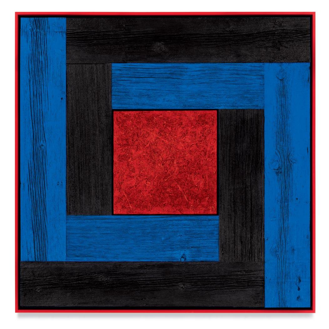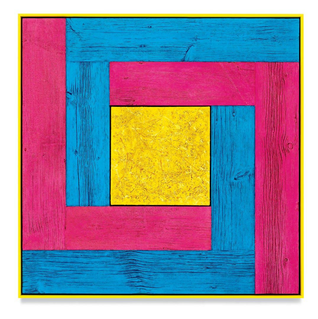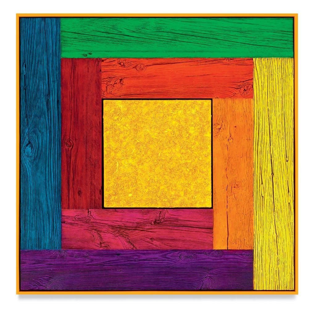 his paintings. Saturating them with color through a rigorous staining process, the planks are placed to form L-shapes, with each work containing two sets of Ls in two contrasting colors. The palettes are aggressive, like the “sweet and sour” description once applied to Peter Halley’s canvases.1 The two Ls are placed exterior to a heavily built-up canvas, and interior to the finish frame. Melini’s doubling up of “frames” dislodges the notion of a fixed interior and exterior. The eye is drawn into the planks of wood, tracing the natural deep furrows and ridges of the material. The central canvases, meanwhile, are built up and out with meaty paint, to the point that the center shape of each work becomes an almost sculptural protrusion outward into space. The effect is a subtle, but persistent, optical vibration. Melini’s finish frames match the colors of the interior canvas. This at first seems to neatly package the oneness of the painting as a discrete object, but in fact it emphasizes a false belief that some elements of the work are moving inward and others are moving outward.