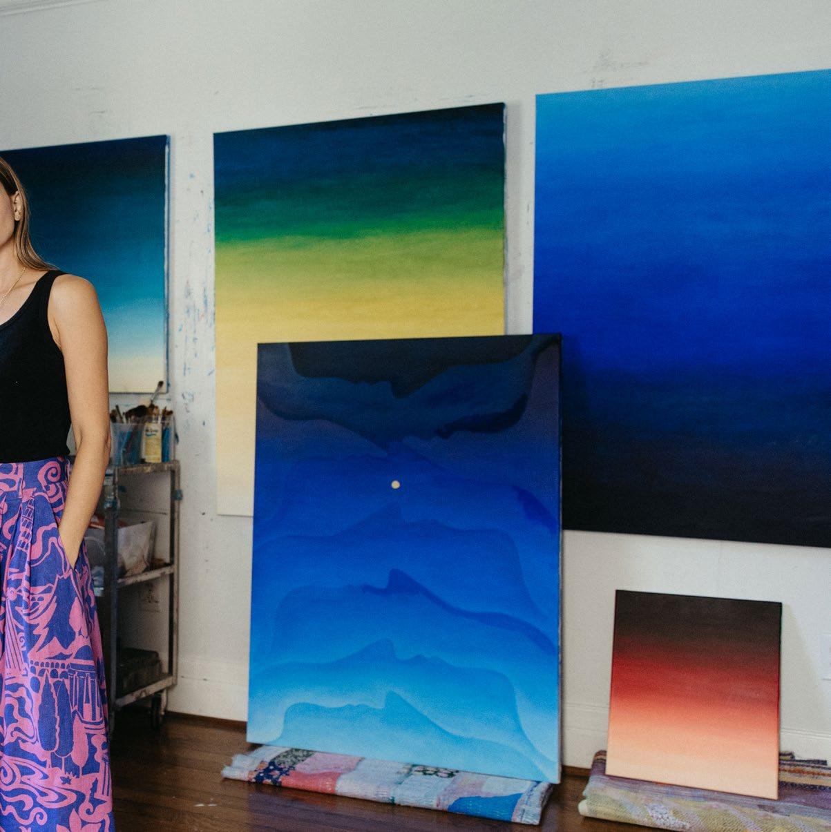 Double Slit (2025), for example, finds a royal blue plane cut twice along its vertical axis. Lucio Fontana’s sliced canvases come quickly to mind. It is the context provided by the painting’s broader compositional and physical structure that animates this play of signs, that gives it life as a theater of the mind. Along Double Slit ’s top edge, color darkens, as if the sky is turning into squid ink; down below, the opposite occurs, as blue becomes yellow-white. Again, a crescent moon hovers.
