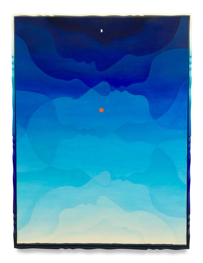 Just as the violin and the guitar—which makes a full-form cameo in Magnifier (2024)—are built for vibration, these paintings are built to convey the same. Interference (2025) has two focal points on the picture’s central vertical axis. Each forms the center of a raised ripple formation. It’s as if two small stones had been plunked into the picture plane. The ripples disturb a crepuscular sky, framed by rising specter hands. The latter are as much signals of divinity as they are reusable compositional elements: They are cousins, maybe, of the cutout shapes that Henri Matisse rearranged from painting to painting or the serialized human figures in Auguste Rodin’s Gates of Hell .