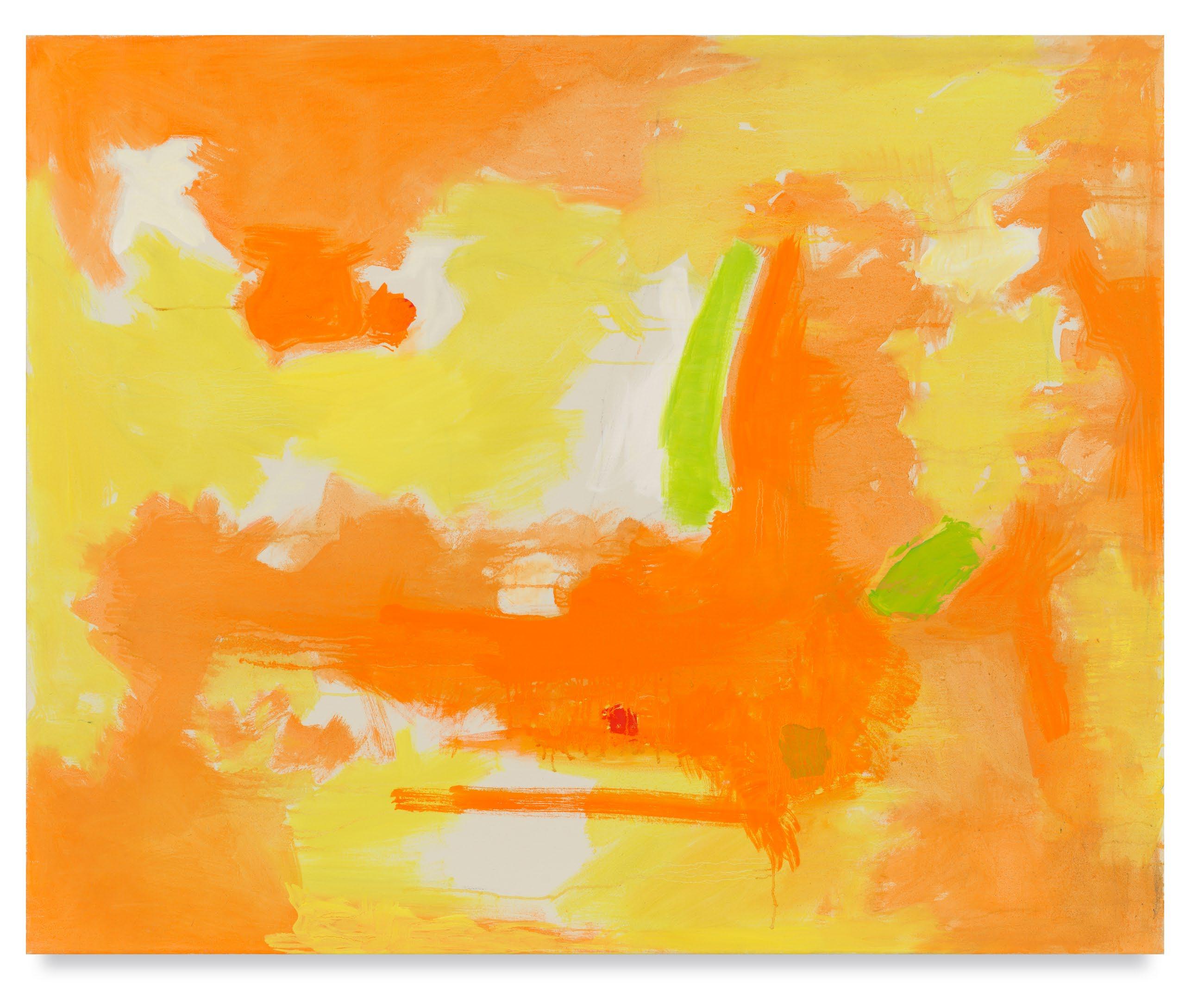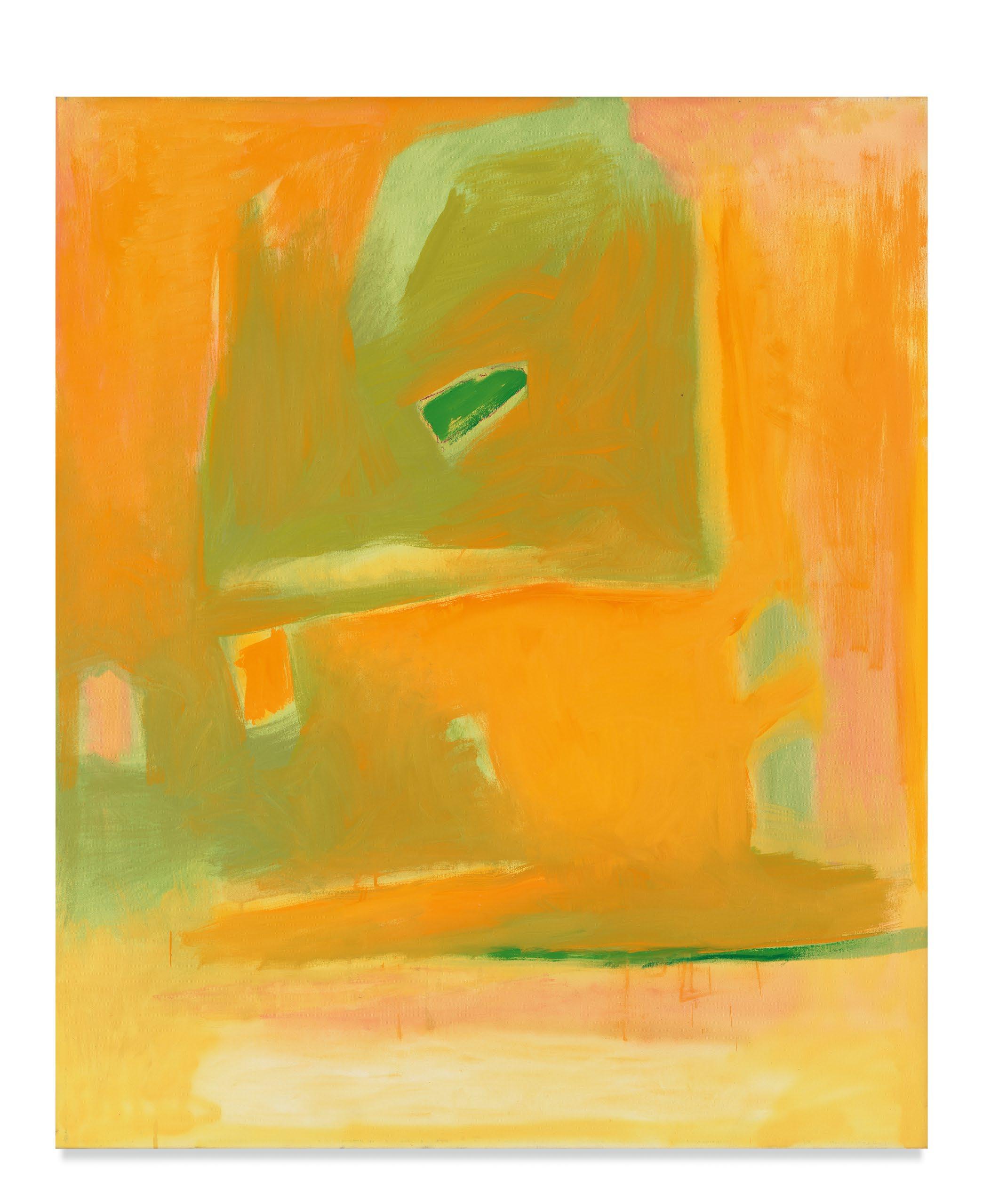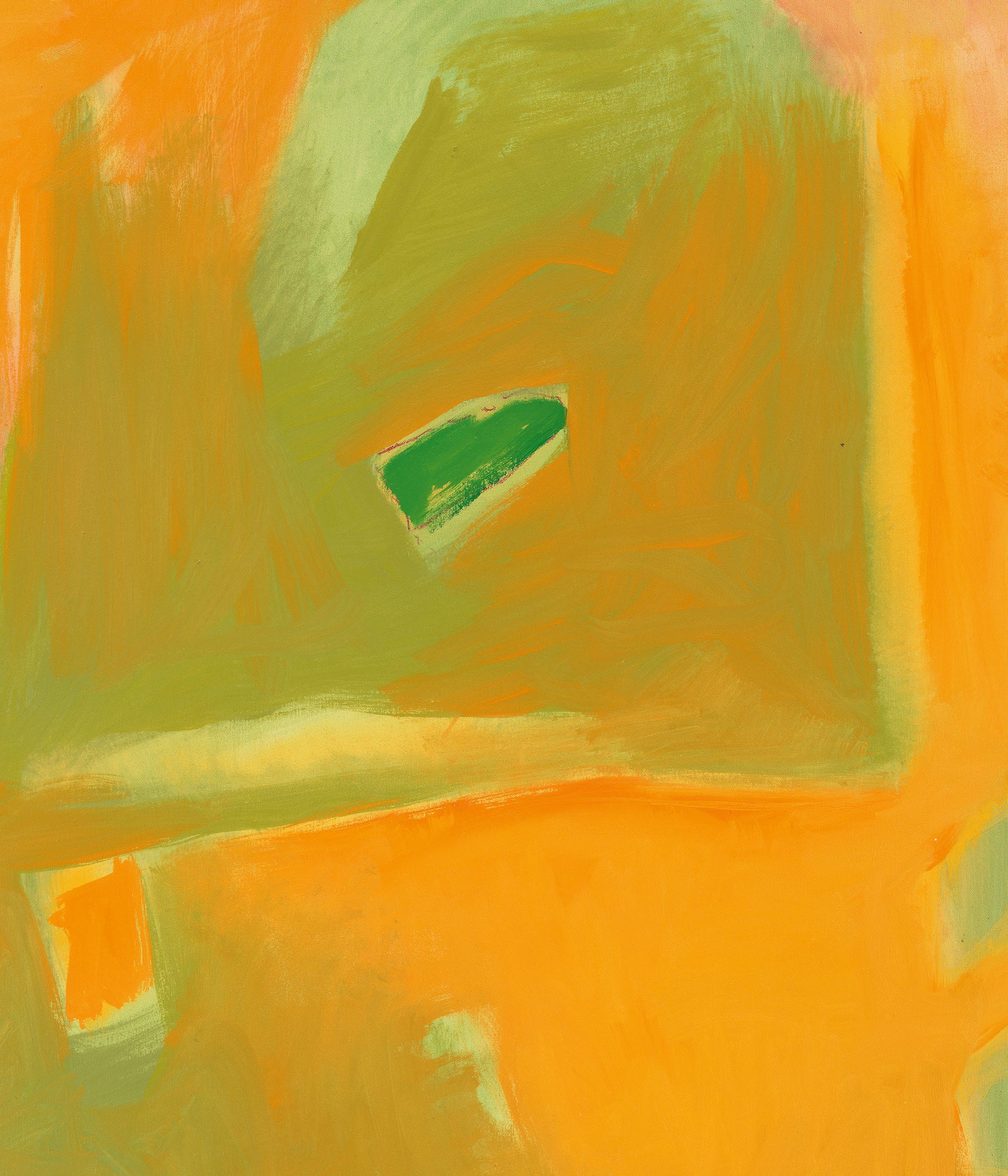 With Instinctive (1994), one sees the artist painting in a higher key, as the painting’s vibrant yellow-orange ground sets its smaller compositional elements in a zero-gravity orchestration. These elements are approximate rectangle and triangle shapes in subtle tonal and saturation shi s of orange and green, which seem to a ract and then repel one another, as if they have been set spinning by alternating molecular charges. Vicente offsets and carefully modulates this spatial drama with incredibly delicate swathes of white and the lightest red orange, which se le at the bo om of the canvas. The painting is a perfect example of the dynamic contiguity of the formal “push and pull,” most famously espoused by Hans Hofmann.