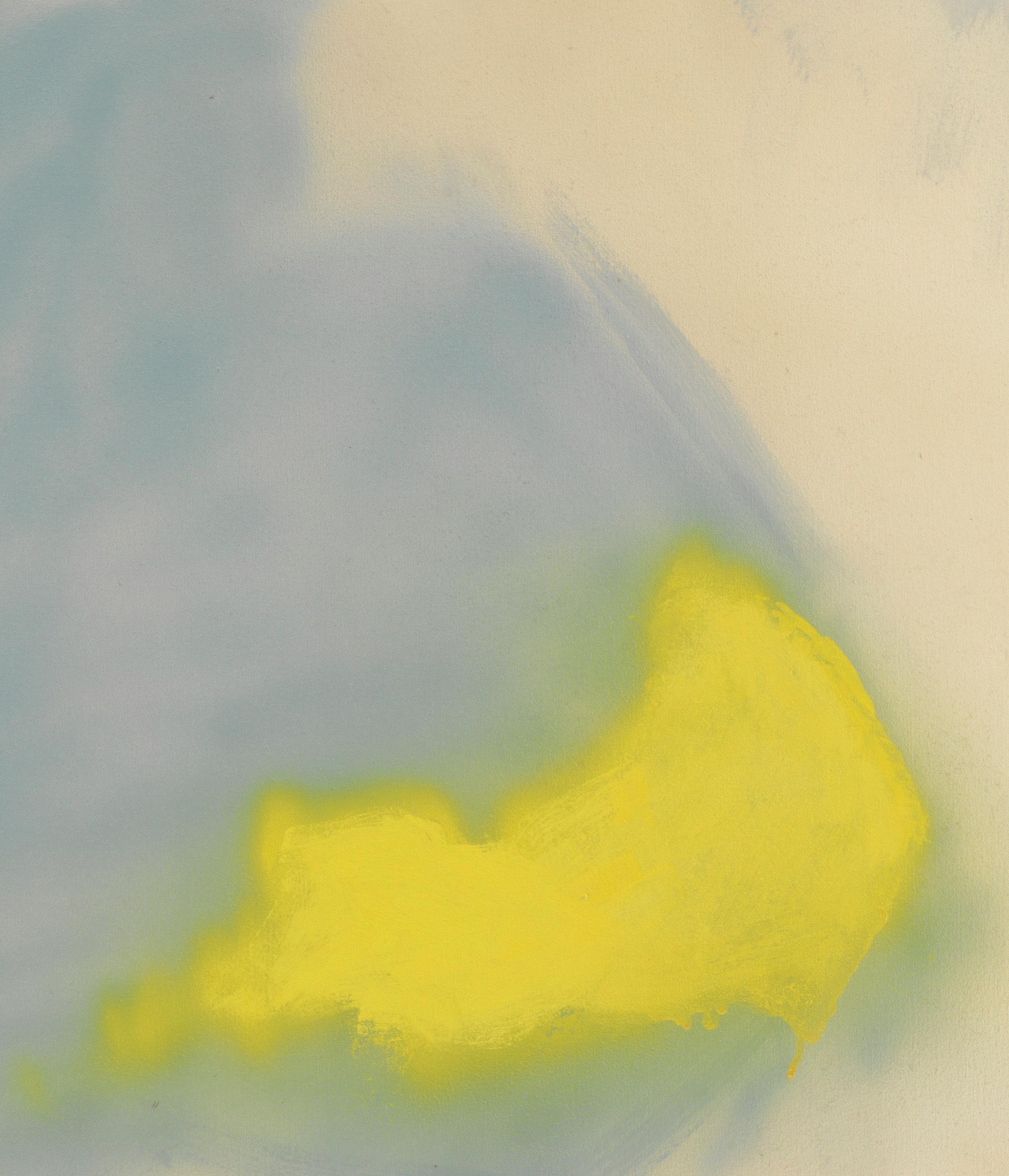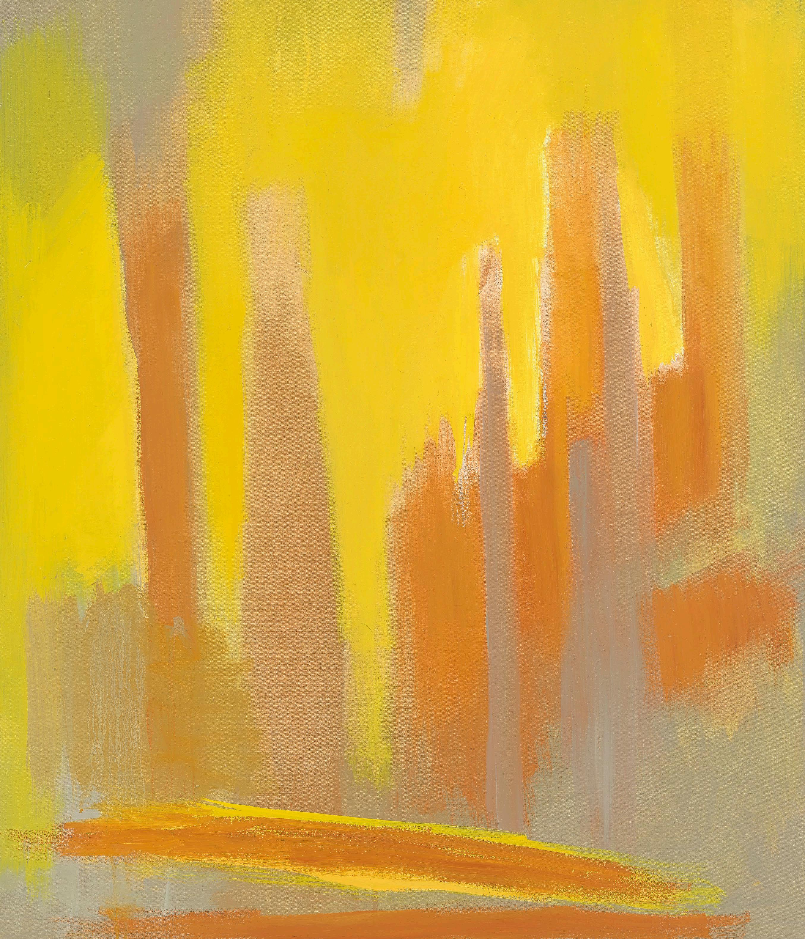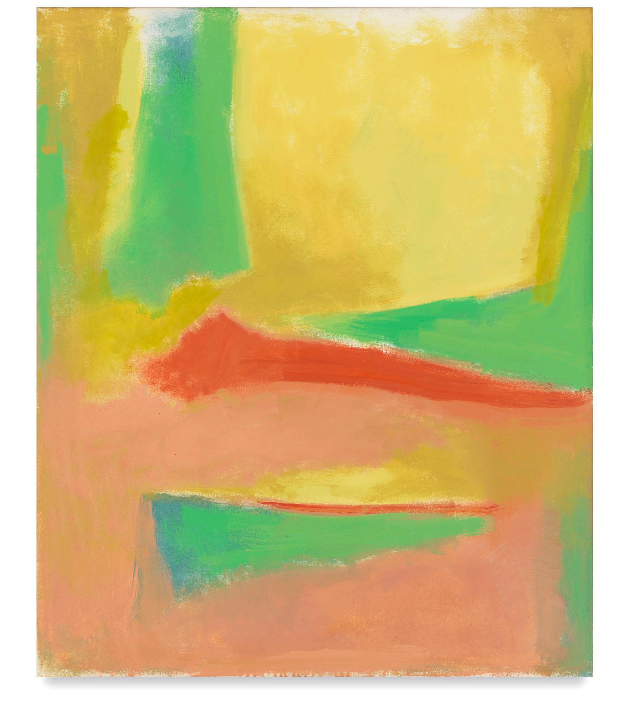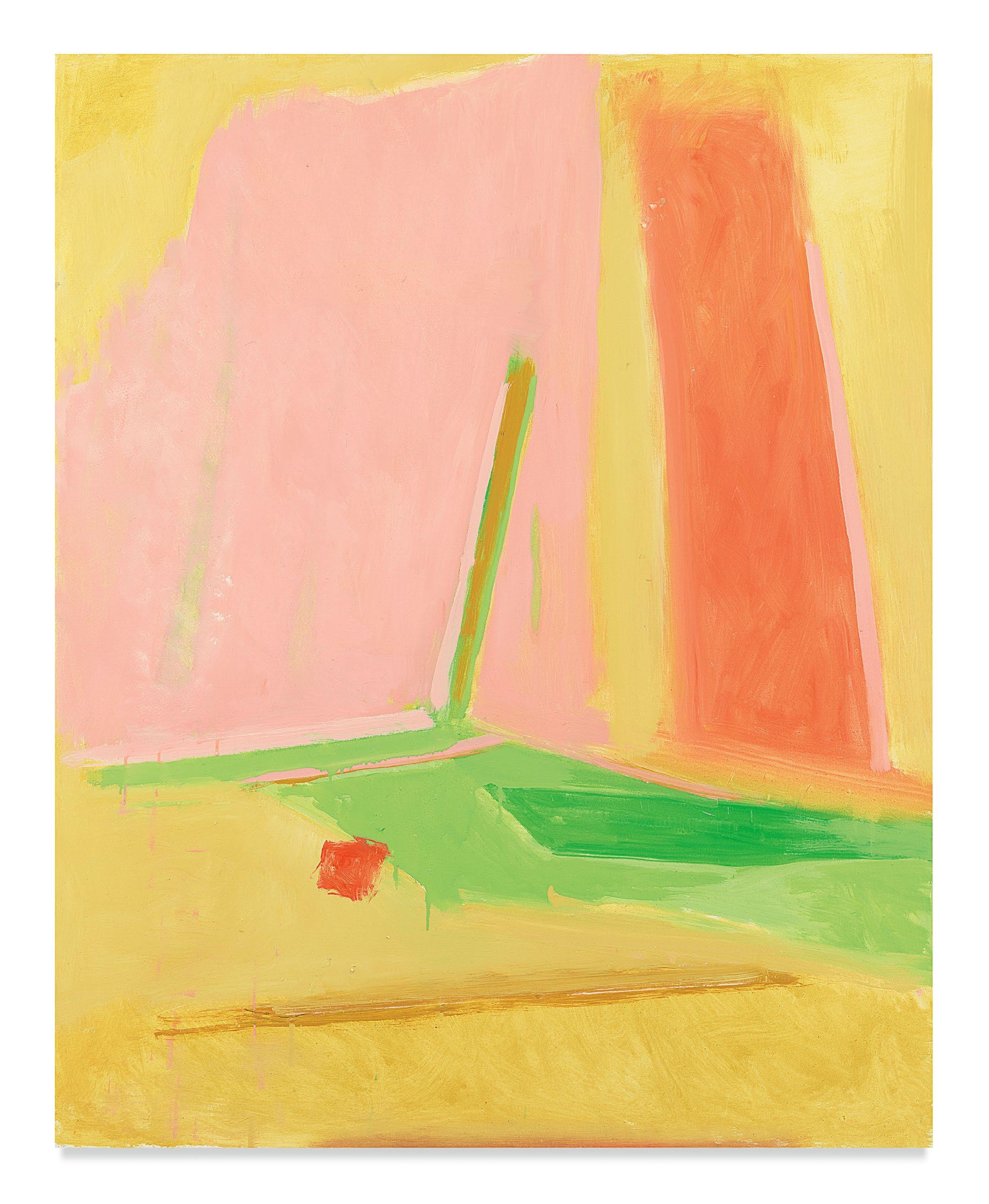 With Instinctive (1994), one sees the artist painting in a higher key, as the painting’s vibrant yellow-orange ground sets its smaller compositional elements in a zero-gravity orchestration. These elements are approximate rectangle and triangle shapes in subtle tonal and saturation shi s of orange and green, which seem to a ract and then repel one another, as if they have been set spinning by alternating molecular charges. Vicente offsets and carefully modulates this spatial drama with incredibly delicate swathes of white and the lightest red orange, which se le at the bo om of the canvas. The painting is a perfect example of the dynamic contiguity of the formal “push and pull,” most famously espoused by Hans Hofmann.