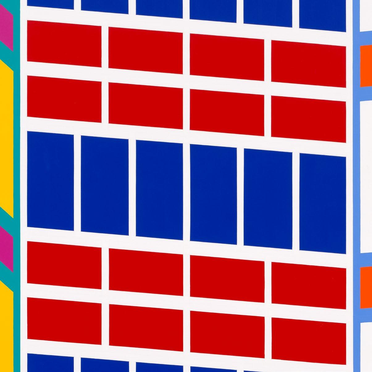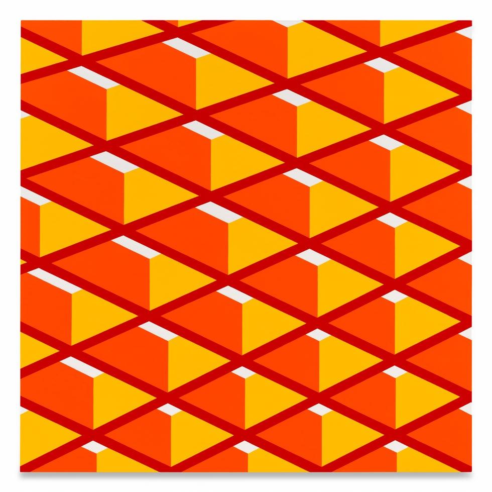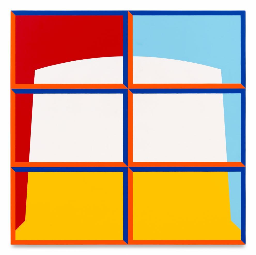 These new paintings from Jim Isermann refit a body of work that has already read a rainbow into dreary straight minimalism. They turn—from his representations of botany and explorations of geometry, two fields both oppositional and linked, biological and intellectual, the hand of God or whatever and the hand of the painter, talk about categorical blur—toward direct reference, with parenthetical allusions to the architects whose achievements Isermann is, here, modeling. In acrylic on canvas over aluminum panel, he reimagines some Bruce Goff portals, Paul Rudolph schemes, and Philip Johnson portals. Some only get data titles. But each seems to overflow the hypnotizing flatness upon which Isermann previously floated the eye. Uniform in their shape and size, and also in their brilliance of hue and contrast, each is afforded the possibility of a mess. In that way, they reference the real world.