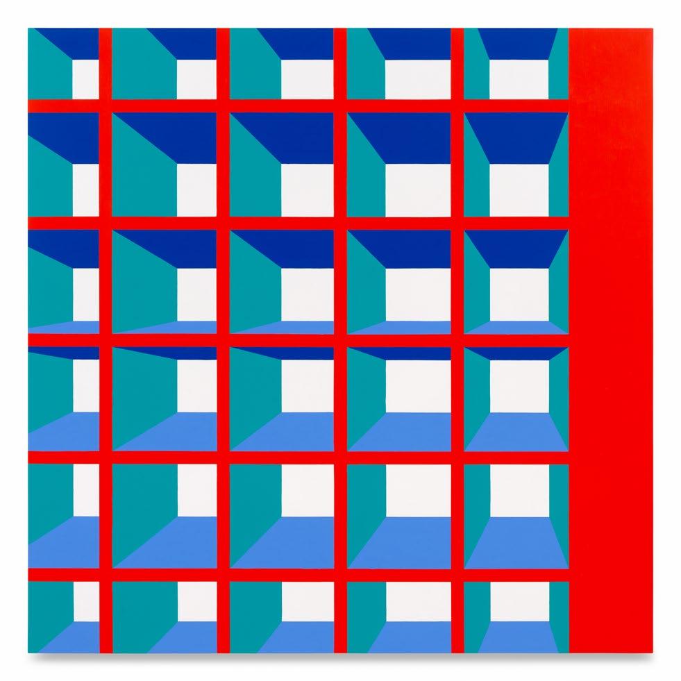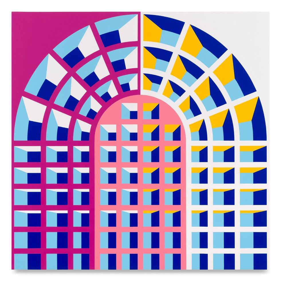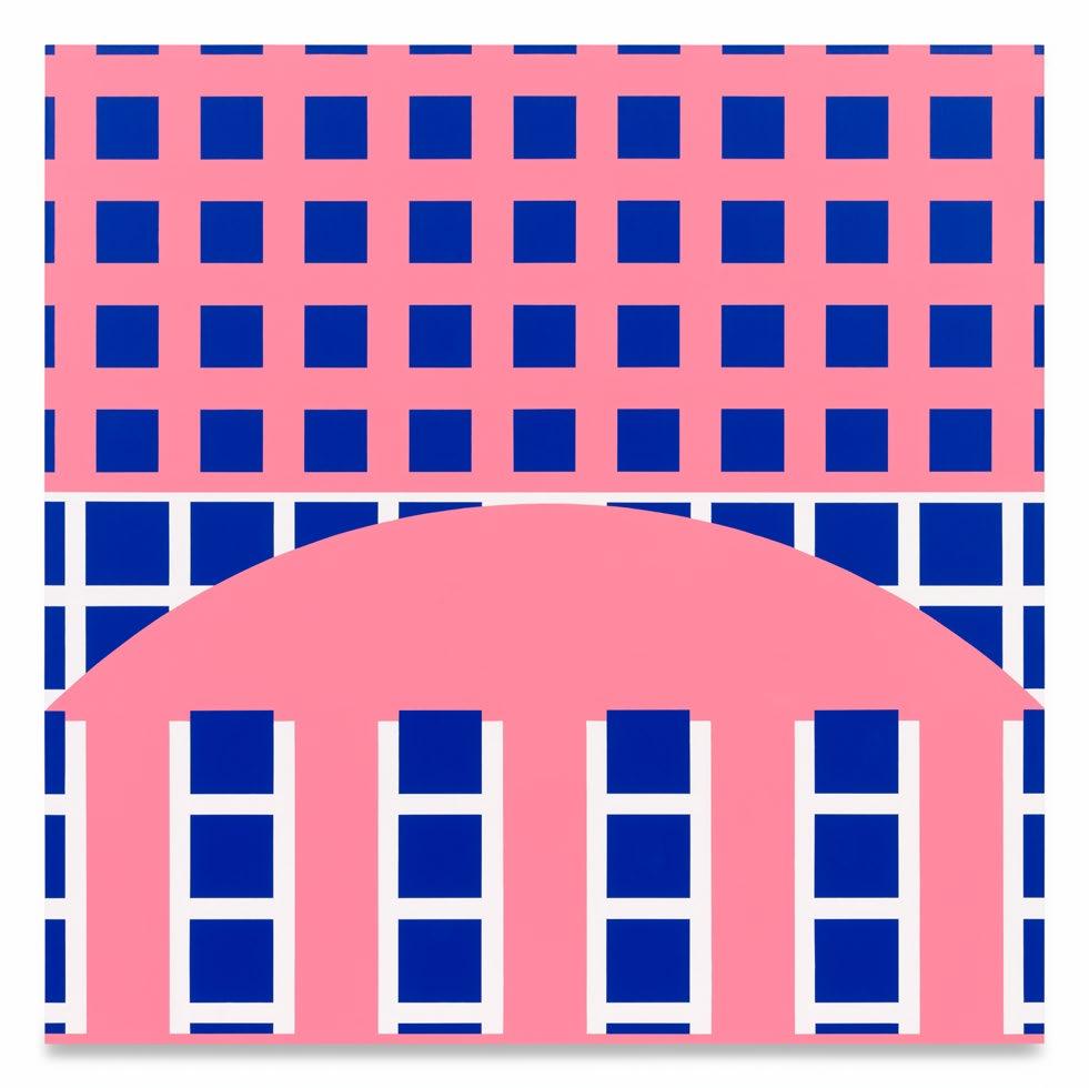 fact, exist. Queer lives went off the record. In October, Isermann made another model available. In Palm Springs’ Frances Stevens Park, he poured concrete into the footprint of a Lambda, the coded symbol for gay liberation, set within a circle. He piled triangles—the geometric marker Gran Fury reclaimed from the Nazis—that were made of folded steel into an undulating but unbreaking wall. As a viewer cruises the Palm Springs Pride Monument, the structure unfurls itself, wrapped in the rainbow hues of the Progress Pride flag—updated from Gilbert Baker’s 1978 original to include expanding identities. The monument is itself an update to Isermann’s iconic rainbow cube from the late ’90s, storming out of the gallery and into the streets of California’s queer enclave. It seizes the means of production Isermann developed to make walls and screens for Texas football stadiums and museums around the world and deploys it for a bit of public art dedicated to those whose private lives are constantly patrolled. In the new paintings, brick-and-mortar locations shimmer in their solidity, but as the monument testifies, those blocks can break apart and remodel themselves into “somewhere,”