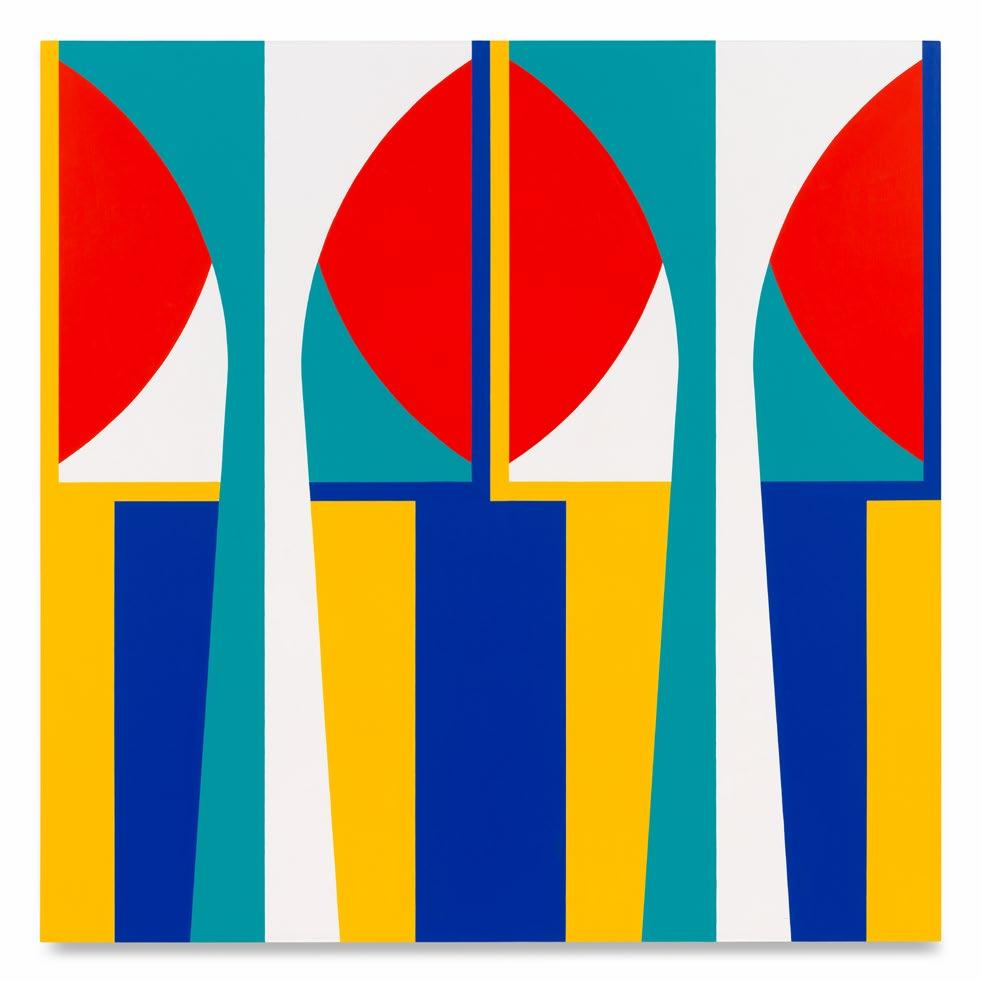 JI: “I only started working with acrylic paint seven or eight years ago. No matter what you do with it, it has a viscosity that leaves the brushstroke. I embrace it. When you have ten coats of paint, I’ll tape them all, but I’ll never put the tape over the paint once it’s down. So painting next to that, it’s all freehand, up to the ridge, and you’ll see the paint crossing. It will be thicker or thinner, where it might slip over the other color. They have, you