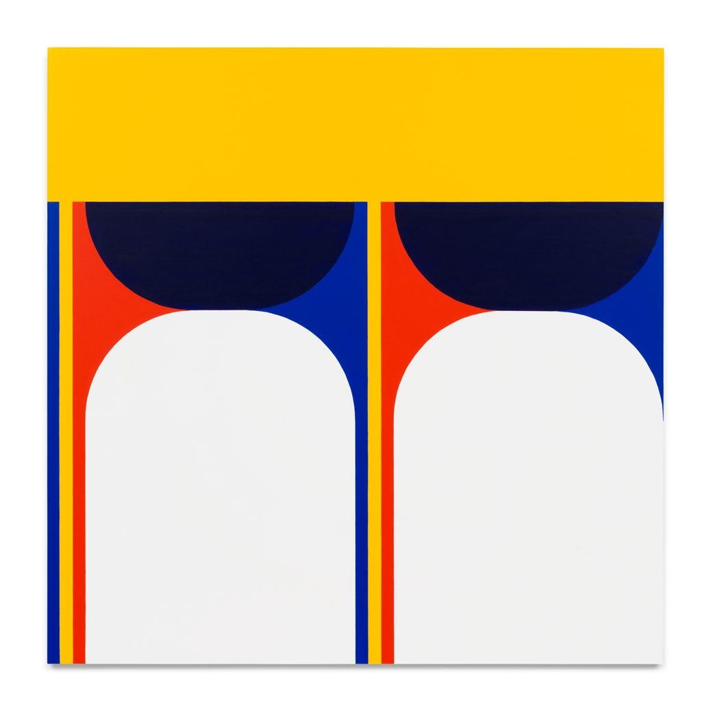 Palm Springs, where Isermann is based, and beyond. This pretty squat lump architectural gesture is a balancing act of concrete and air. And now there is the thing itself. Isermann stacked them into a backyard wall, but he couldn’t get the product off the ground, manufacturing-wise. He had better luck with mass-produced pool towels. Utility blankets did well; he made one dog-size, and he made one suited for the backseats of the cars of his designer friends. He built a bookcase for his new boyfriend’s poetry collection, and the shelves became the room. One of the new paintings, Untitled (0325) (2025), is a split-screen perforated on each side by rows of squares themselves surrounded, on two sides, by two parallelograms. Each screen is a reverse of the other. In a glance, the left side shows rows of art books held in space (in order); the other view displays their absence. It could be a map of how things fit together or fall apart. Another: Untitled (0225) (2025) might offer open shelves before an arched doorway; there is no guidebook to where we’re going.