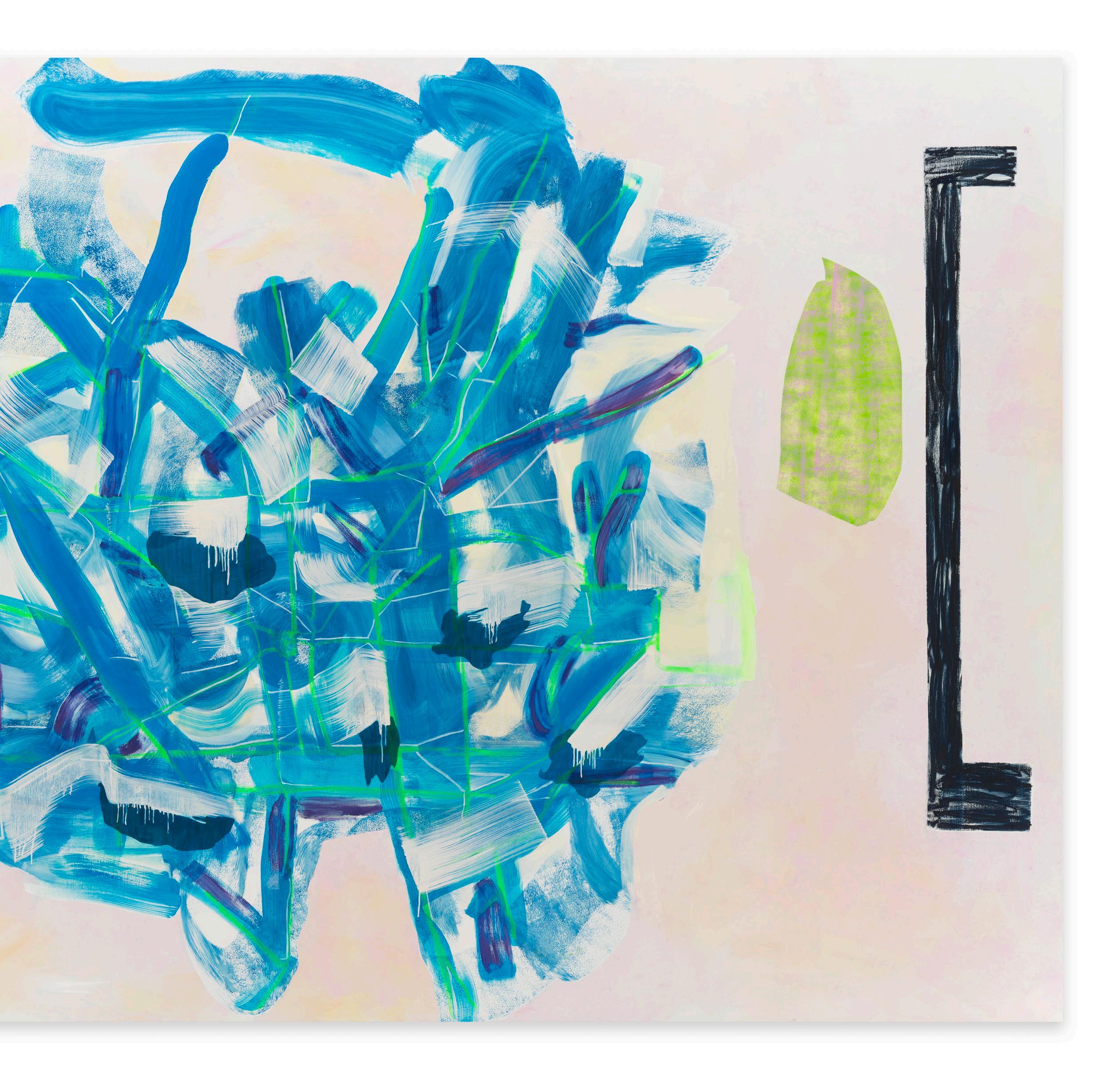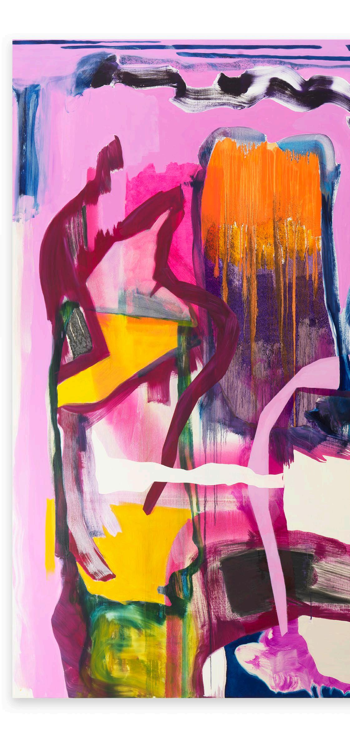 Scale plays a key role in this, too. Since her college days, van Genderen has toed the line between painting and installation. A er graduating from the California Institute of Art in 1991, making large-scale works (that also employed nonconventional materials like vinyl) seemed a useful way to a ack the “problem” of painting as it stood at the time. But large-scale works also facilitated a bolder stance, one capable of competing with the sculptural and conceptual practices then so dominant, enabling a woman artist to take up more space both literally and metaphorically. This aspect, always underpinning van Genderen’s work, is also what gives it a sense of rebelliousness and joy that in turn takes on a political imperative through the use of traditionally gendered and denigrated modes of cra , such as ceramics, described by the artist as a democratic medium, alongside the high art form of abstraction. This is painting that believes in action over words—as both a response to and a remedy for the zeitgeist of today— but is not afraid to delve into the vagaries of action painting and all its historical iterations.