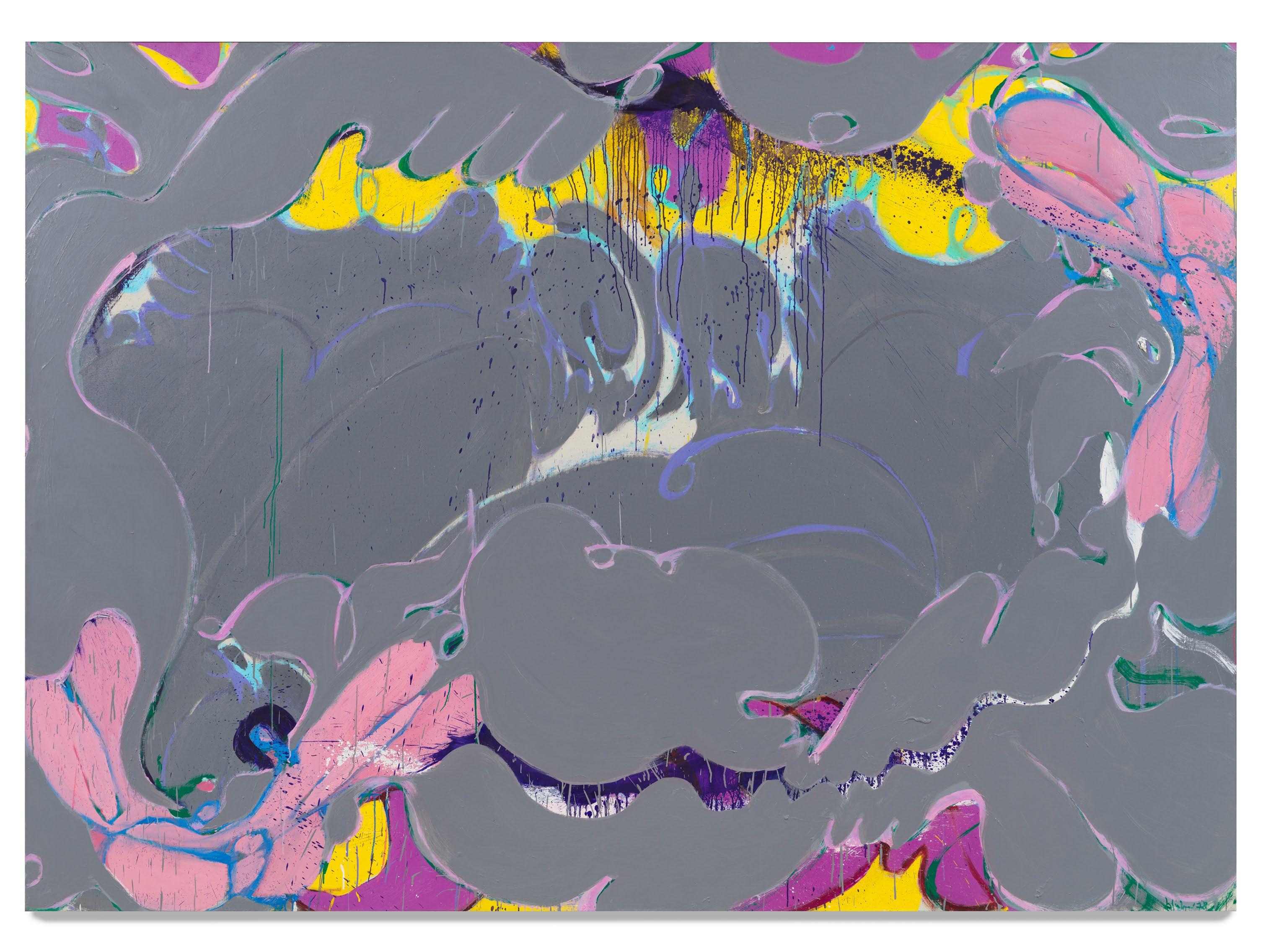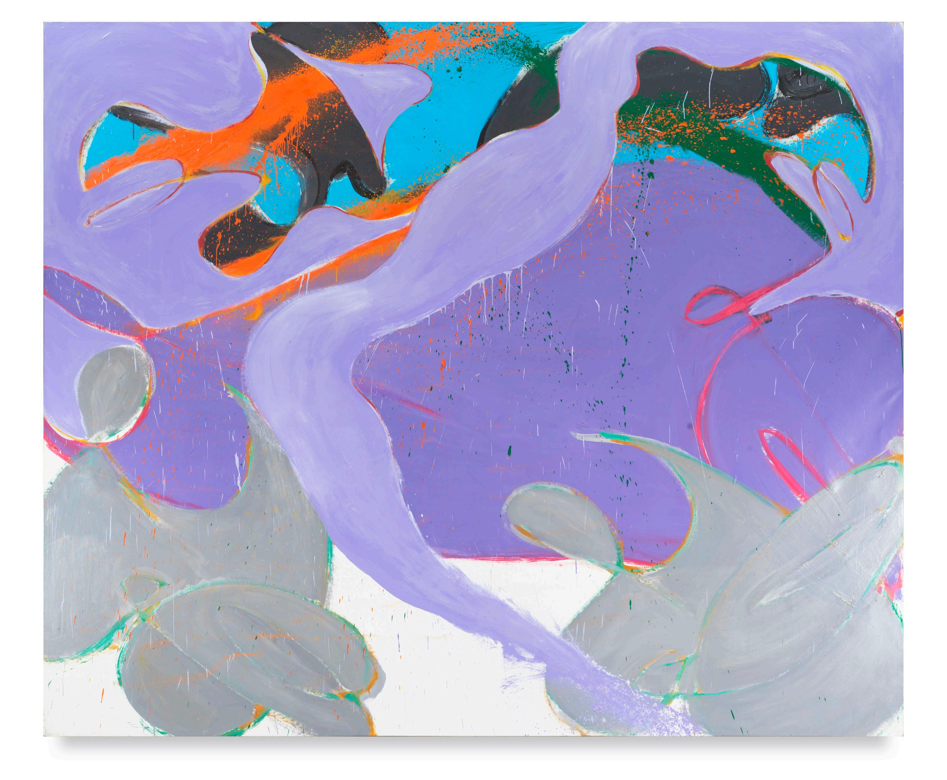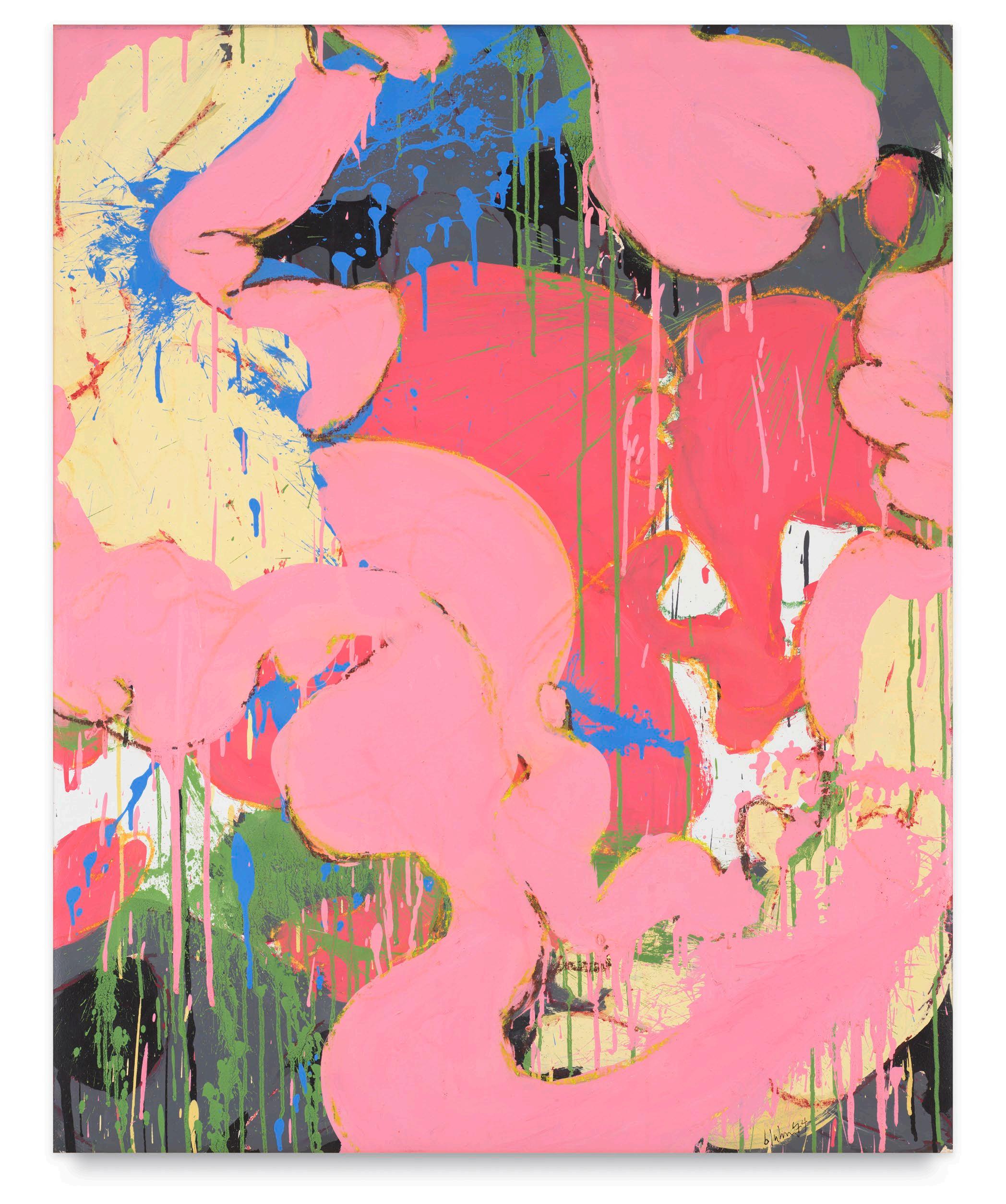This development was not immediate, nor did it take place in the space of a single canvas. Bluhm worked through it. In Philomela (1972), we see snaking stretches of violet interlocking with a collar of black that encloses the bo om half of the canvas, effectively framing loose drips and spla ers of paint. Bluhm articulates the outline of one violet expression as though he were se ing the silhoue e of a reclining nude. There is a kind of loose entanglement of shape that circles the painting’s open and relatively capacious middle area, where swi articulations of the brush, seemingly unmodified, stand out. In Crustadéle (1976) and Milkmaid (1977) we can see a development in Bluhm’s compositions that resulted in denser spaces, where awkward and tense folds of color are pressed up against one another. Particularly in Milkmaid, where pastels of yellow and pink weave into and overlap with each other, we can get a sense for how these paintings seem to be working themselves out in real time, as though their composition was provisional, tentative, still to be determined by some internal law.