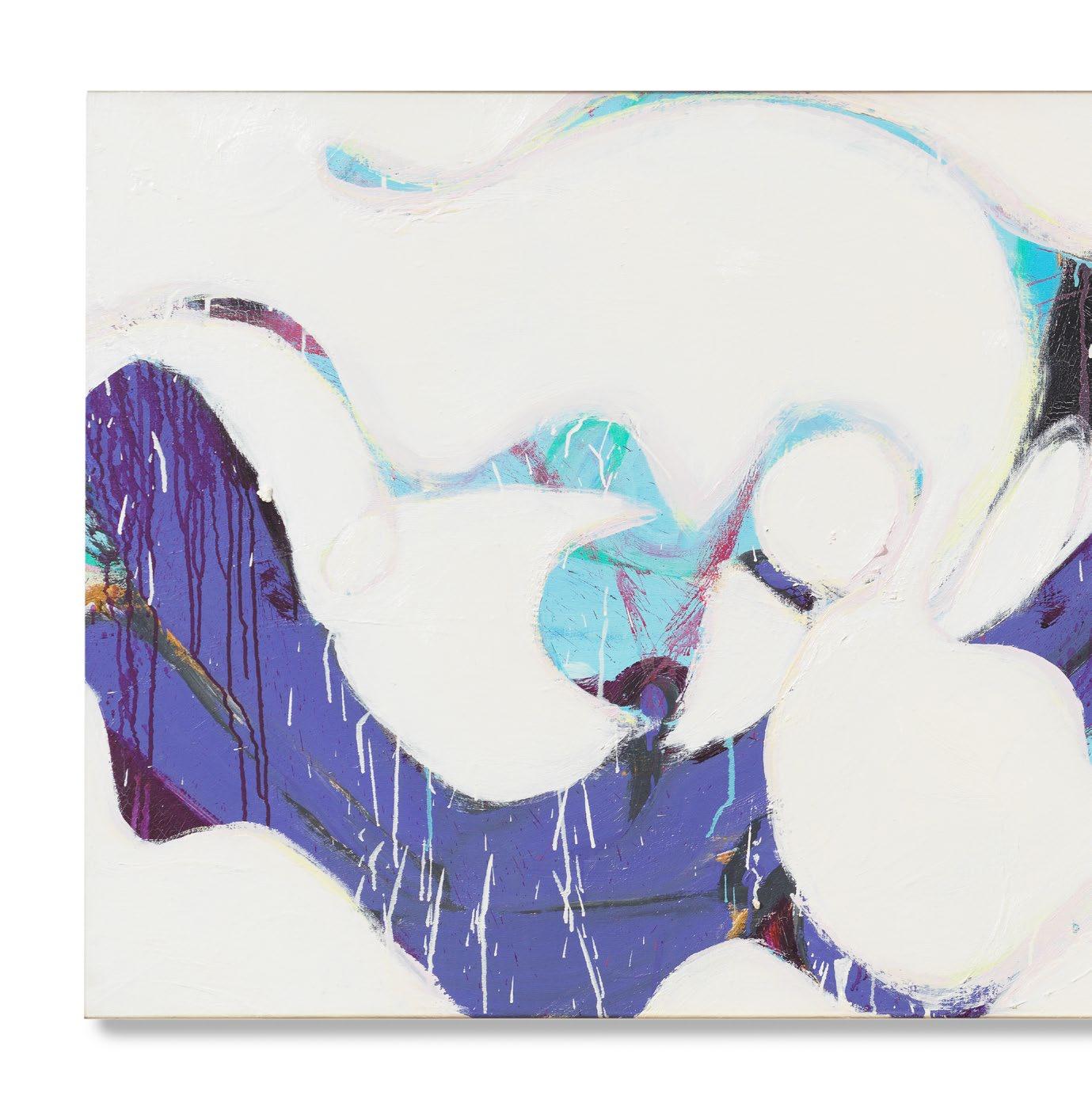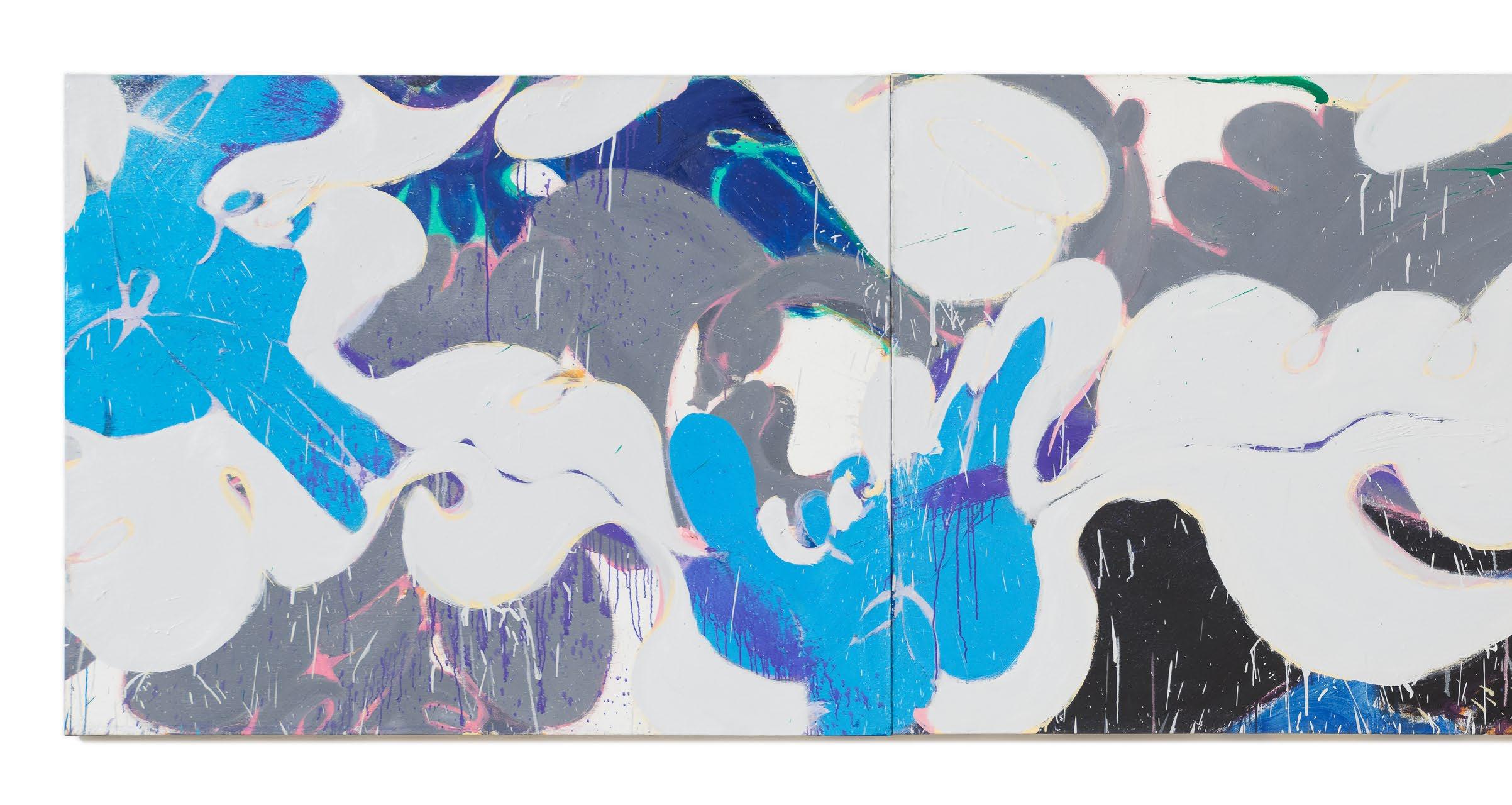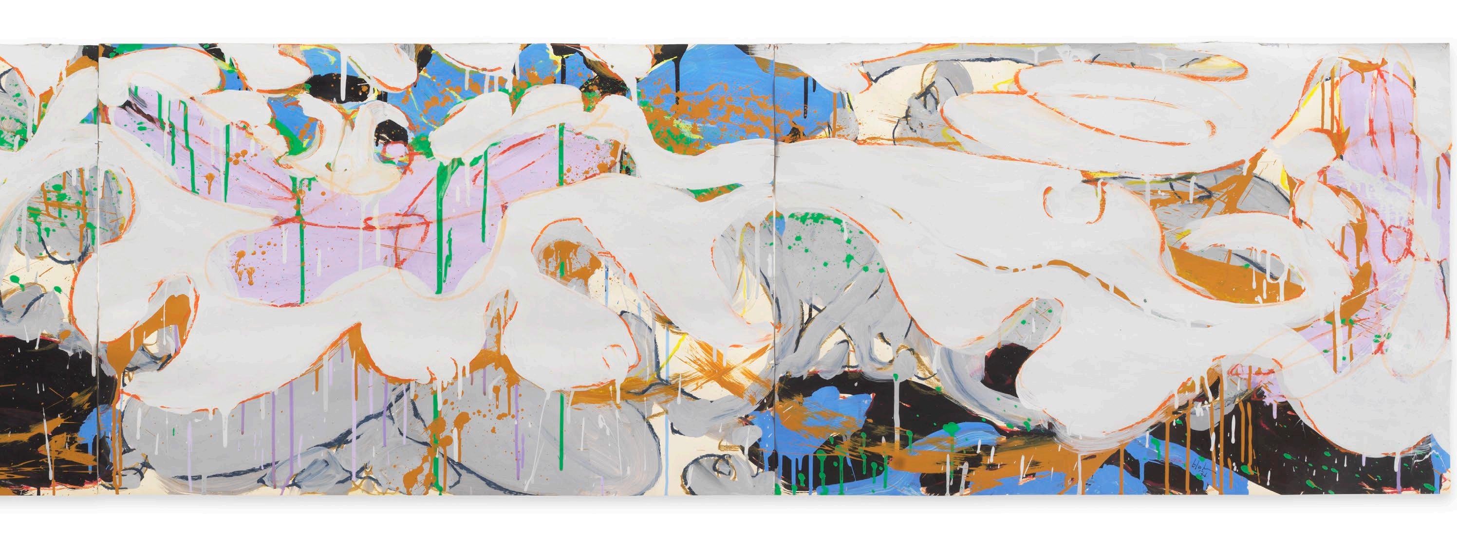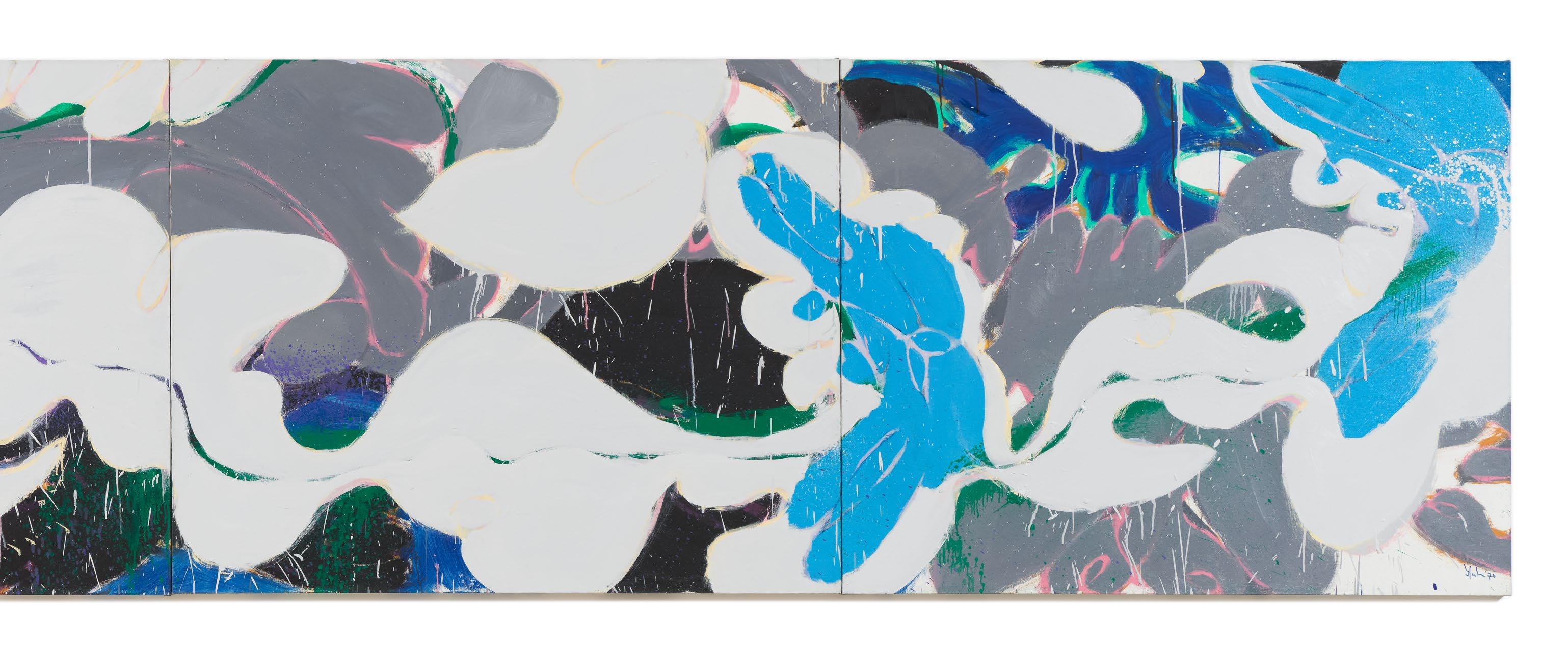 Although Bluhm was no stranger to painting at a grand scale—regularly doing so across several canvases for a single work—as he painted through the 70s he began to emphasize horizontality in a dramatic fashion, particularly in multi-canvas works. Untitled, Studies in Blue, White, Gray, (1975) is a potent expression of this emphasis: stretching across four canvases to measure twenty feet long and, by comparison, only an intimate four feet tall, the painting wrestles together so much of what Bluhm had been working through in relatively smaller canvases up to that point. Fluid forms with sharp contours; a complex and multi-polar composition that seems to burst with improvisation; zones of flat, unmodulated color that are delicately accented with whips and spla ers of paint; formlessness and its inverse. This painting has the restlessness that comes not just from form itself, but from a sense one gets that ideas are being thought through, examined, tried and tested with paint on canvas.