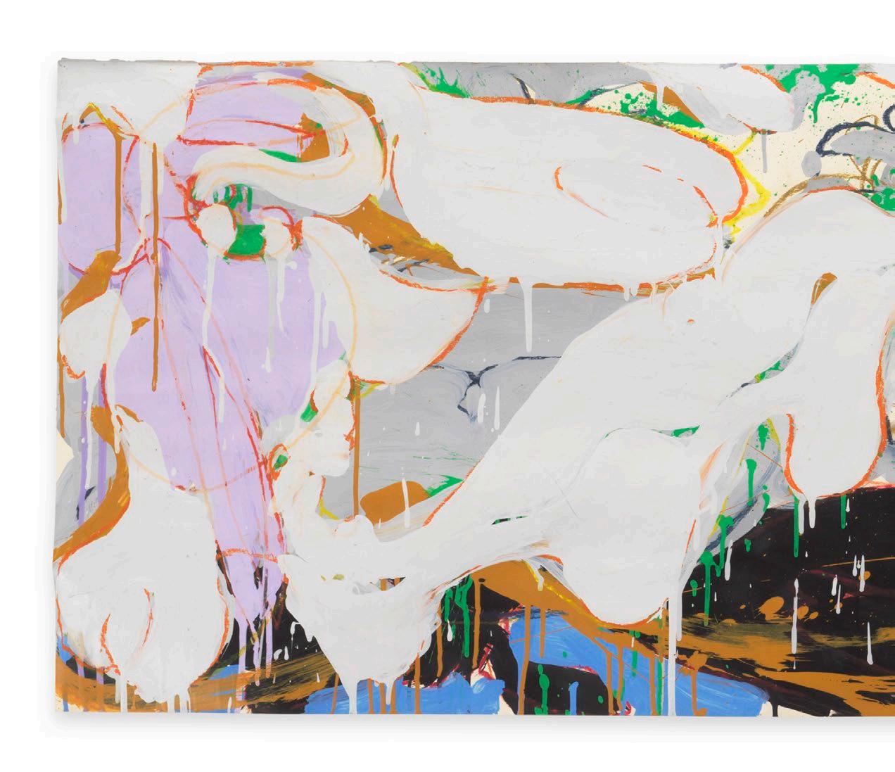 In 1970 Bluhm and his family le New York City for the town of Millbrook in upstate New York. The city was replaced by the countryside, and Bluhm was ready to leave his exploration of freeform, all-over compositions behind in favor of more sinuous, more sensuous, ways of constructing space. Speaking in 1987 about this very period, Bluhm emphasized the expanded role that nude drawing had assumed for him before and a er the move to Millbrook: