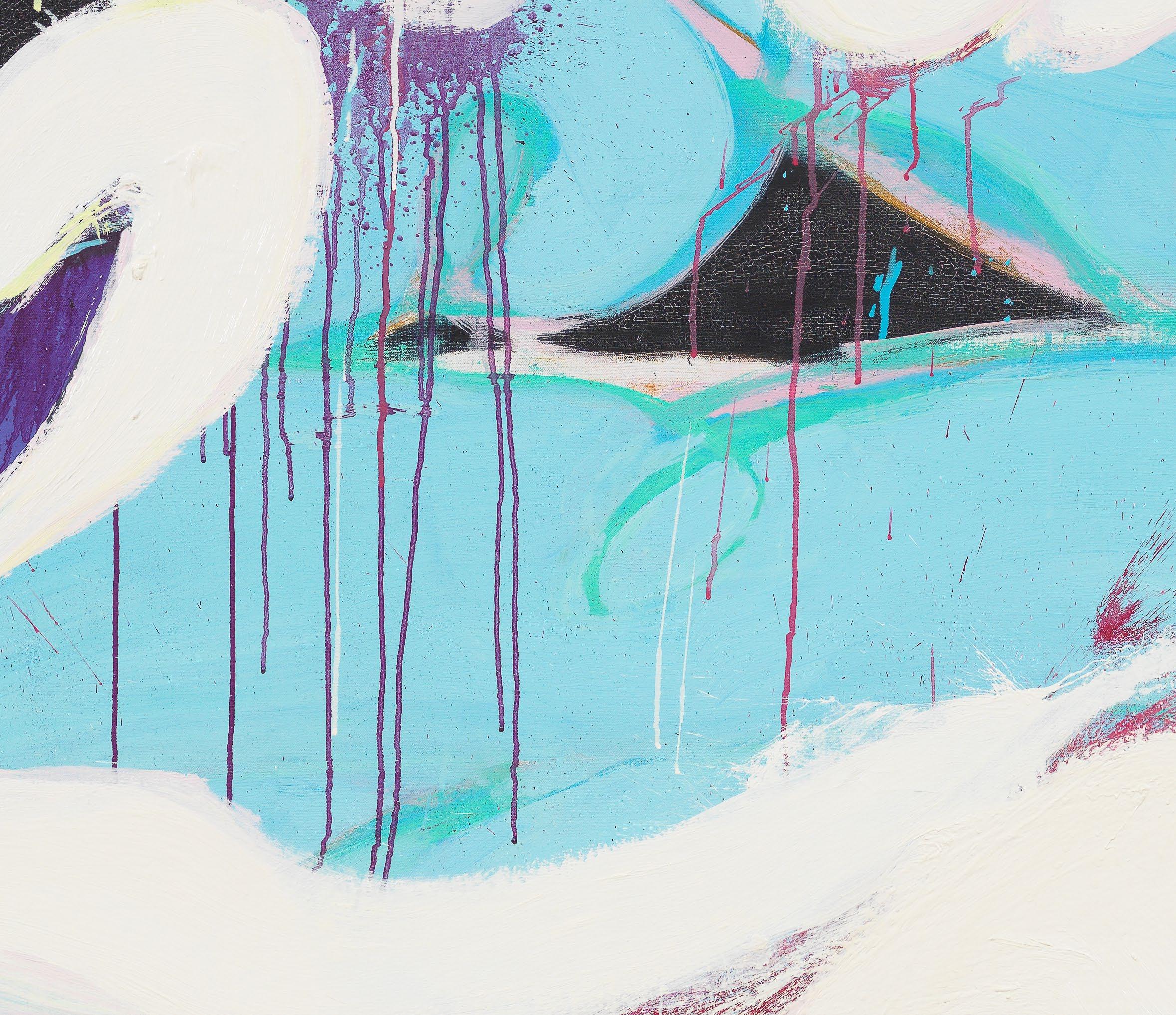 As Bluhm continued to utilize multi-canvas paintings as a way to expand the sheer size that his dramatic acts of form could play out in, the space within the paintings largely remained flat and two-dimensional. Though this was consistent with the prior twenty or so years of painting that he had done, it too would soon be challenged. In Ice Blue (1978) and Viper Lady (1979) our eyes no longer shu le from side to side—instead they move round and round as billowing shapes, now rippling together, enclose centers of solid color marked once again with the quick, assured strokes of his brush, in each instance resembling the top half of a heart. Are we looking upward, past clouds and then to the heavens, or downward into the deep recesses of some bo omless pool of blue?