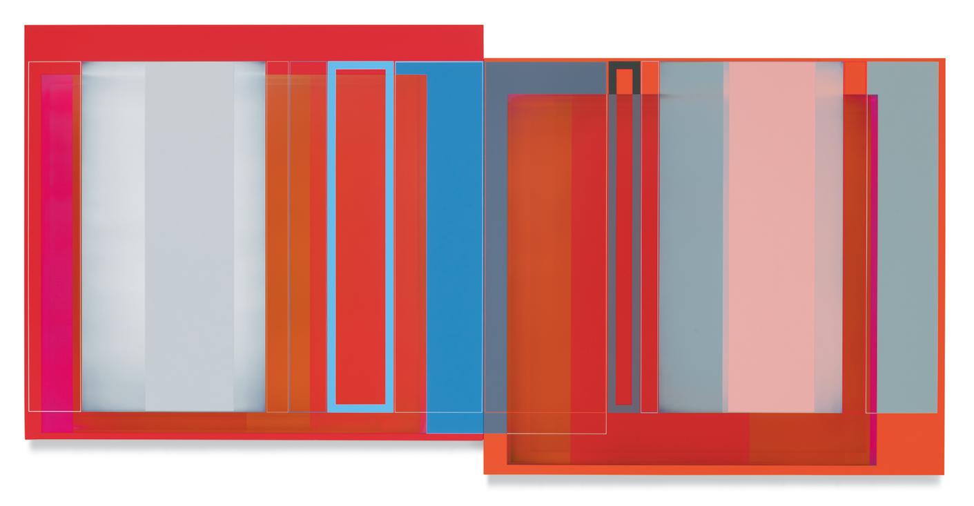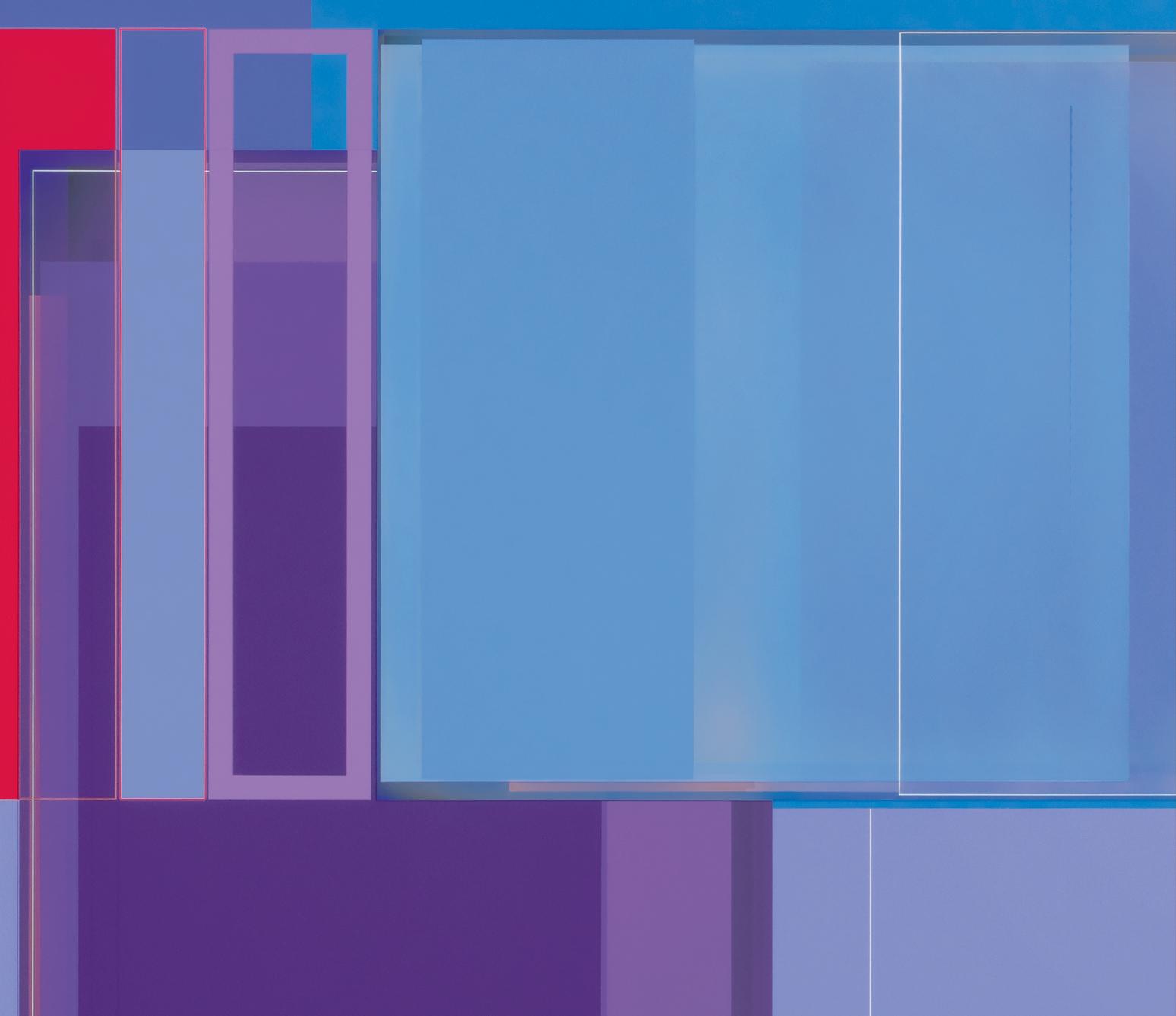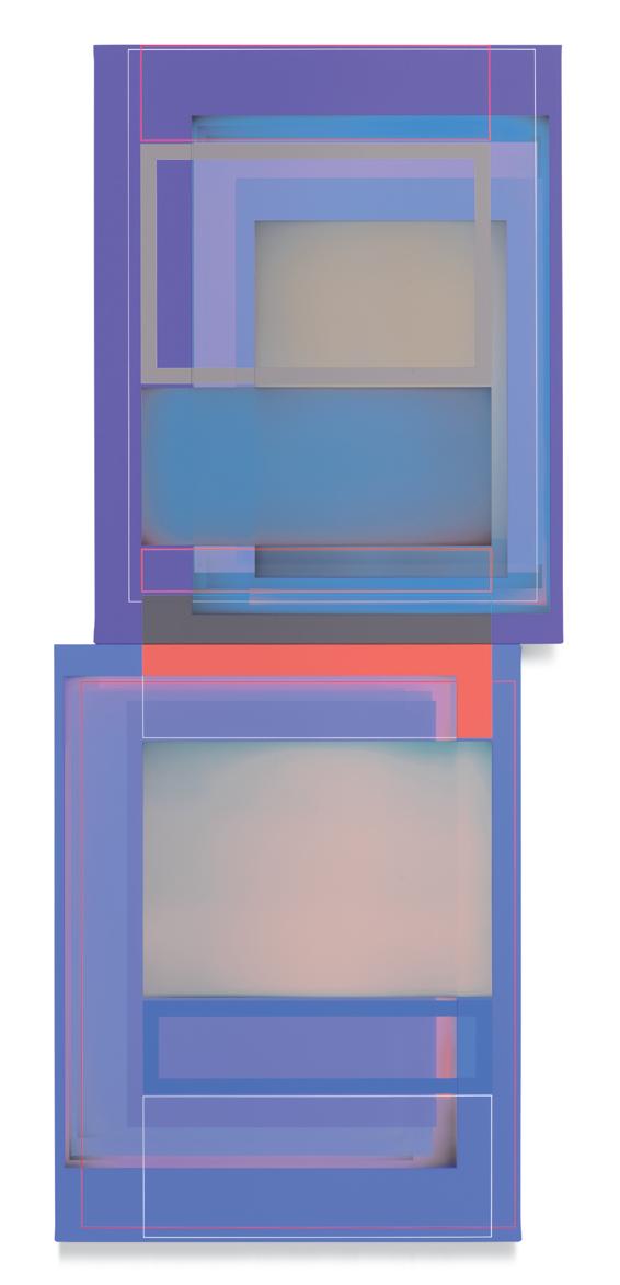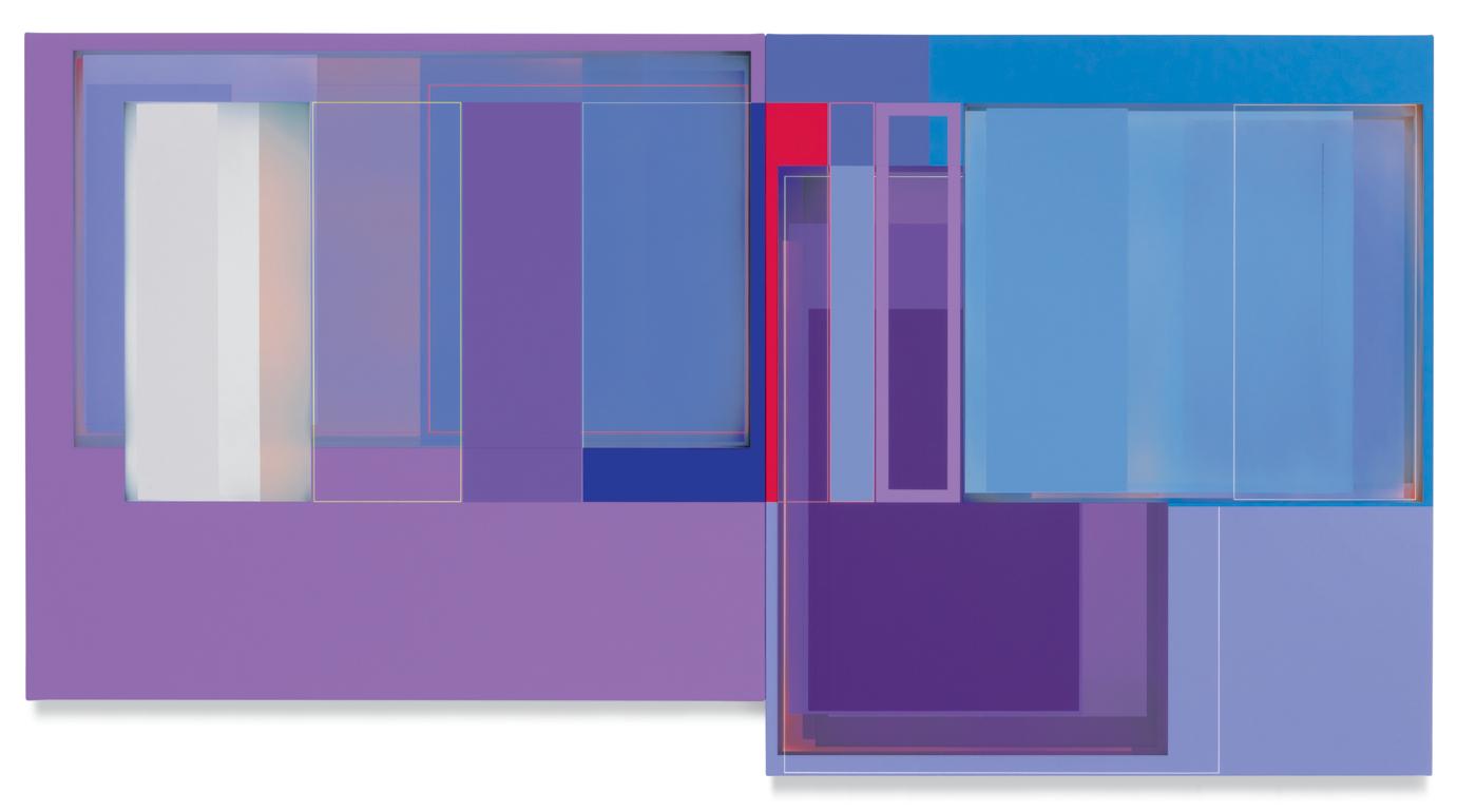 together. A master of color who isn’t shy about keying up the intensity level of brightness and saturation in his palette, Wilson builds up his compositions by using every conceivable size and proportion of rectangle to offset and highlight the other rectangles, with narrow gaps and outlines transformed into dynamic parts of the composition. One of his favorite devices is to exploit the ambiguity of a painting’s depth of field by positioning shapes so they seem to be floating in front of, adjacent to, or behind other shapes, even with all of them appearing to be either opaque or partially translucent. Our cognitive faculties struggle to establish where certain forms are positioned relative to other shapes, but the incoming visual data is both methodically precise and maddeningly ambiguous. In the painting Premium Velocity, two narrow, standing rectangular shapes made by banded outlines stand on opposite sides of a pair of asymmetrically connected panels. One of the rectangles is rendered in red on a blue ground, while the other is blue on red, and as our view shifts from left to right and back again, whichever one we are looking at directly winds up in the foreground, even while our brain gently insists that it needs to be either one or the other.