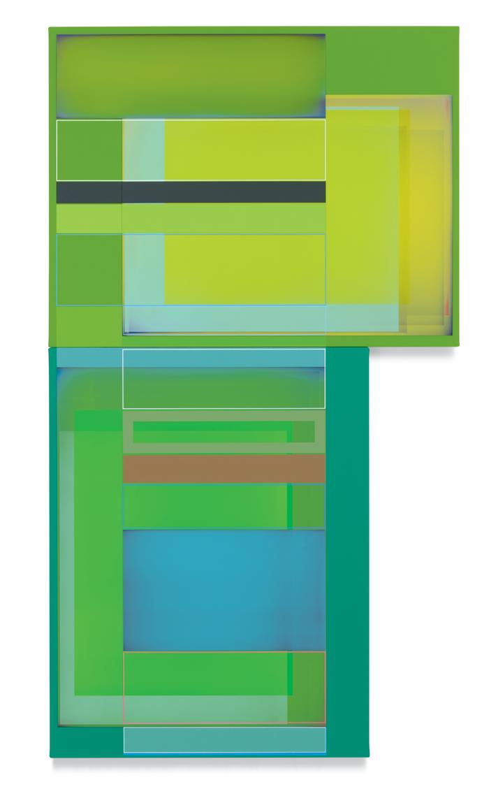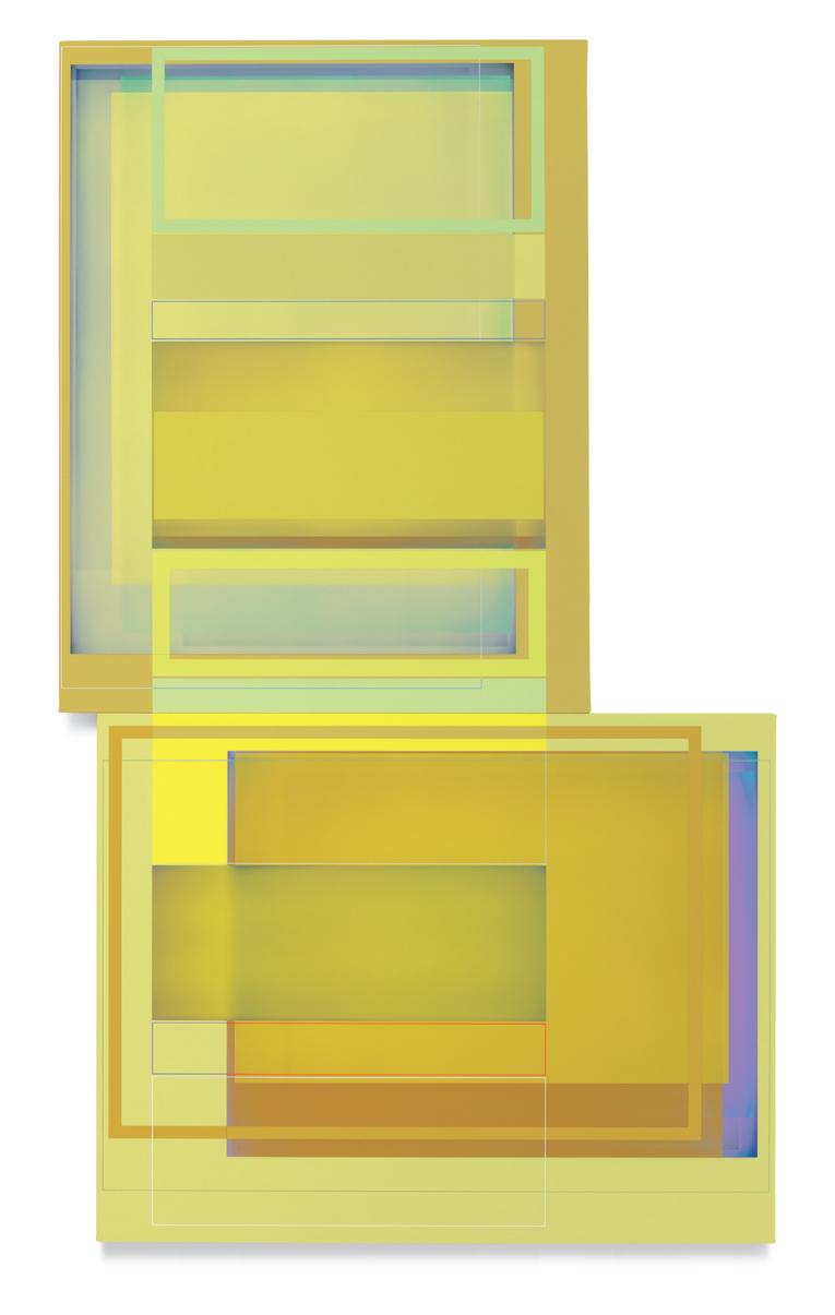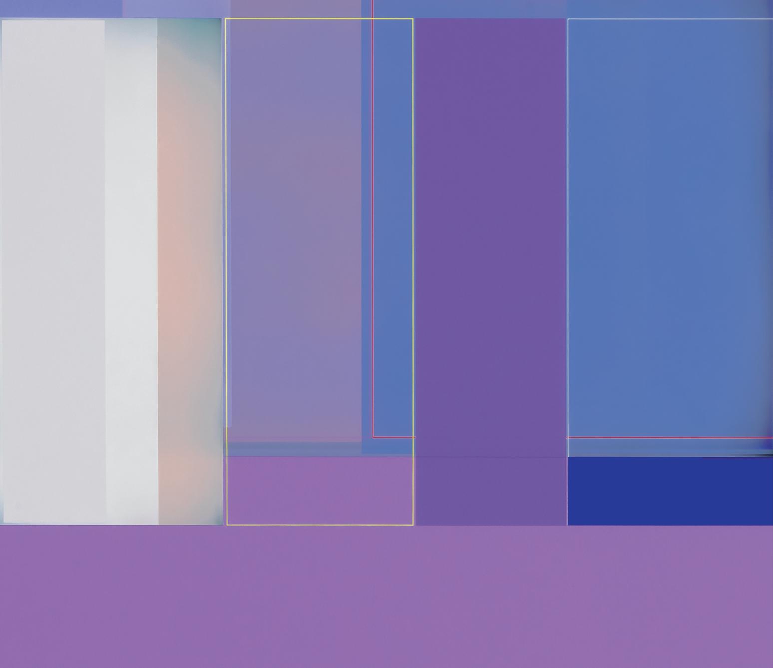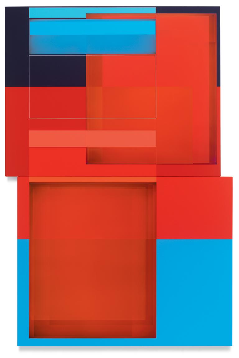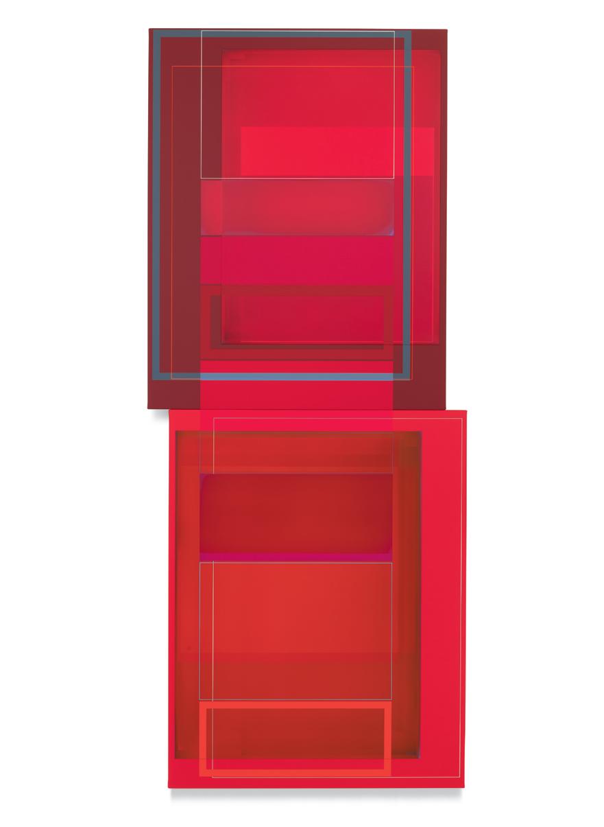 together. A master of color who isn’t shy about keying up the intensity level of brightness and saturation in his palette, Wilson builds up his compositions by using every conceivable size and proportion of rectangle to offset and highlight the other rectangles, with narrow gaps and outlines transformed into dynamic parts of the composition. One of his favorite devices is to exploit the ambiguity of a painting’s depth of field by positioning shapes so they seem to be floating in front of, adjacent to, or behind other shapes, even with all of them appearing to be either opaque or partially translucent. Our cognitive faculties struggle to establish where certain forms are positioned relative to other shapes, but the incoming visual data is both methodically precise and maddeningly ambiguous. In the painting Premium Velocity, two narrow, standing rectangular shapes made by banded outlines stand on opposite sides of a pair of asymmetrically connected panels. One of the rectangles is rendered in red on a blue ground, while the other is blue on red, and as our view shifts from left to right and back again, whichever one we are looking at directly winds up in the foreground, even while our brain gently insists that it needs to be either one or the other.
