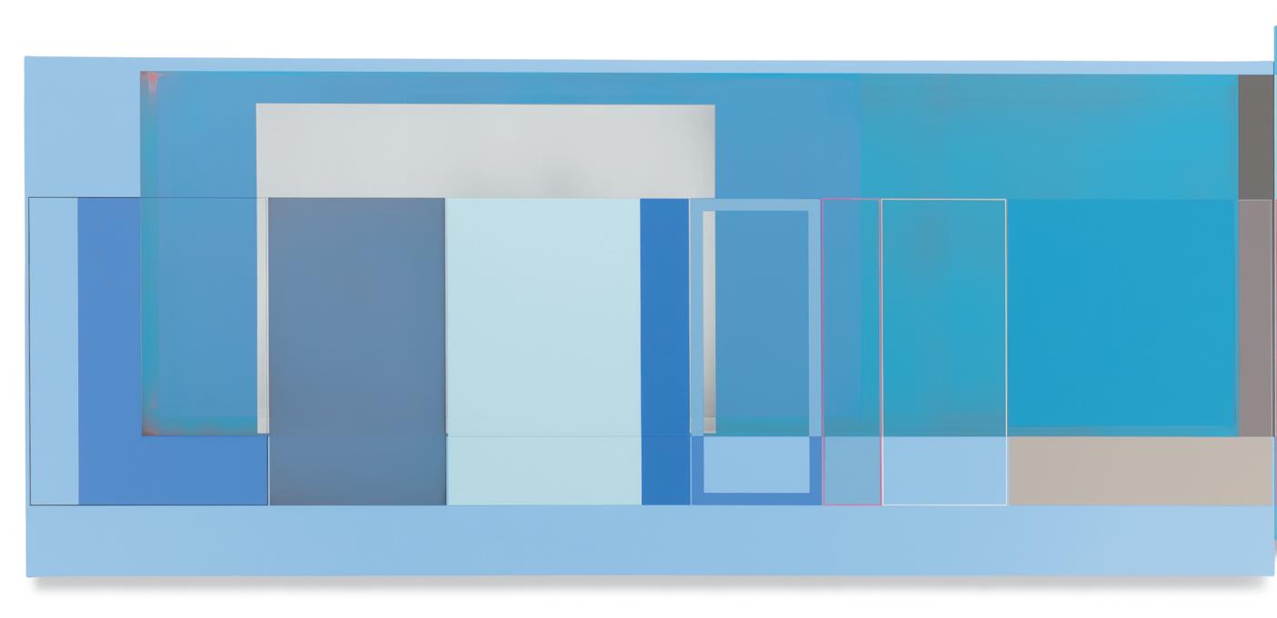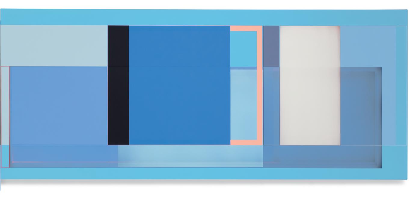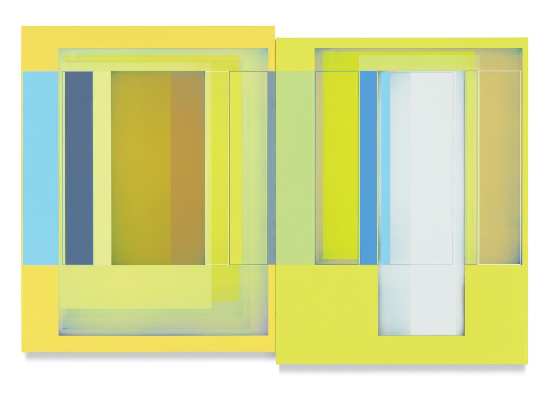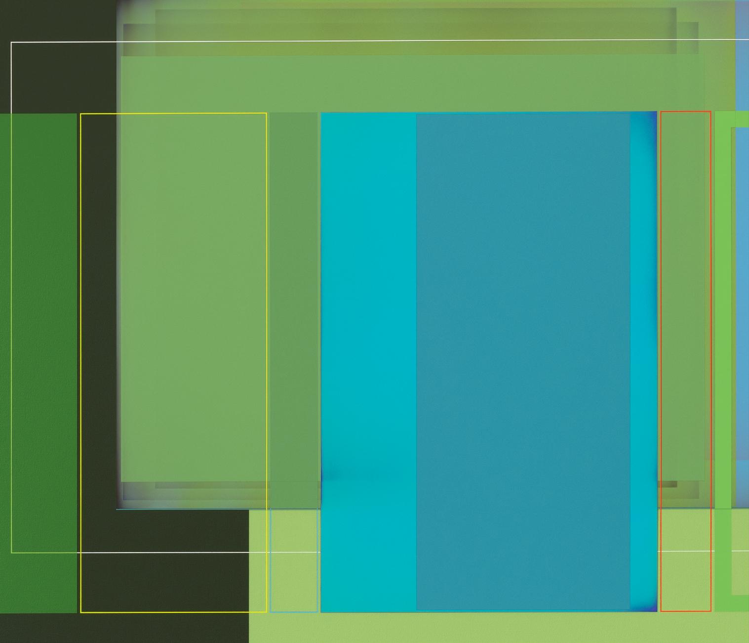 together. A master of color who isn’t shy about keying up the intensity level of brightness and saturation in his palette, Wilson builds up his compositions by using every conceivable size and proportion of rectangle to offset and highlight the other rectangles, with narrow gaps and outlines transformed into dynamic parts of the composition. One of his favorite devices is to exploit the ambiguity of a painting’s depth of field by positioning shapes so they seem to be floating in front of, adjacent to, or behind other shapes, even with all of them appearing to be either opaque or partially translucent. Our cognitive faculties struggle to establish where certain forms are positioned relative to other shapes, but the incoming visual data is both methodically precise and maddeningly ambiguous. In the painting Premium Velocity, two narrow, standing rectangular shapes made by banded outlines stand on opposite sides of a pair of asymmetrically connected panels. One of the rectangles is rendered in red on a blue ground, while the other is blue on red, and as our view shifts from left to right and back again, whichever one we are looking at directly winds up in the foreground, even while our brain gently insists that it needs to be either one or the other.