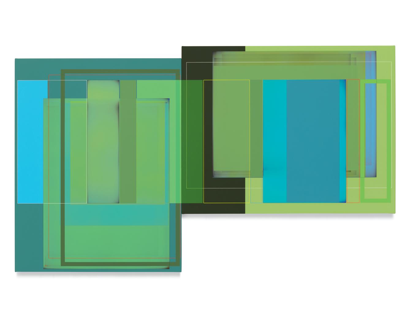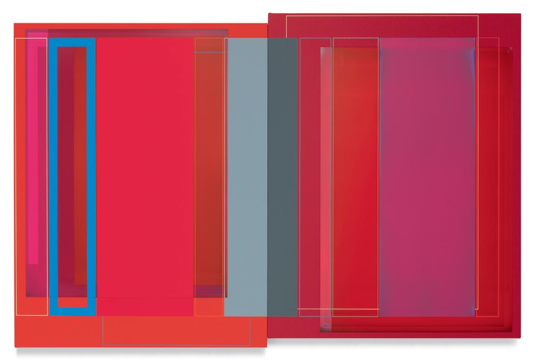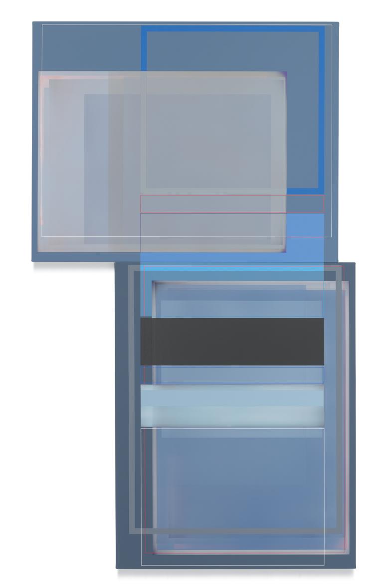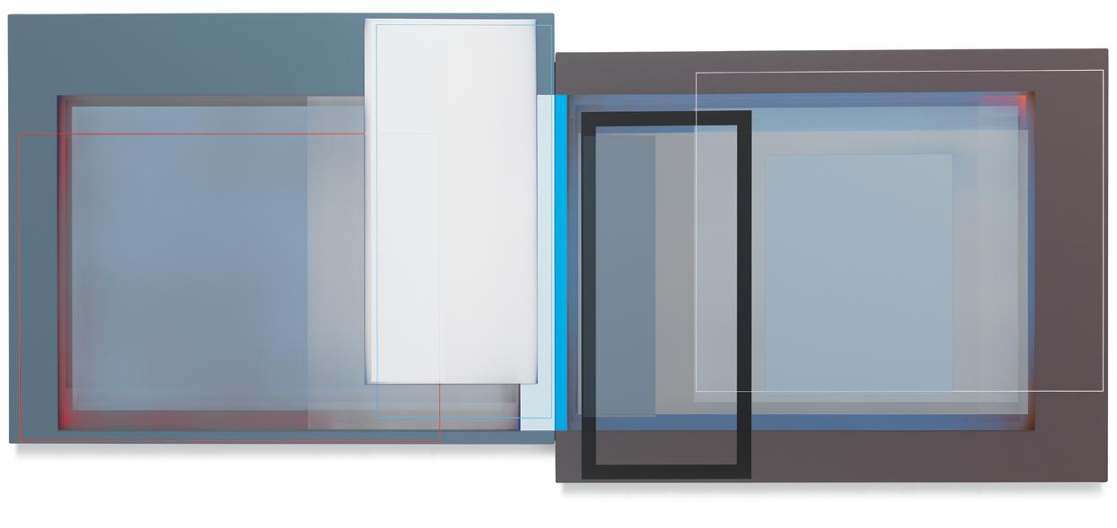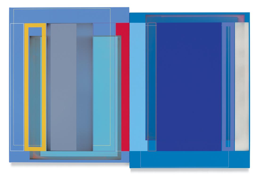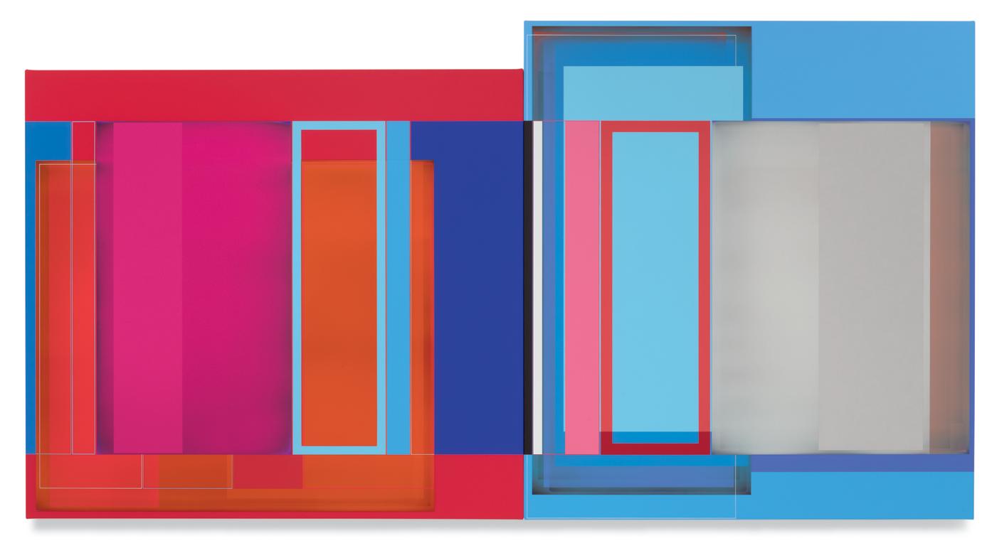 Quite apart from his artistic roots in early abstract painting, and in light of his commitment to a keyed-up, almost visceral, palette, Wilson goes to considerable lengths to avoid the use of color as a tool of perceptual manipulation. His thrumming blues and electric reds are indeed turbocharged in order to stop viewers in their tracks, but purely as an enticement for us to study them more closely and, perhaps, to unpack some of the hidden structural riddles that bind each composition together. That Wilson is presenting pairs of rectangles to contemplate in place of singular images slyly underscores the simple reality that our view of the outer world is through pairs of eyes, while our brains do the job of stitching the separate data streams into a unified field of perception. Conversely, the diptychs appear to be most in sync with us when our gaze is actively traversing them back and forth, or up and down. That leads us to the conditional suspension of disbelief that in turn gives us the short-term ability to keep two autonomous pictorial compositions in our range of vision at the same time. Geometrically derived abstraction is barely a hundred years old, and yet somehow it has managed to reinvent itself with each passing era. At this juncture in the 21st century, when constant digital bombardment has the infinite potential to induce a numbing sensorial fatigue, abstract painting as Patrick Wilson practices it astutely demonstrates that it can be more than a match for the visual cacophony of the streaming age—primarily by seducing our eyes into doing the journeying for us.