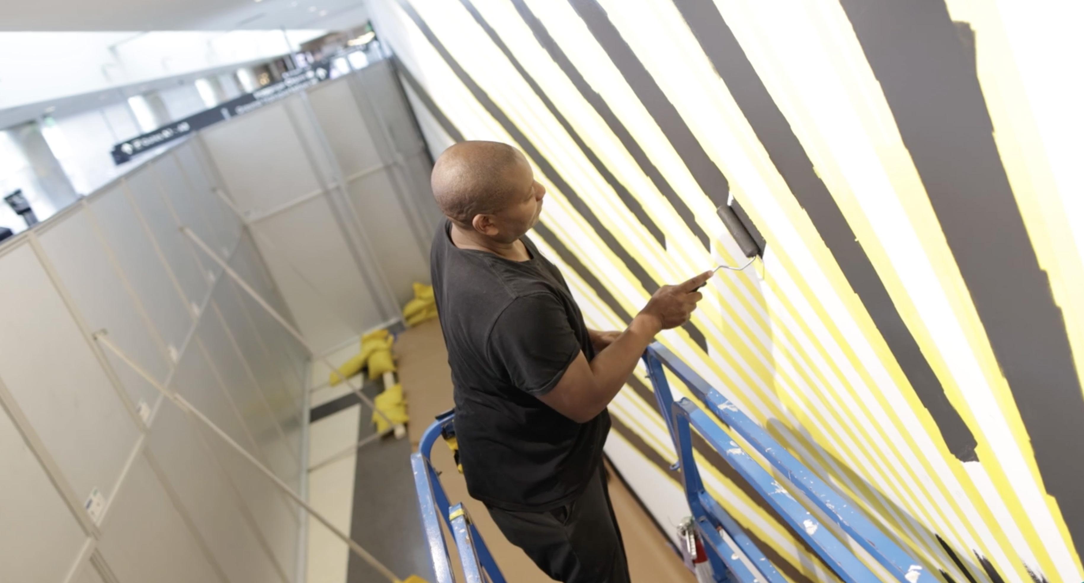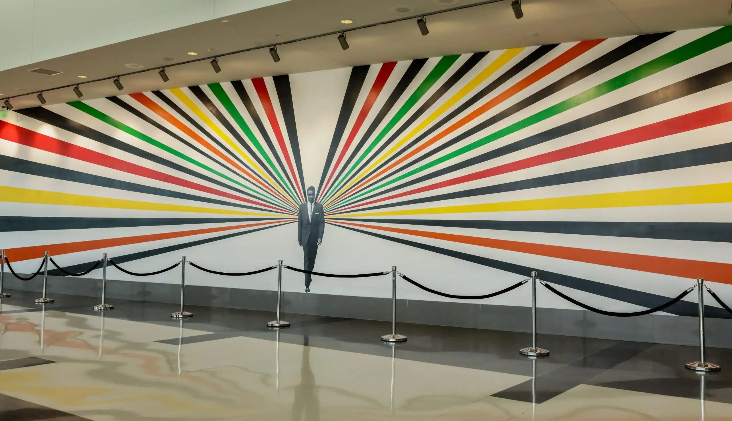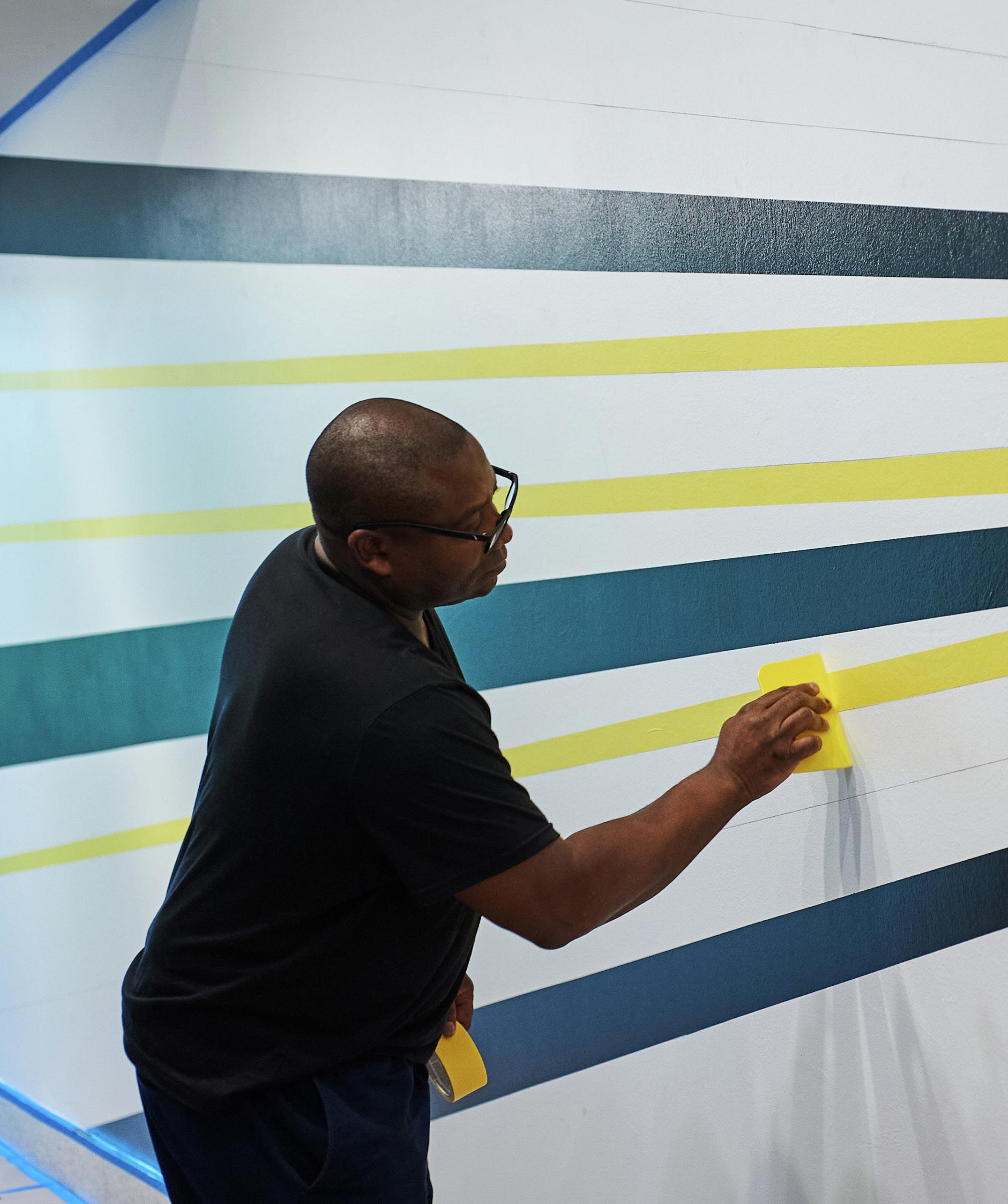 Gatson studied sculpture at Yale and graduated in 1991, beginning his painting practice in the early 2000s. By 2016 Gatson became involved with public art installations, and other large-scale projects. As a self-described, “sculptor who paints,” Gaston’s work is exemplary of hard-edge abstraction, a category that initially connotes contrast—edges or lines and geometric forms are often considered counterintuitive to abstract formation. However, within the legacy of Black abstraction—specifcally artists in the Washington School, such as Sam Gilliam, Kenneth V. Young, and Emma Amos—the presence of opacity needn’t ameliorate a capacity of focused vision. In a memorable public project, Gatson’s work was featured on various walls and columns throughout New York Penn Station under the title Untitled (Collective Light Transfer). Gatson’s signature infusion of geometric compositions, primary colors and overall tone of movement creates a vibrant display.
