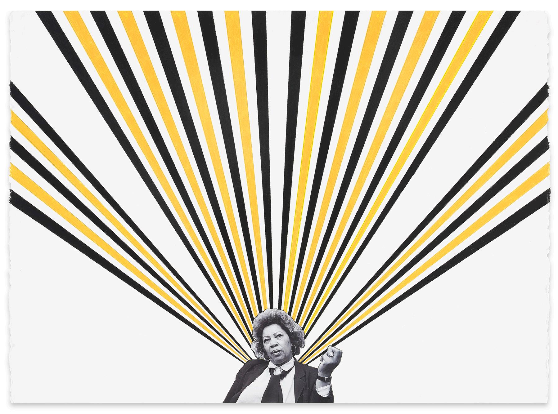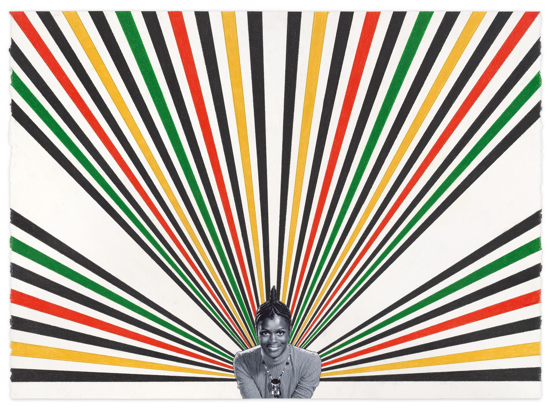 His work that has enjoyed the broadest public reach is his long-running Icons series, which he initiated in 2007. It is celebratory—a contrast to his more somber subject matter, on one level, but also a response to it, attentive to the dialectics of history. These luminous pieces in pencil, each honoring a major fgure in Black culture, music, politics, or social history, are less portraits than, again, energy studies. He renders each by appropriation of a black-and-white archival photograph that he places near the paper’s edge, and from which impeccable beams of color radiate across the page. In his permanent installation for the 167th Street subway station (located at 167th Street and Grand Concourse), eight of these Icons, all with ties to the Bronx, grace the platform wall in glass mosaic.