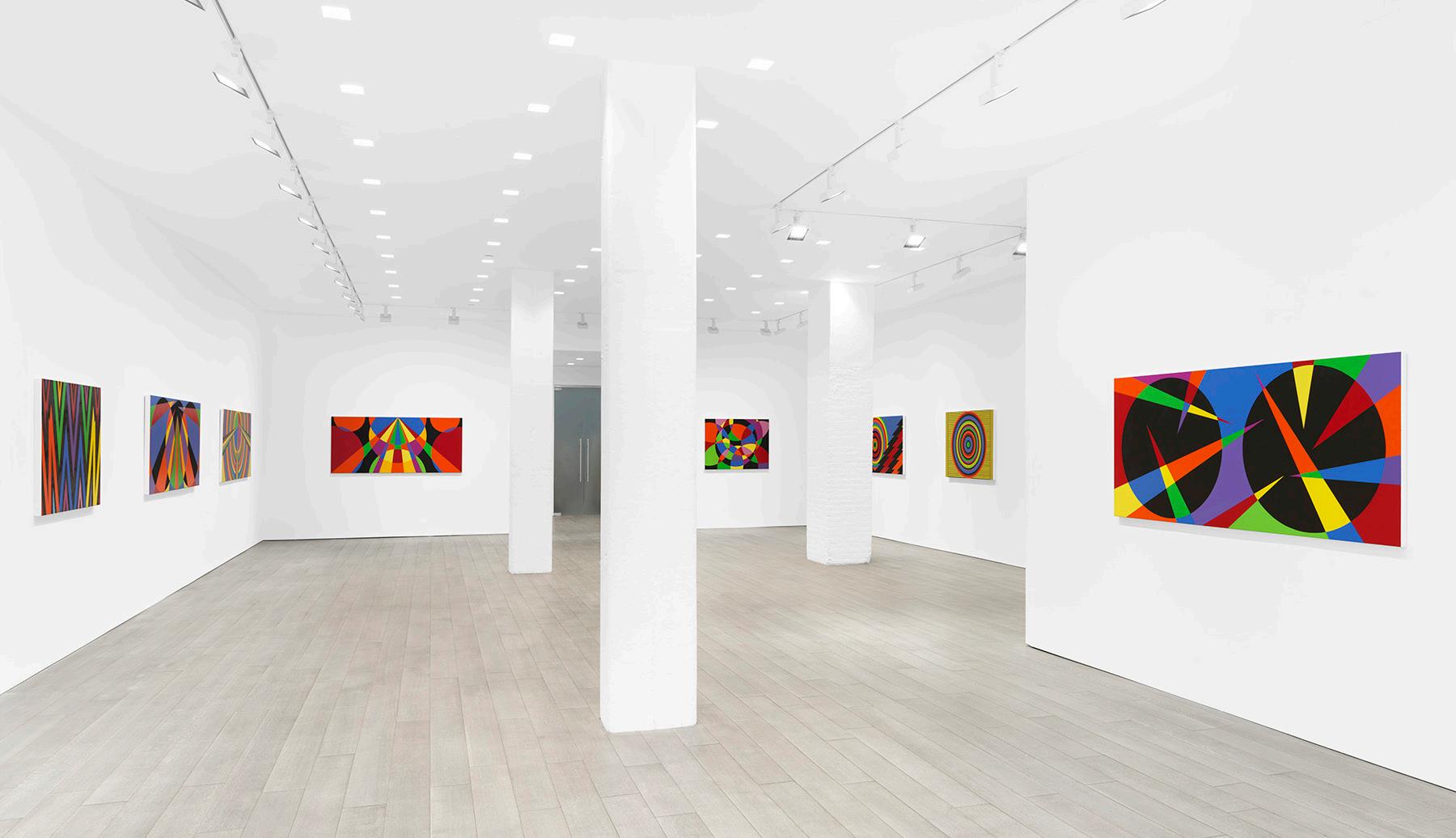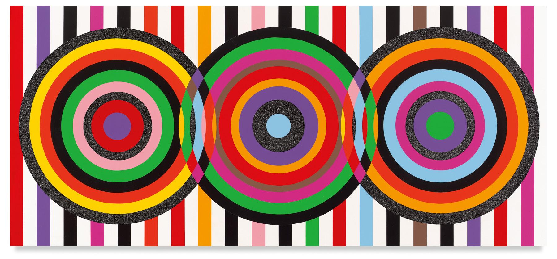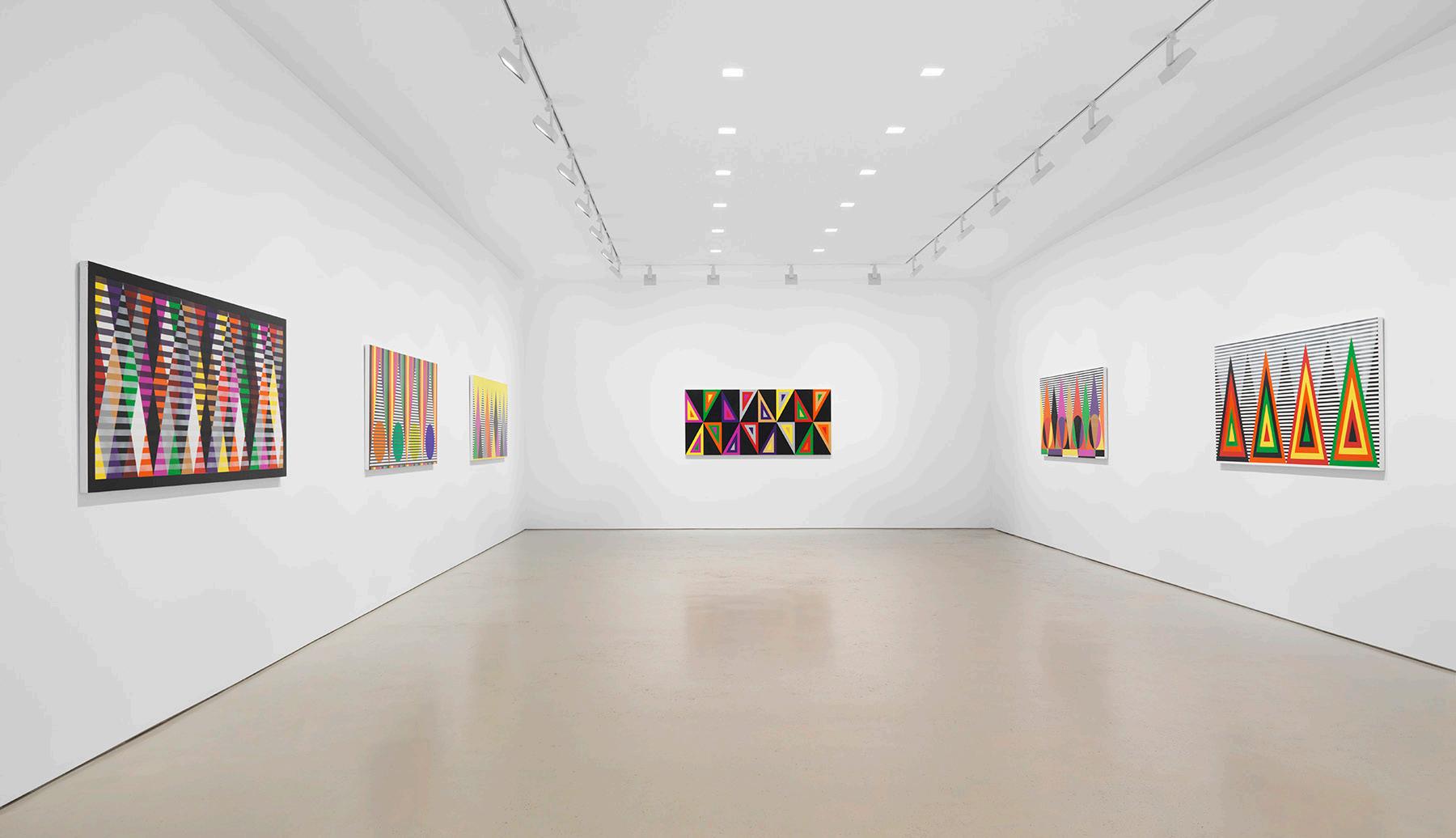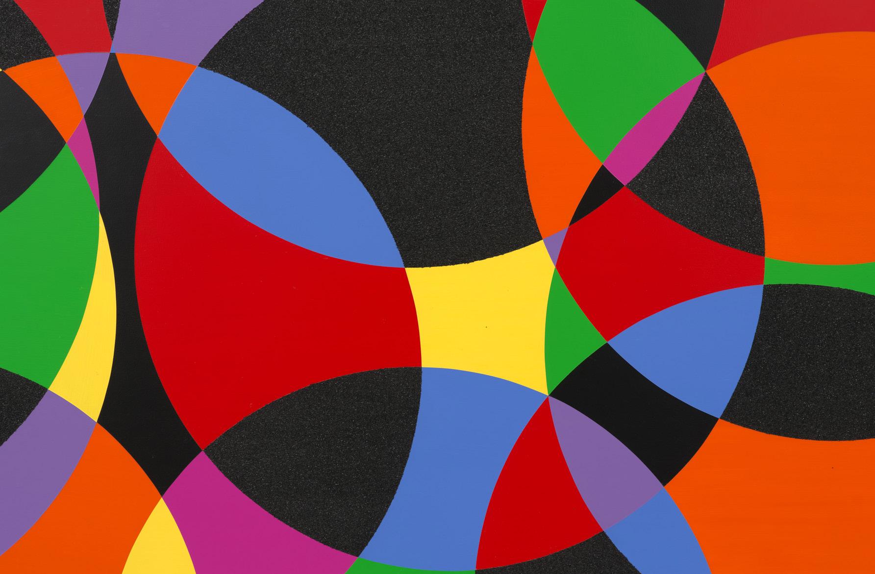 Triangles and inverted triangles, circles of various diameters, vertical or horizontal stripes in negative space, aligned segments, remain his favored graphical tactics to organize the feld. But new things are happening. The overlaps have grown more intense, their geometries more involved. The color decisions are intuitive and irregular. New forms are birthed in the vortex. Some are implicit, relying for their manifestation on the play of optics, the mind’s eye. Others are right there in the design. They break and tumble across the surface. Getting loose. Getting free.