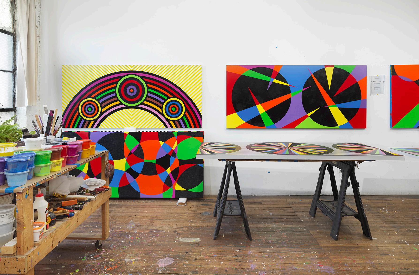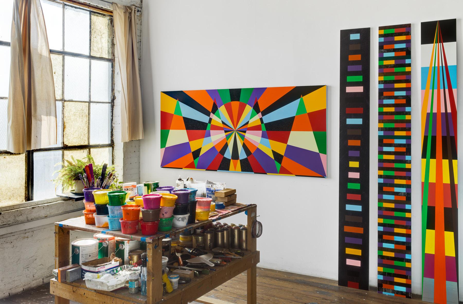 Daylight dances in Rico Gatson’s studio. Several panes of the old industrial window carry a green or gold tint that animates the space, shifting with the weather and the time of day. The rays spark alchemies with Gatson’s paintings in progress—with the polyrhythmic, geometric patterns that organize them, and with their vibrant palette. Lately, the studio has grown ever more vibrant.
