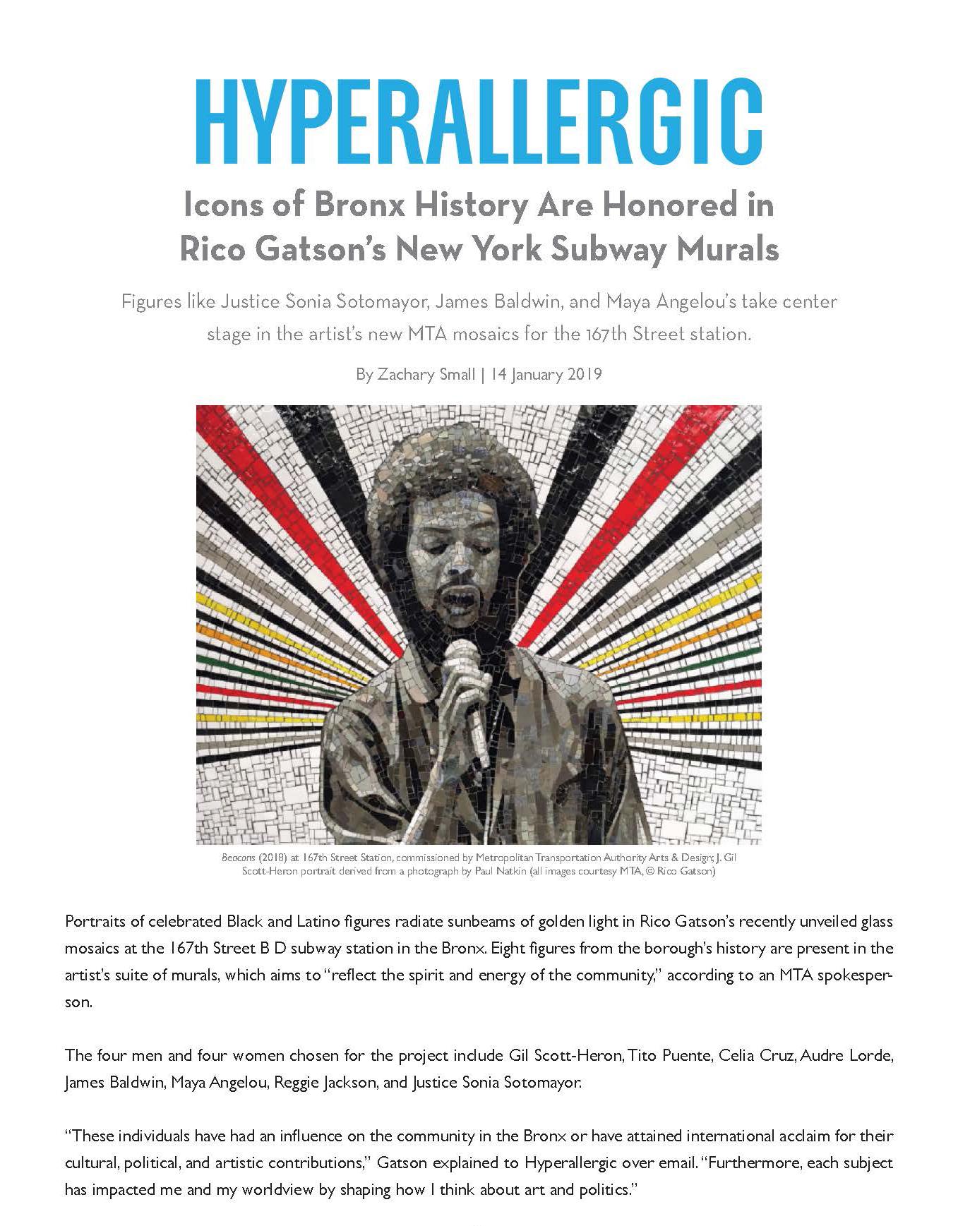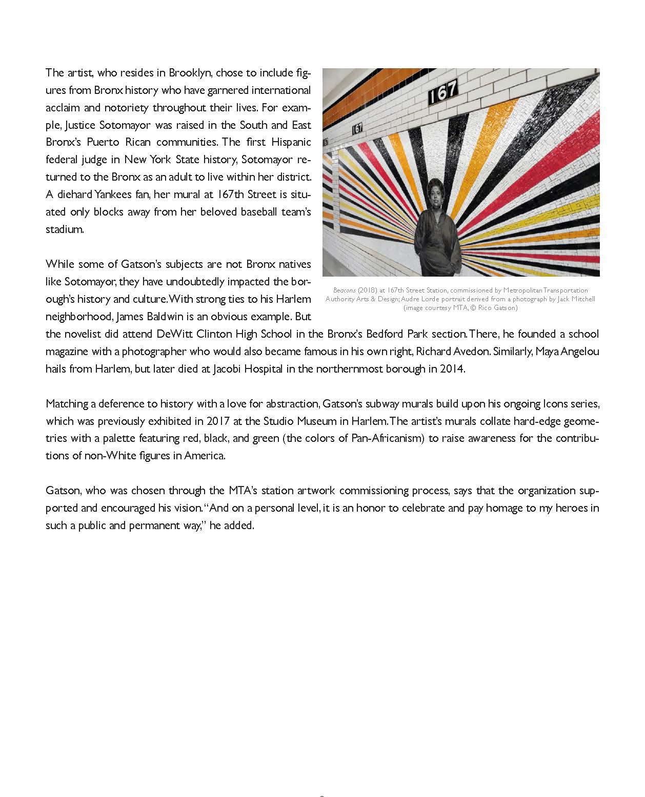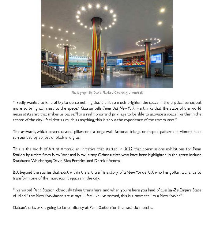 Gatson has been the subject of recent solo exhibitions at the Riverside Art Museum, Riverside, CA; USF Contemporary Art Museum, Tampa, FL; Miles McEnery Gallery, New York, NY; Birmingham Museum of Art, Birmingham, AL; Children’s Museum of the Arts, New York, NY; Metropolitan Transportation Authority, New York, NY; Ronald Feldman Gallery, New York, NY; The Studio Museum in Harlem, New York, NY; Samsøñ Projects, Boston, MA; Studio 10, Brooklyn, NY; and the Wright Museum of Art, Beloit College, Beloit, WI.