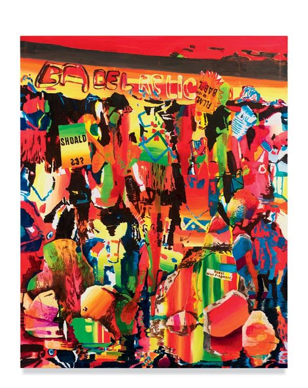 transfer, the new ones take on the images in full, with fewer gridlines. The result is an even more intense sense of overwhelm; it feels as if these paintings—of an exploding party-supply store, a bursting fruit stand, and a thick tropical forest—are shouting at you and threatening to swallow you up.