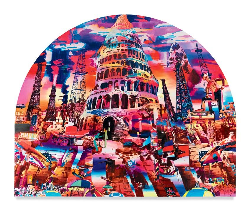 Sprinkled among these madcap images, which build on the work Crow has been doing for around a decade, is an entirely new subject: the Tower of Babel. Three monumental arch-shaped canvases capture the biblical story that explains why humans speak different languages. According to Genesis, our ancestors arrived in the land