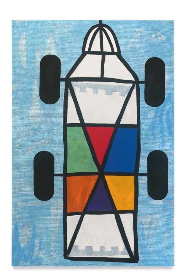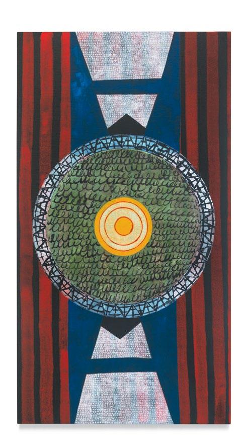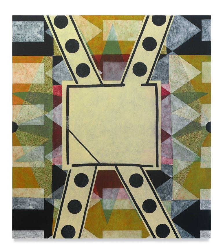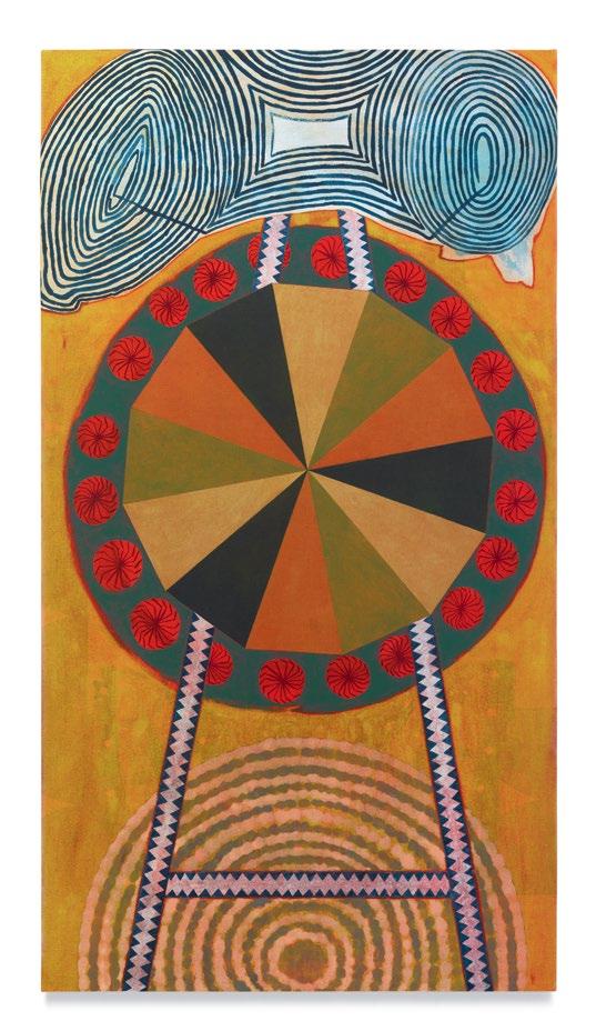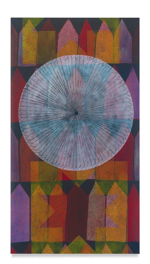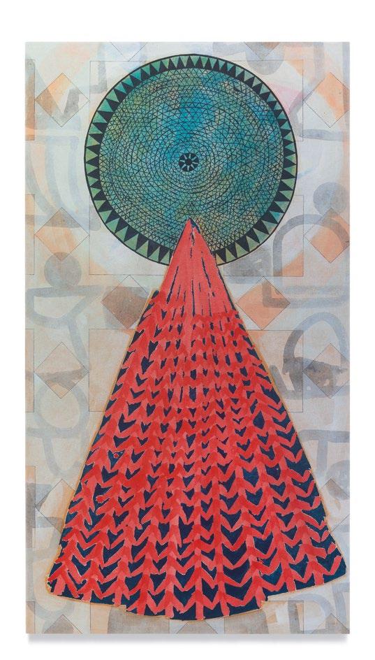 Many of Dowell’s recent paintings track similar trajectories. They have organizing features (circles, diamonds, open umbrellas, crosses, carbide blades) that then wander, dissolve, radiate, run, or simply ease into the pa ern and texture, and the compositional oddities that unseat their primacy. They stare at you, hold you at a ention, then so en and deepen into intricate personalities. Dowell’s canvases, most o en vertical, hold abstraction inside their frames like the beliefs and fantasies of individual brains, so o en laced with idiosyncrasy and speaking in their own dialects.