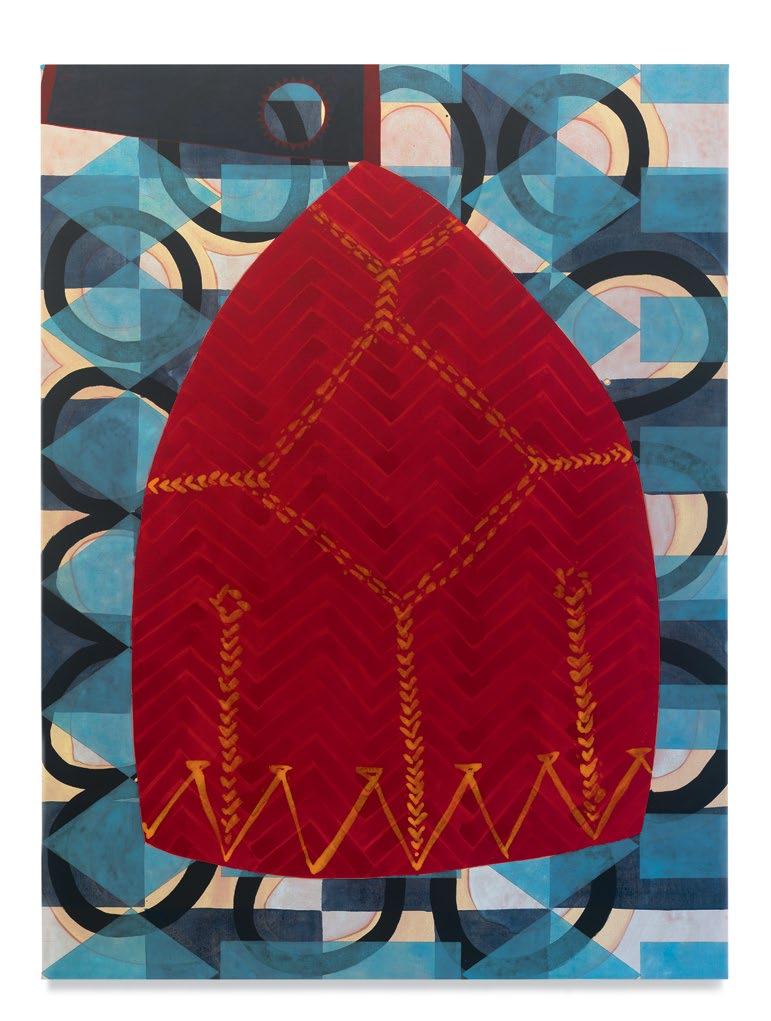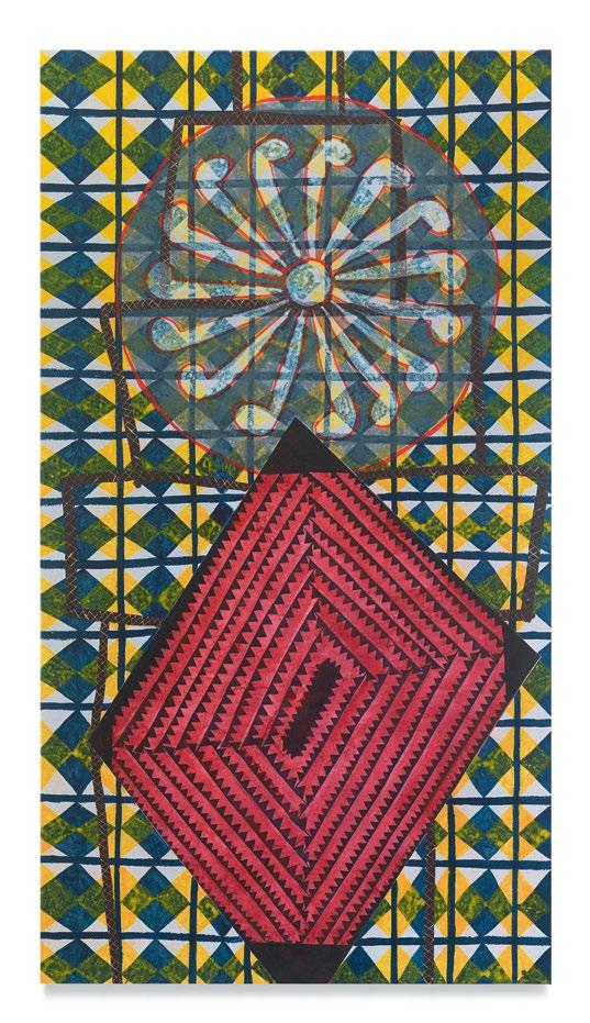 Dowell’s commitment to a nonhierarchical way of gathering and combining images is at the heart of his painting. In speaking with Dowell about what he is drawn to, it is apparent that the textiles of his Quaker ancestry hold equal status with antique board games, that items bought in markets around Los Angeles or around his second home in Mexico have the potential to transmit visual interest as much as an artwork graced with fame. He speaks of three paintings that have held his sustained a ention for years—Paul Gauguin’s Self-Portrait with Halo and Snake (1889), Pablo Picasso’s Portrait of Gertrude Stein (1905–1906), and Alice Neel’s Joe Gould (1933)— but then speaks of the need to move from direct sources into what the images do in and of themselves, beyond their referent.
