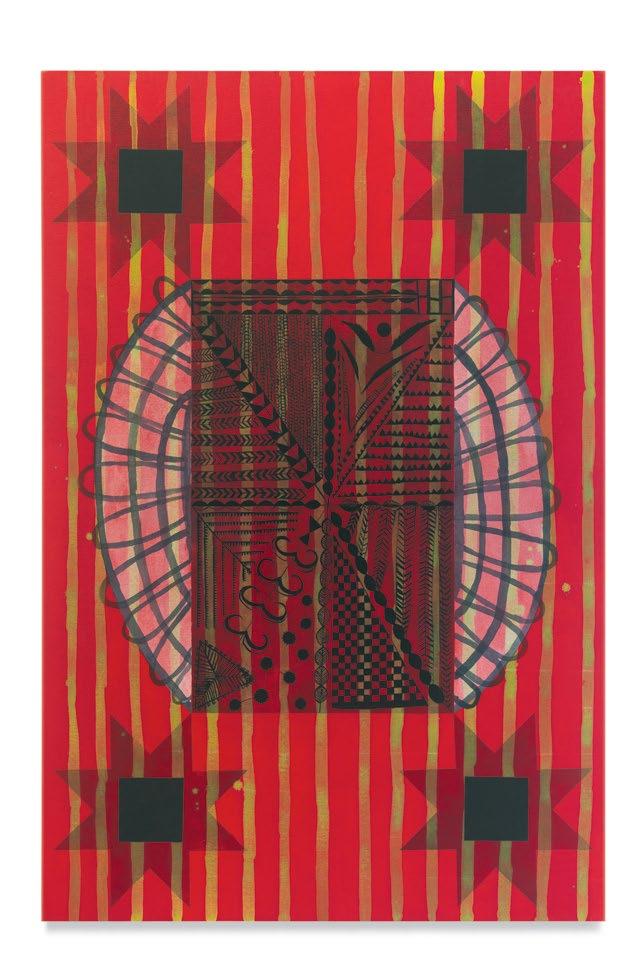 Untitled (2021) begins as one of Dowell’s more rigid designs, but the longer I view it, the more it becomes tender and human. Dowell told me that the composition began with the image of a funeral wreath of flowers held up on a tripod. Whether one knows that or not, the painting is wonderfully redolent of the passing of time, of clocks and tree rings, and of perennials on schedule. Yet this is also somehow a face, wigged perhaps and wearing suspenders. There is something sad presented here, though there is no clear story, no clear ritual, and no clear tradition. In bringing all these shapes and colors together, Dowell’s painting offers a complicated and textured form of mourning, joy, and pain, all at once.