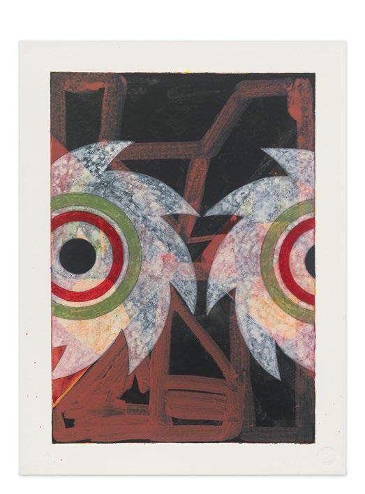 I speak of Karmel’s book at length because I think it is a way into Dowell’s work. Dowell practices in painting what Karmel delineates, and he seems to have understood this nature of abstraction and art historical narrative decades ago. Instead of latching onto a particular theoretical approach or history of abstraction, Dowell, from very early in his career, preferred promiscuous and voracious collage, a layering of diverse and sca ered references from all over the world, both iconic and personal. From his collected starting points, he would intuitively follow the o en