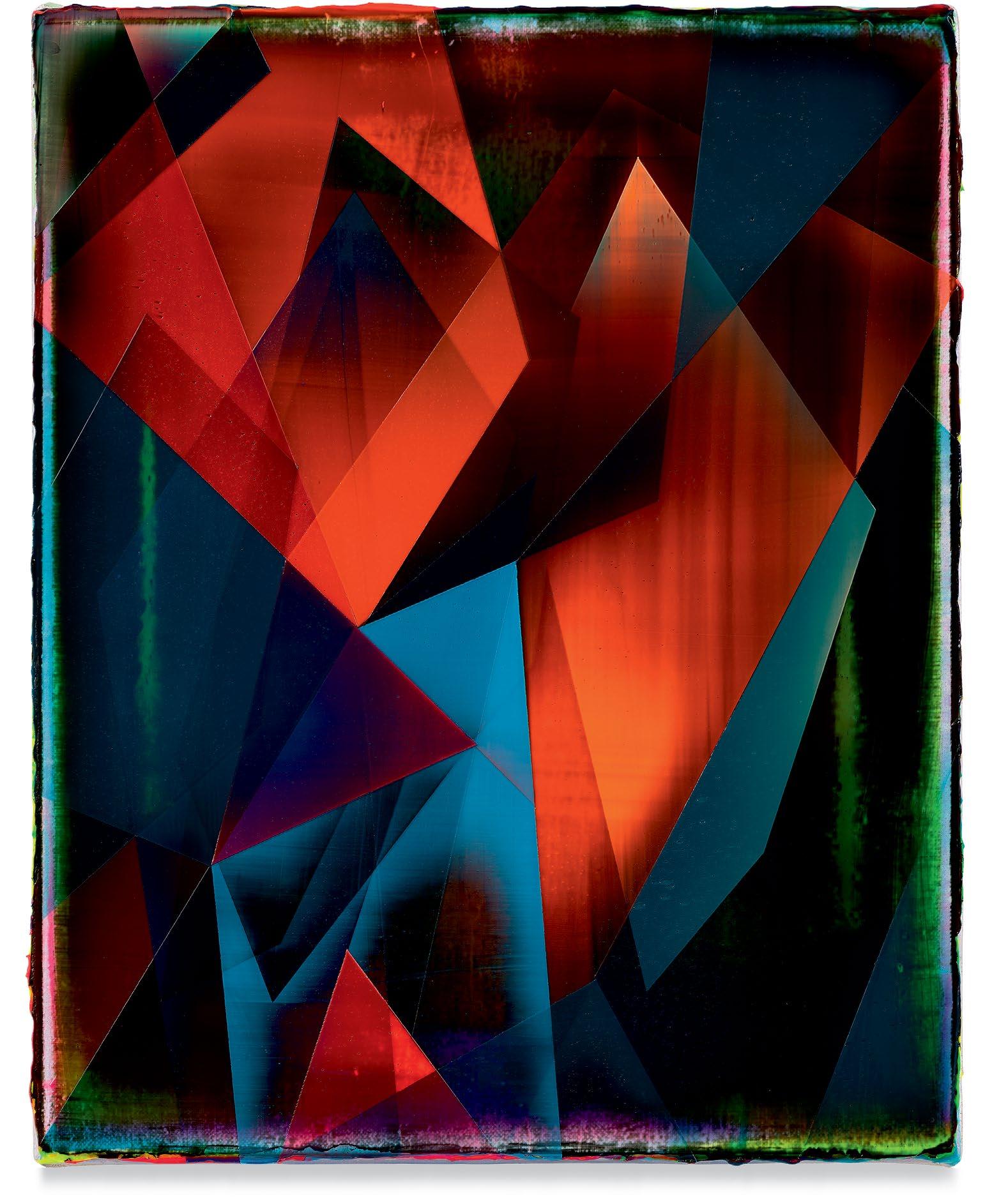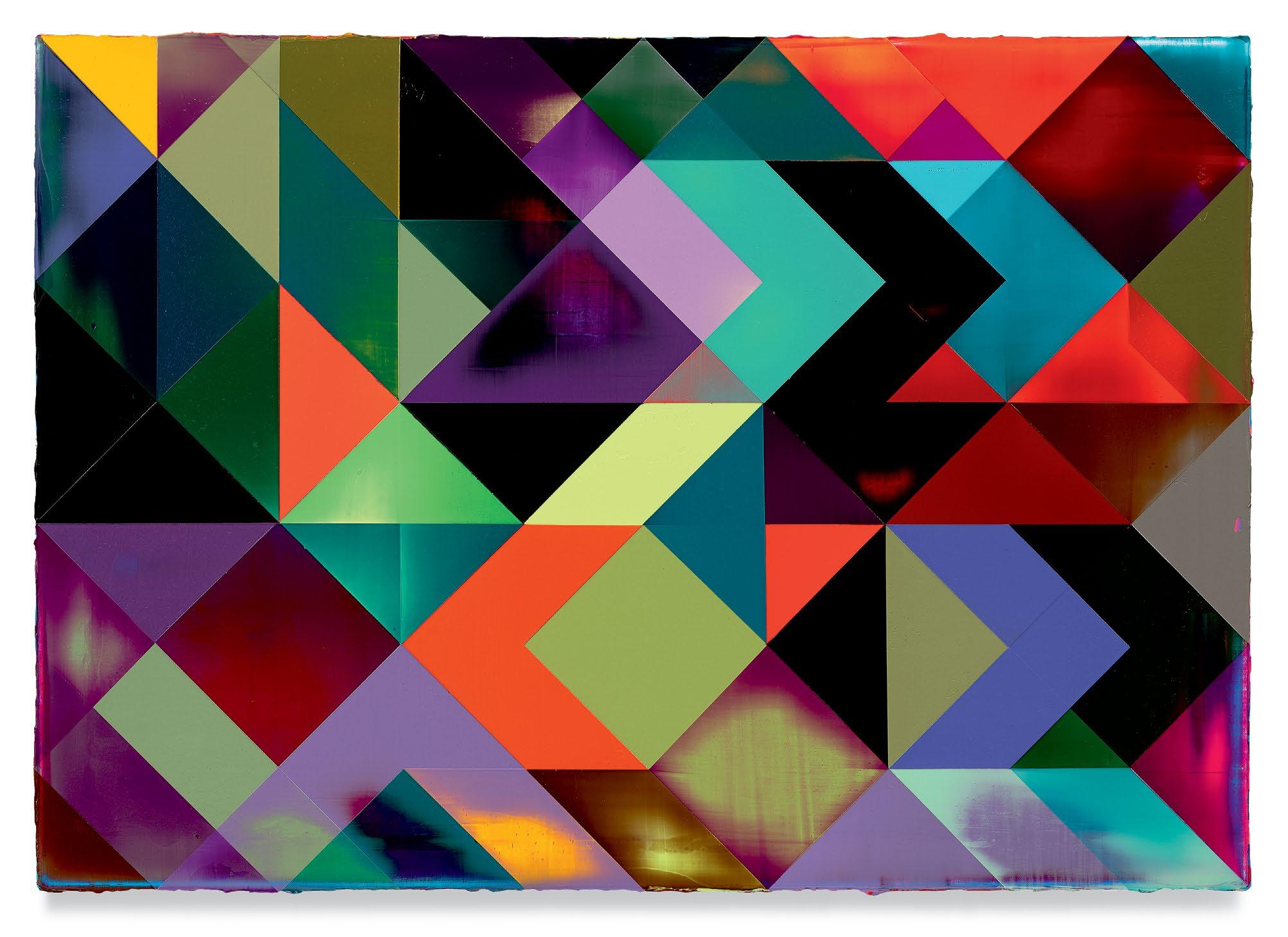 Such language can also be lifted to address Finley’s oeuvre. In the fractured picture plane of Aftermathematics, as well as the darker-toned Dragonaut and the vibrantly hued Mind Expander, angular shapes encounter each other, and shapes often transgress other shapes, occasionally meeting at pinpoint edges to fan out into kaleidoscopes. Each shape appears at once distinct and inextricable from