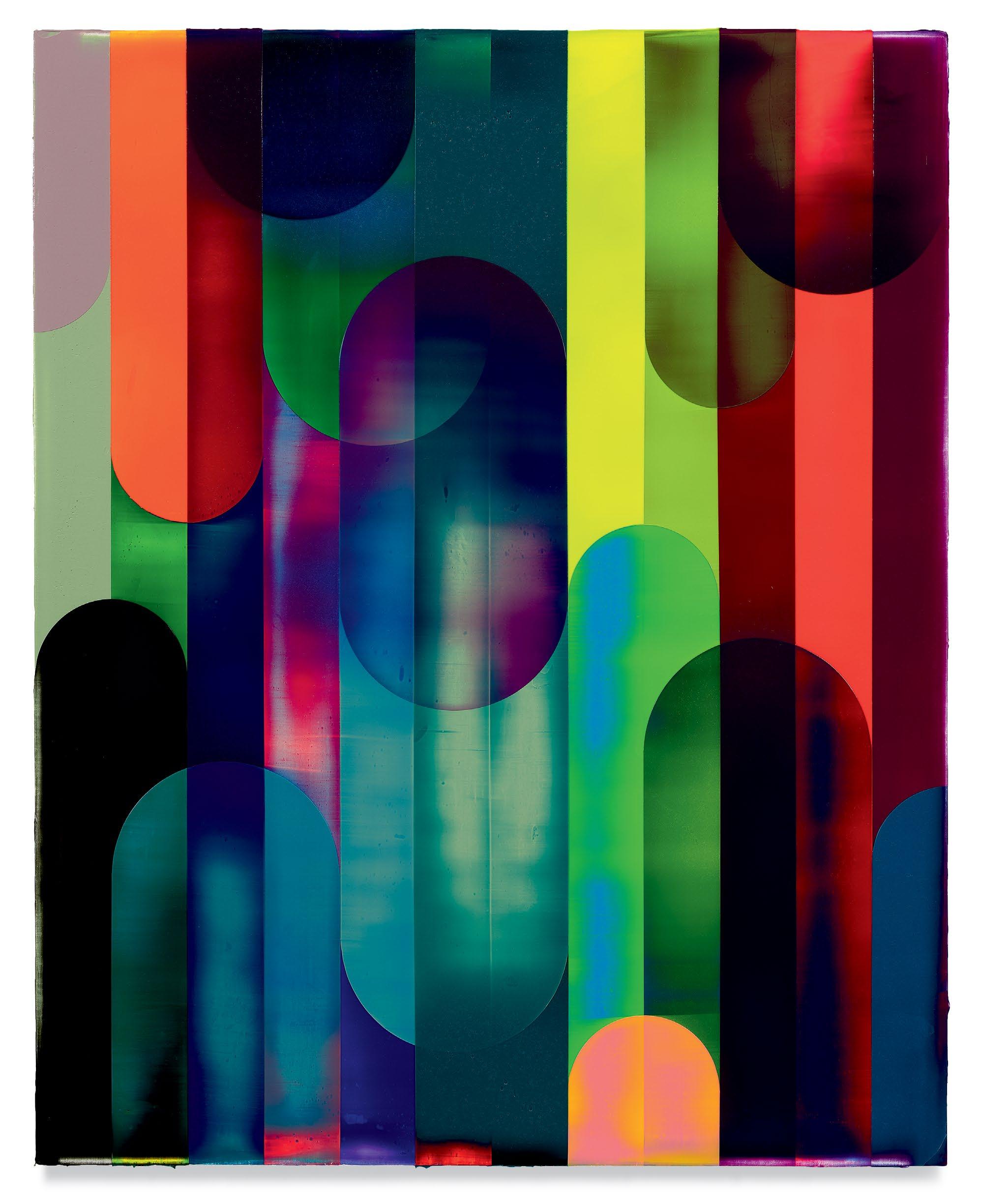 then back to the digital again, with a photograph of the painting that he manipulates to test out next steps in altering the shapes and colors. Until the painting is finished, every aspect of its constellation could change, and this sense of shifting motion remains palpable in the work. His process also drives a relationship between form and color that oscillates between confrontation and symbiosis. A circle is bisected by the side of a triangle in the top left of the composition; its top half is almost magenta, and its bottom is a rusty blue. Another circle hovering at the top of the picture plane toward the center of the composition is split into hemispheres: a bright, gradated green atop an orangey yellow. The painting invites you to focus in on details like these then step back again to take in the whole. It’s like a puzzle, in that each shape seems to have secured its spot within the whole, in a piecing together that has an almost tactical quality. More game metaphors: think of it like dominos (slide one shape out and the whole thing tumbles).